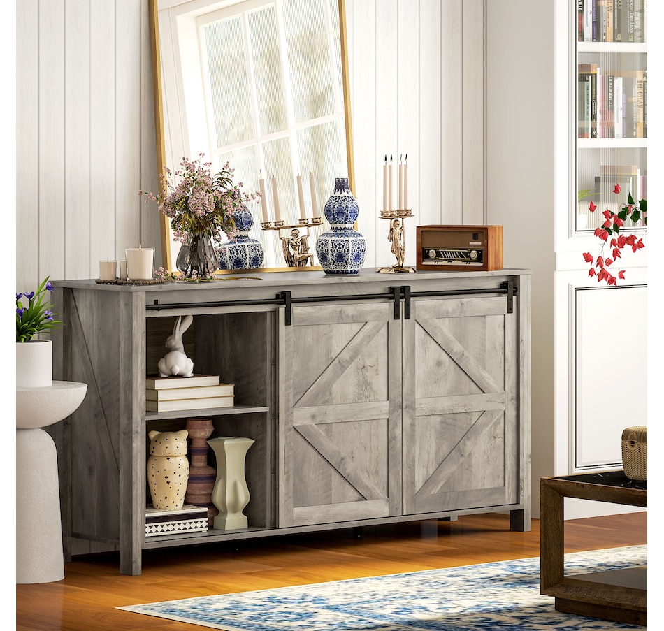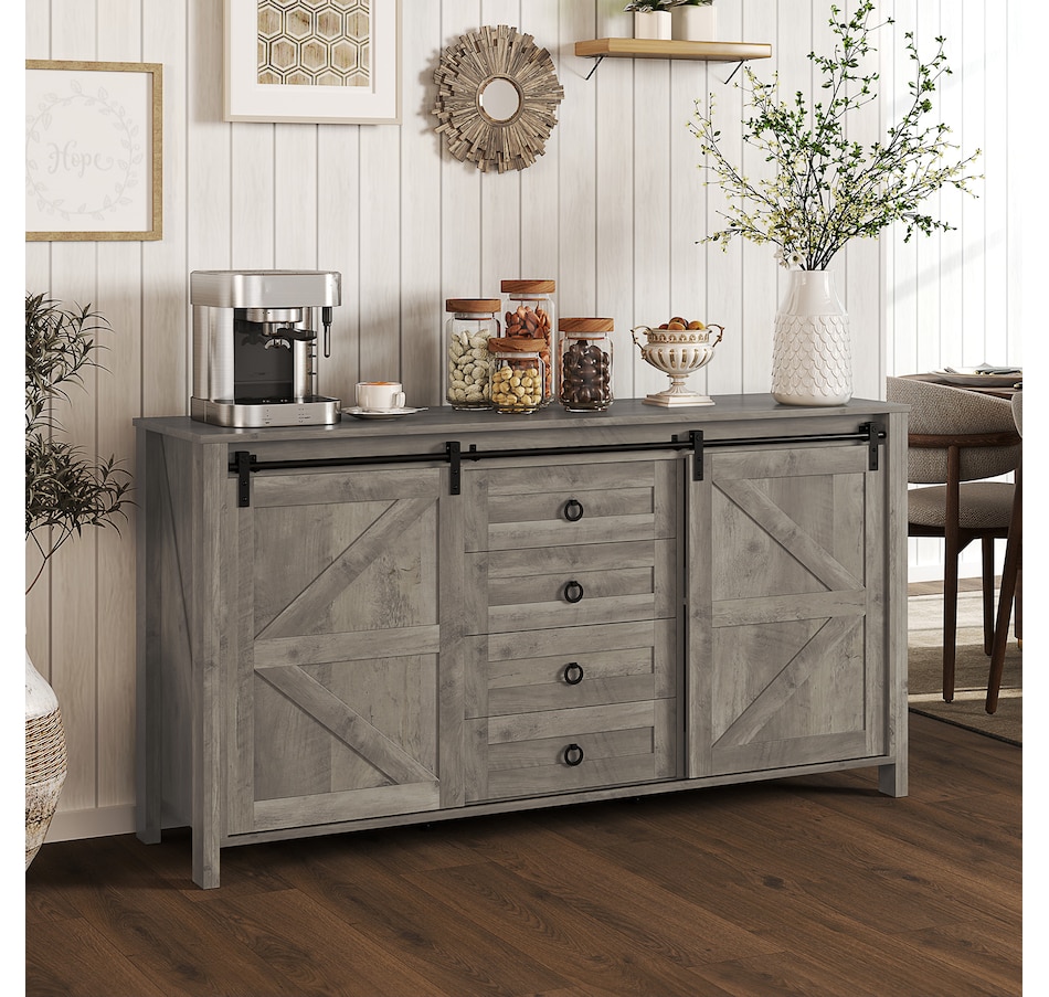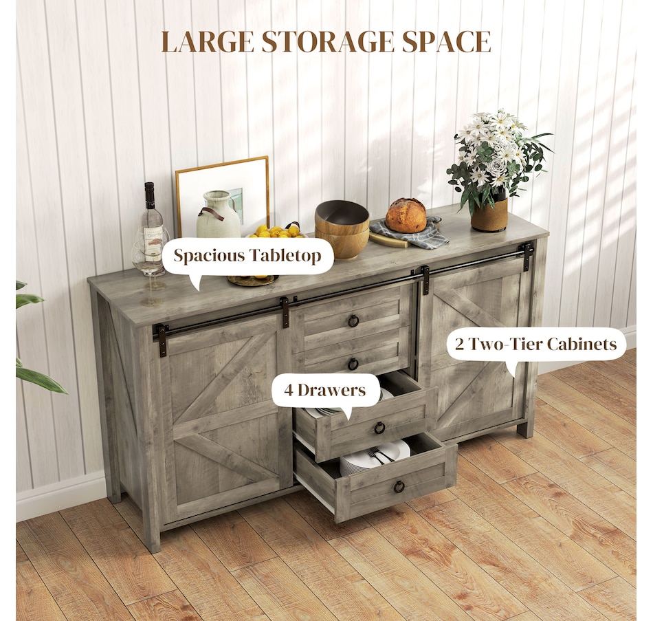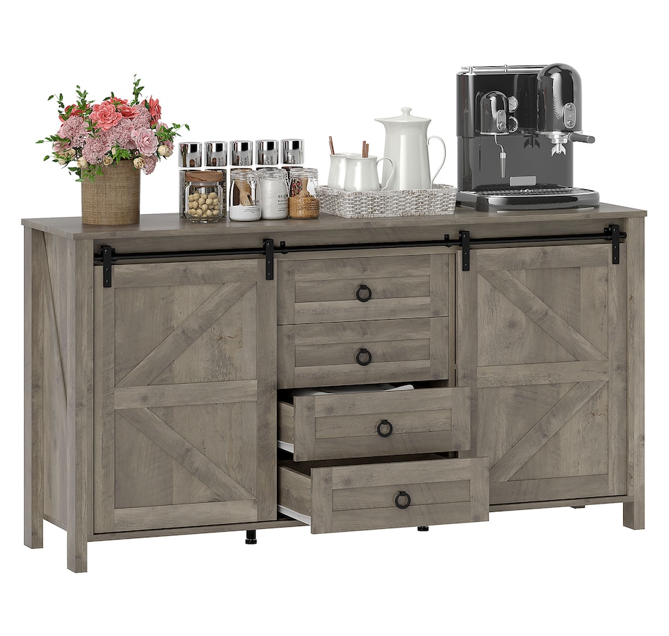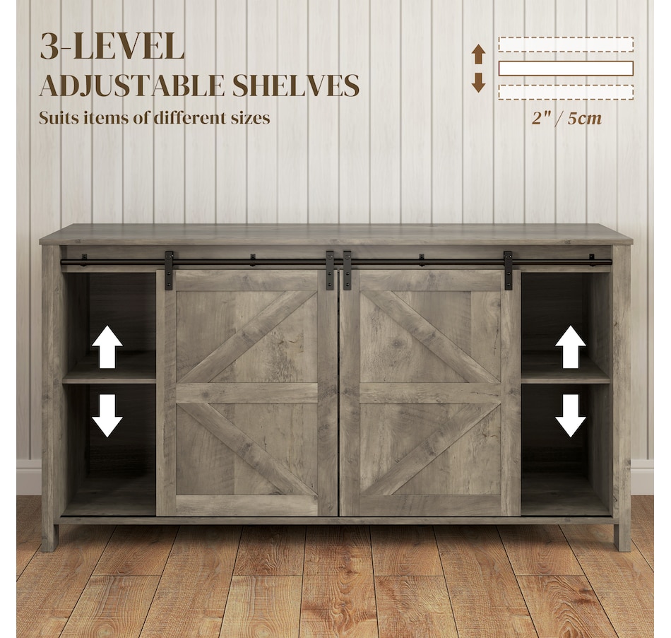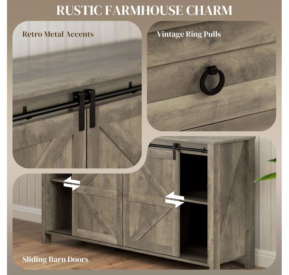 Say goodbye to clutter and hello to organized elegance. Our farmhouse buffet cabinet from HOMCOM with classic barn doors and retro metal accents is designed to infuse rustic charm into your home. Whether you're organizing your kitchen, creating a stylish coffee bar, or adding charm to your entryway, our storage cabinet with doors is a great addition to any space. Keep your dining essentials neatly organized today through this HOMCOM sideboard with spacious and functional storage.