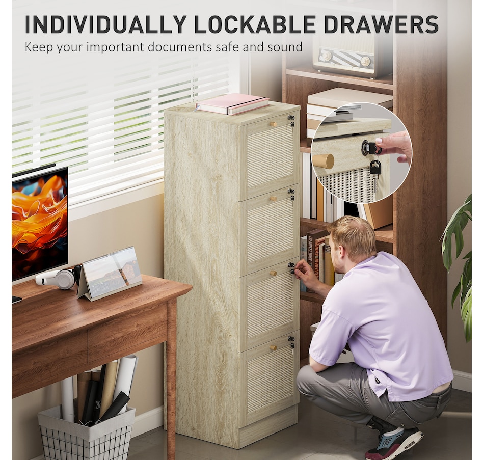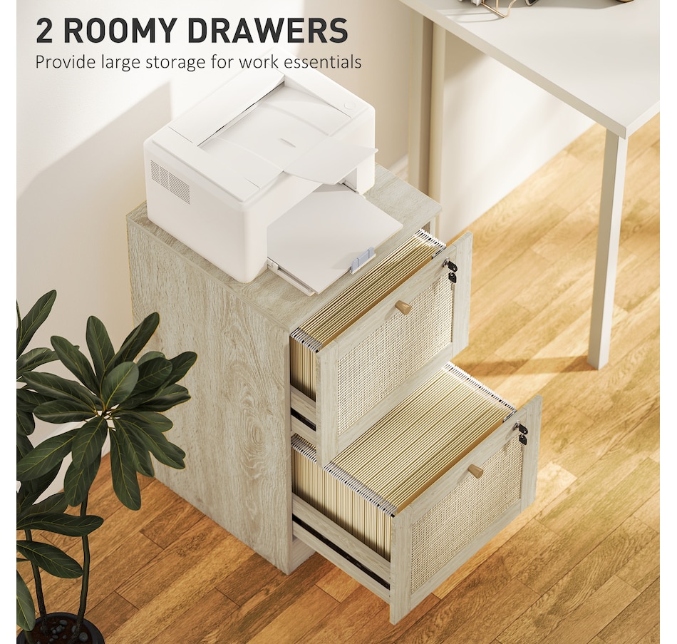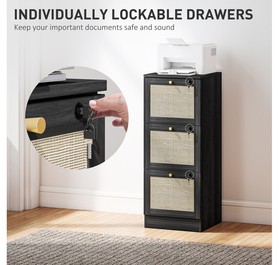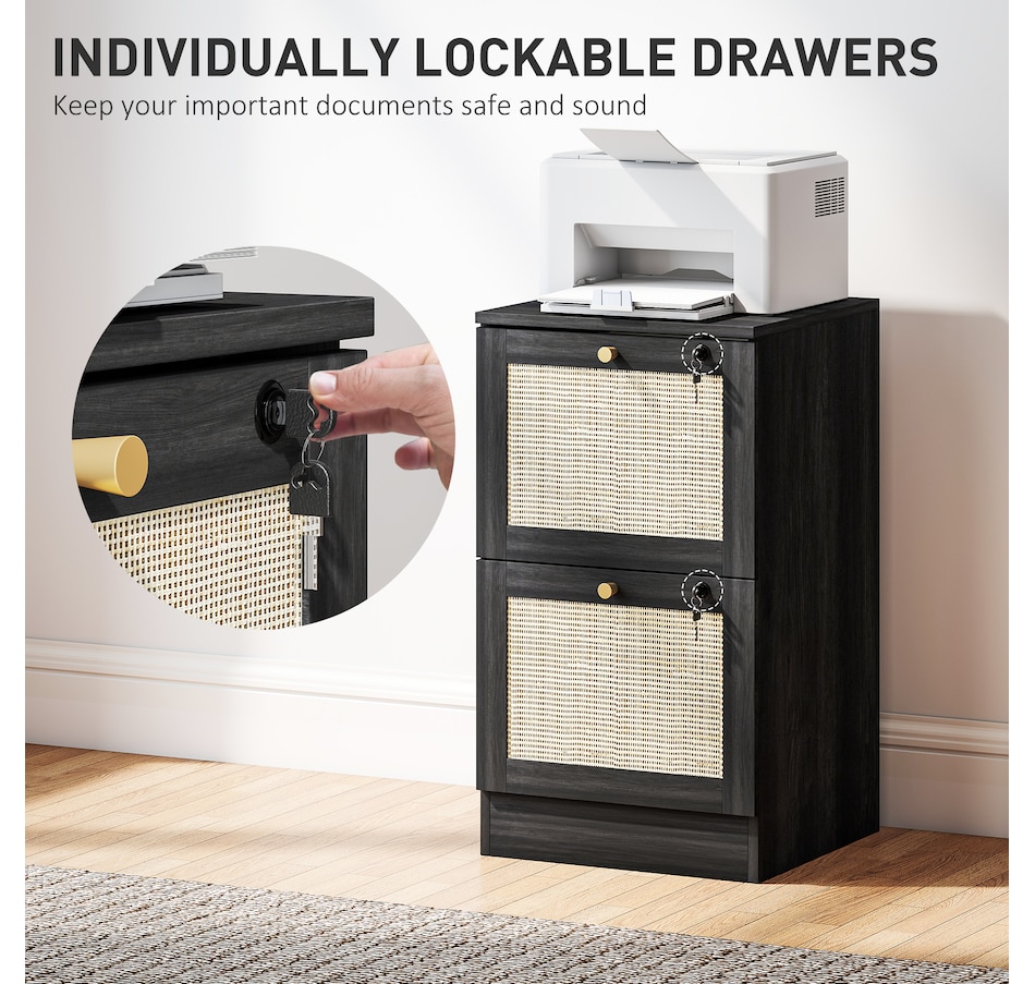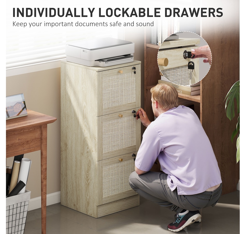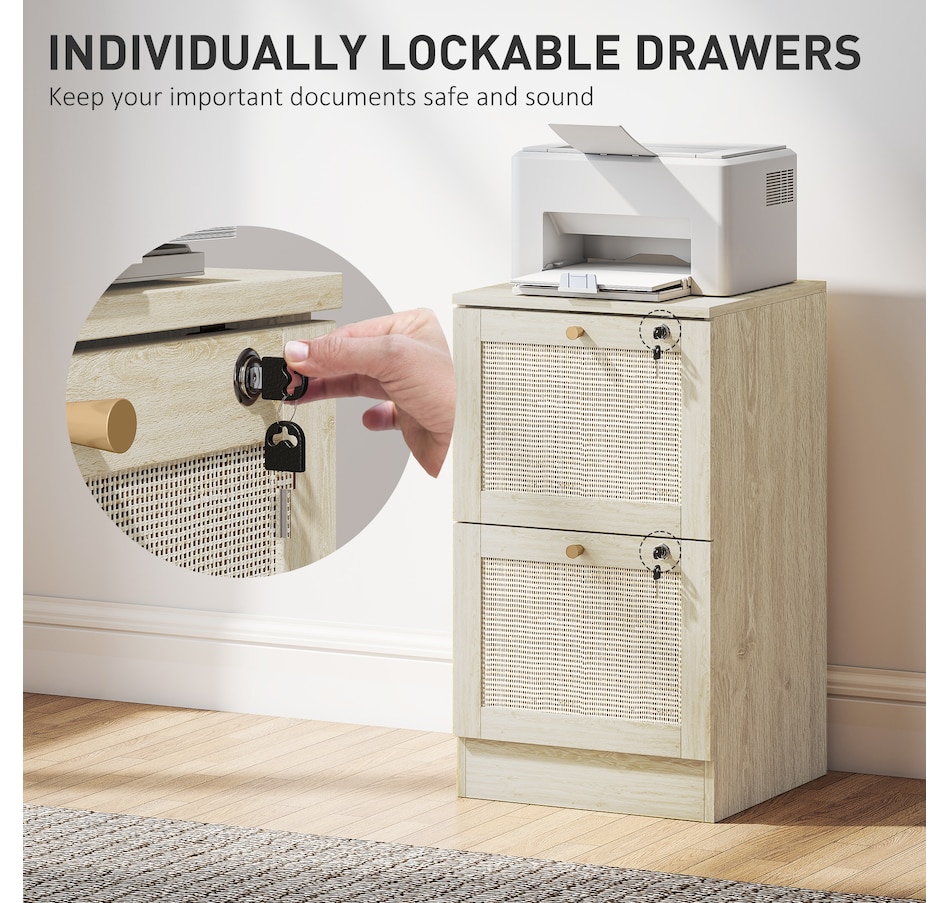 Transform your workspace with the file cabinet from HOMCOM, where natural rattan accents and wood grain finish create a bohemian charm. Imagine the peace of mind as each drawer locks securely, safeguarding your documents and enhancing your sense of security. With adjustable metal rods, this HOMCOM filing cabinet accommodates both A4 and letter-size files, streamlining your office routine and elevating your organizational efficiency.Features: