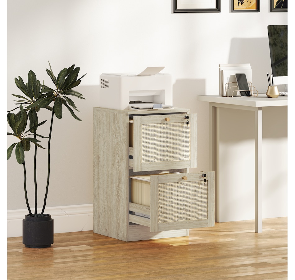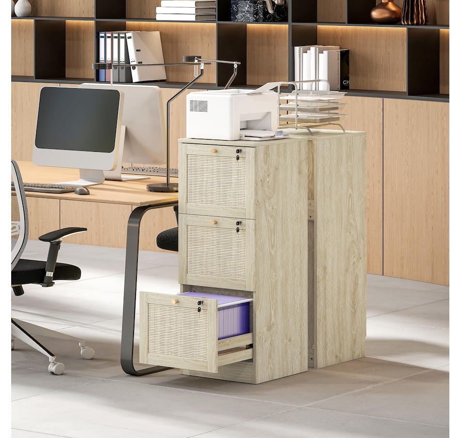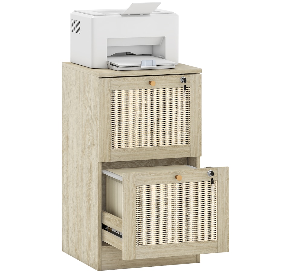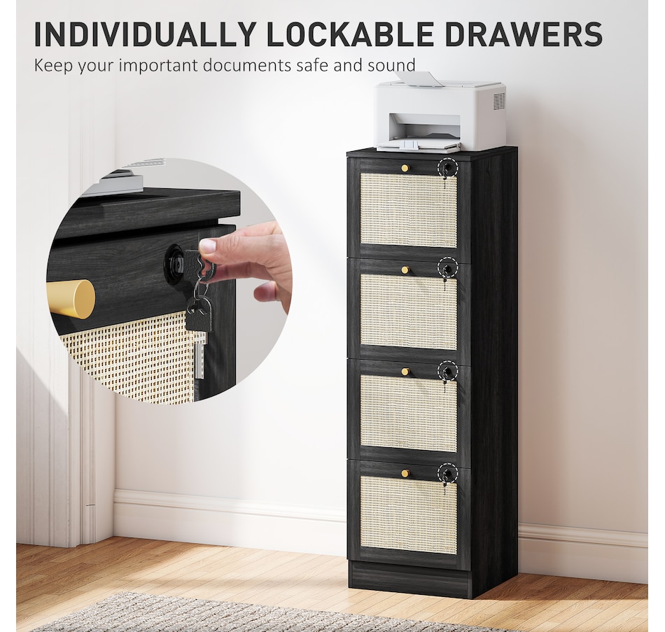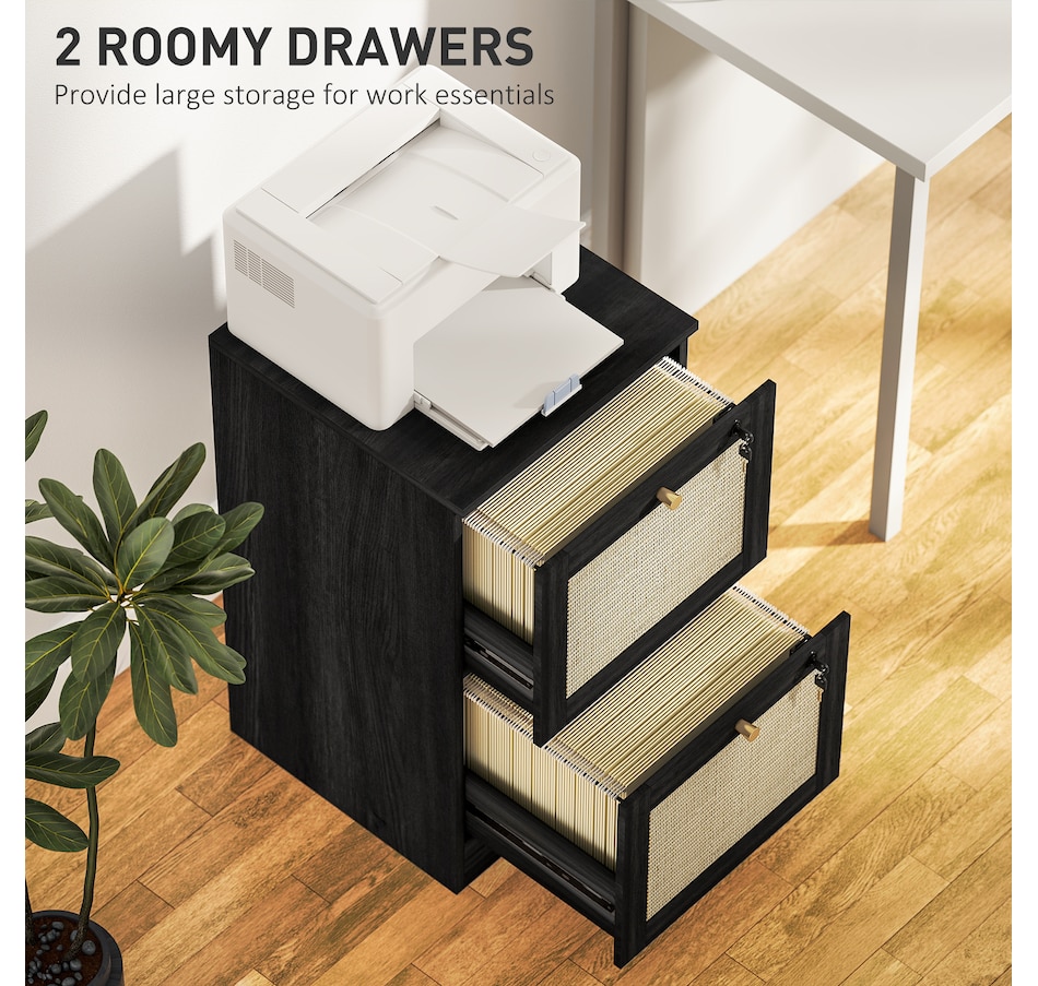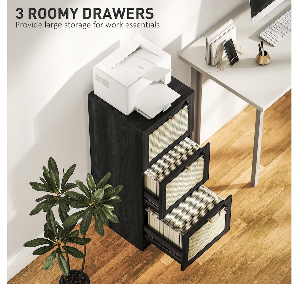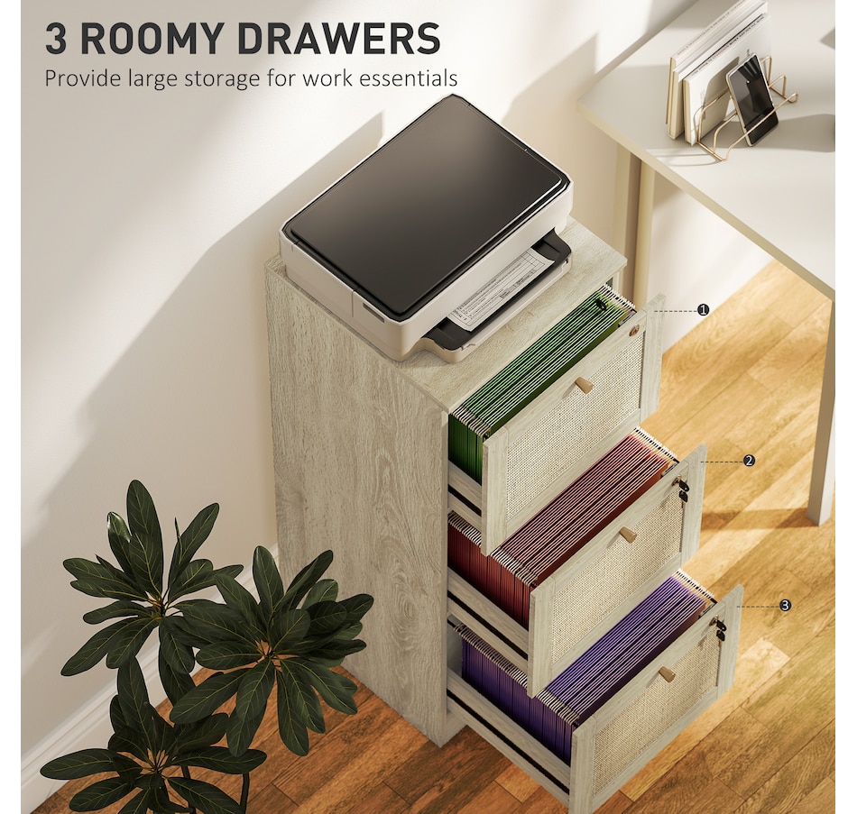 Transform your workspace with the file cabinet from HOMCOM, where natural rattan accents and wood grain finish create a bohemian charm. Imagine the peace of mind as each drawer locks securely, safeguarding your documents and enhancing your sense of security. With adjustable metal rods, this HOMCOM filing cabinet accommodates both A4 and letter-size files, streamlining your office routine and elevating your organizational efficiency.Features: