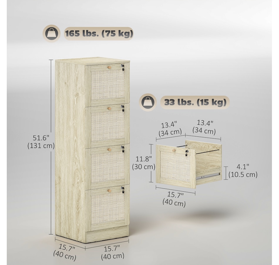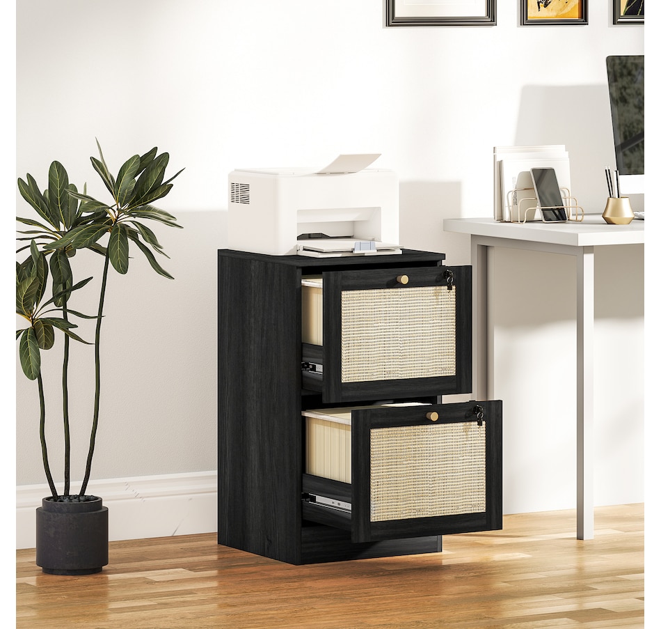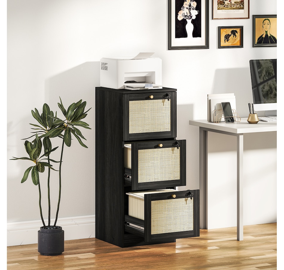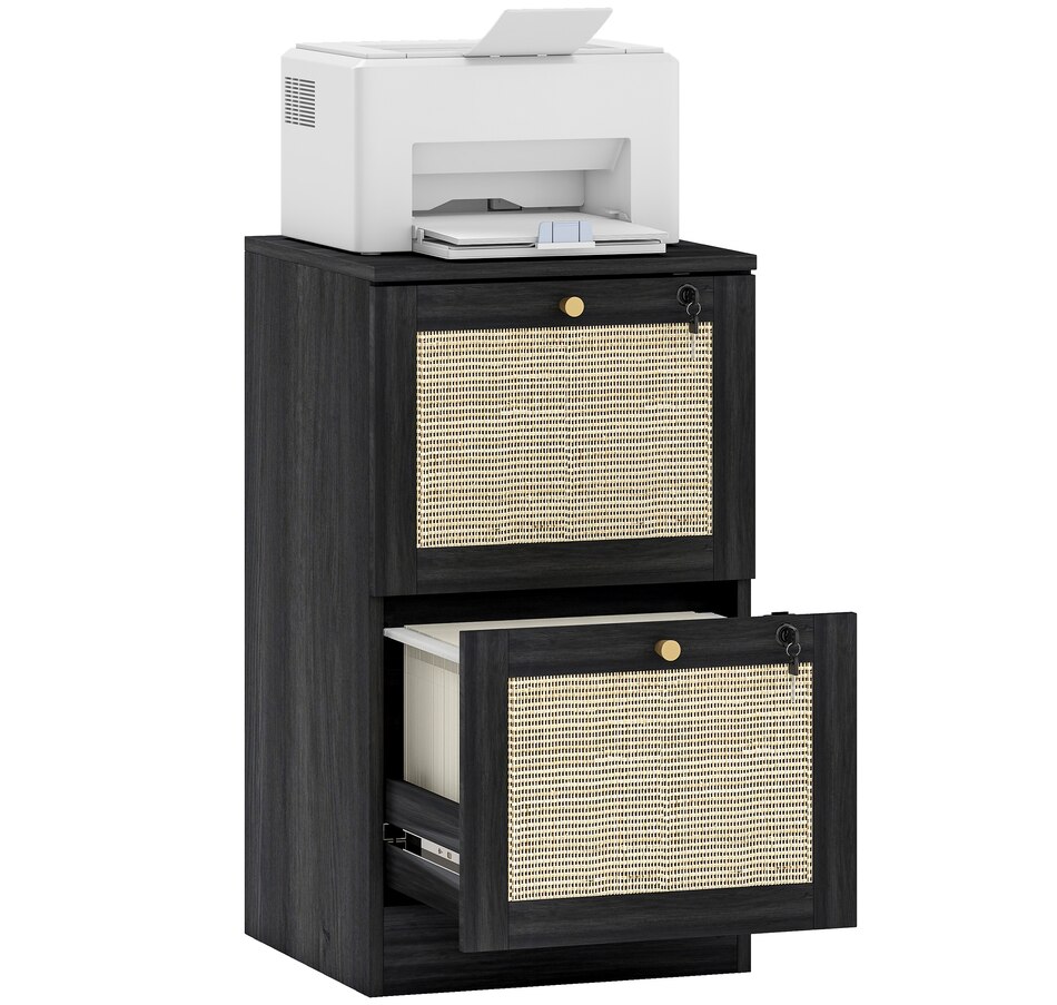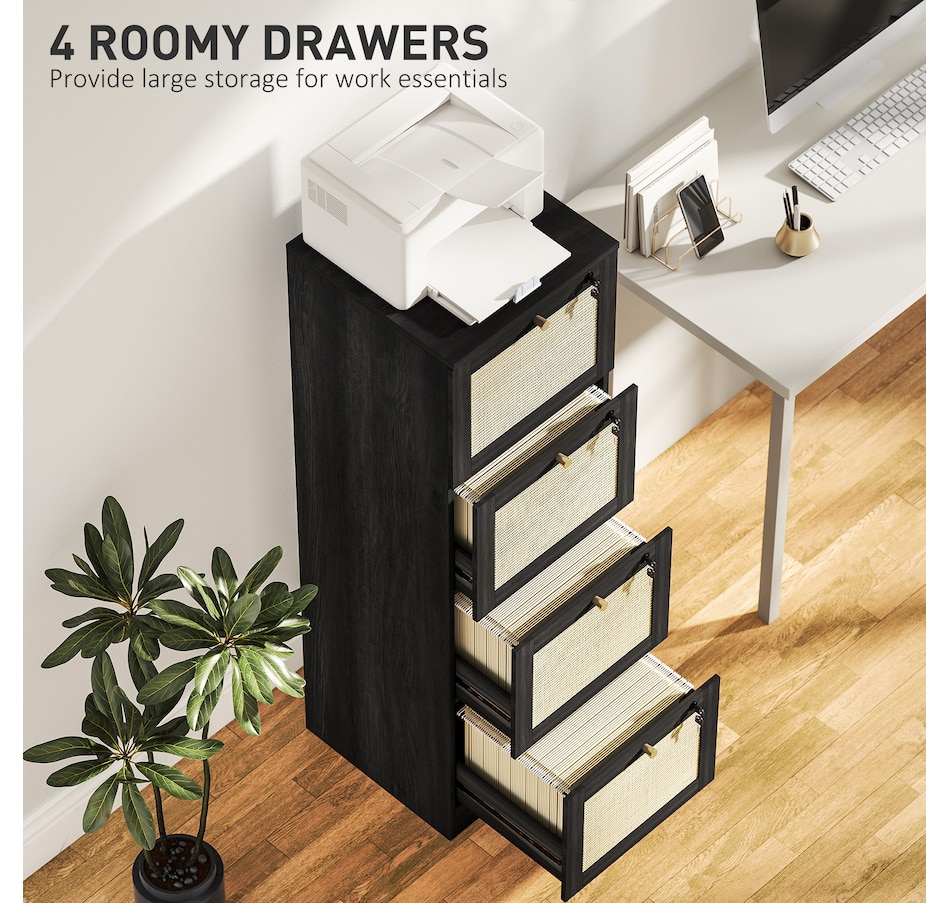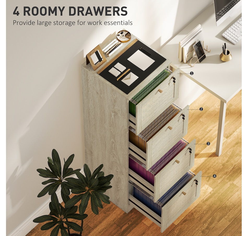 Transform your workspace with the file cabinet from HOMCOM, where natural rattan accents and wood grain finish create a bohemian charm. Imagine the peace of mind as each drawer locks securely, safeguarding your documents and enhancing your sense of security. With adjustable metal rods, this HOMCOM filing cabinet accommodates both A4 and letter-size files, streamlining your office routine and elevating your organizational efficiency.Features: