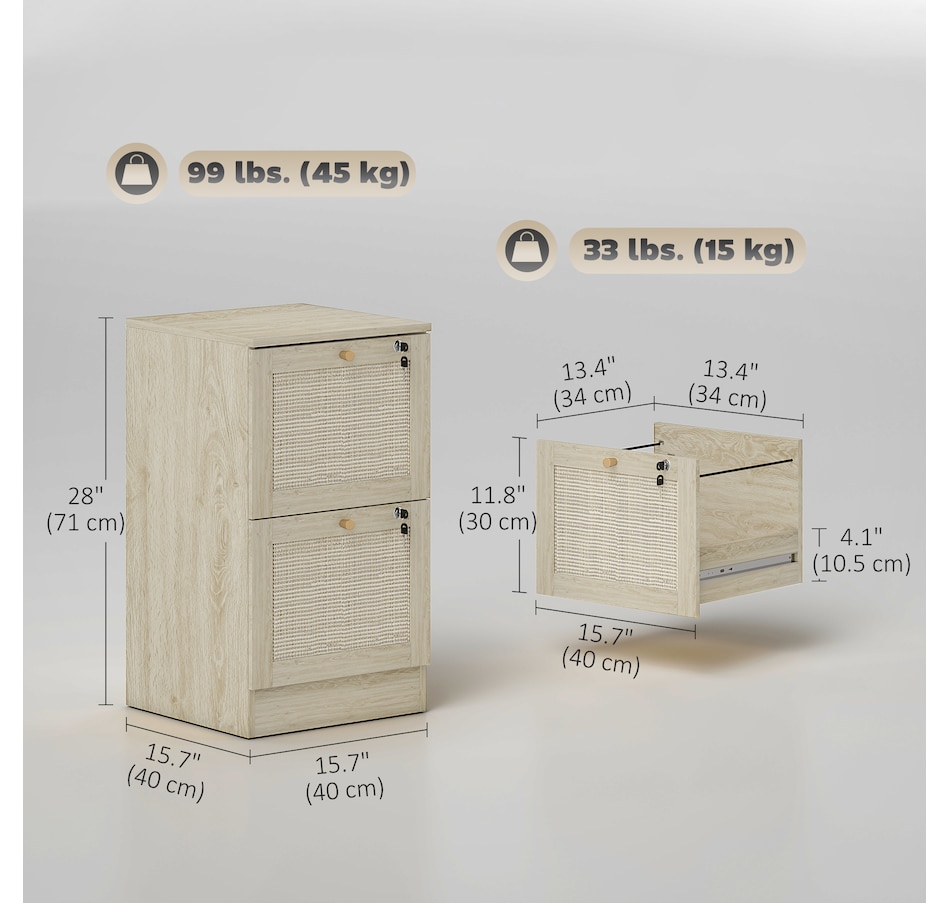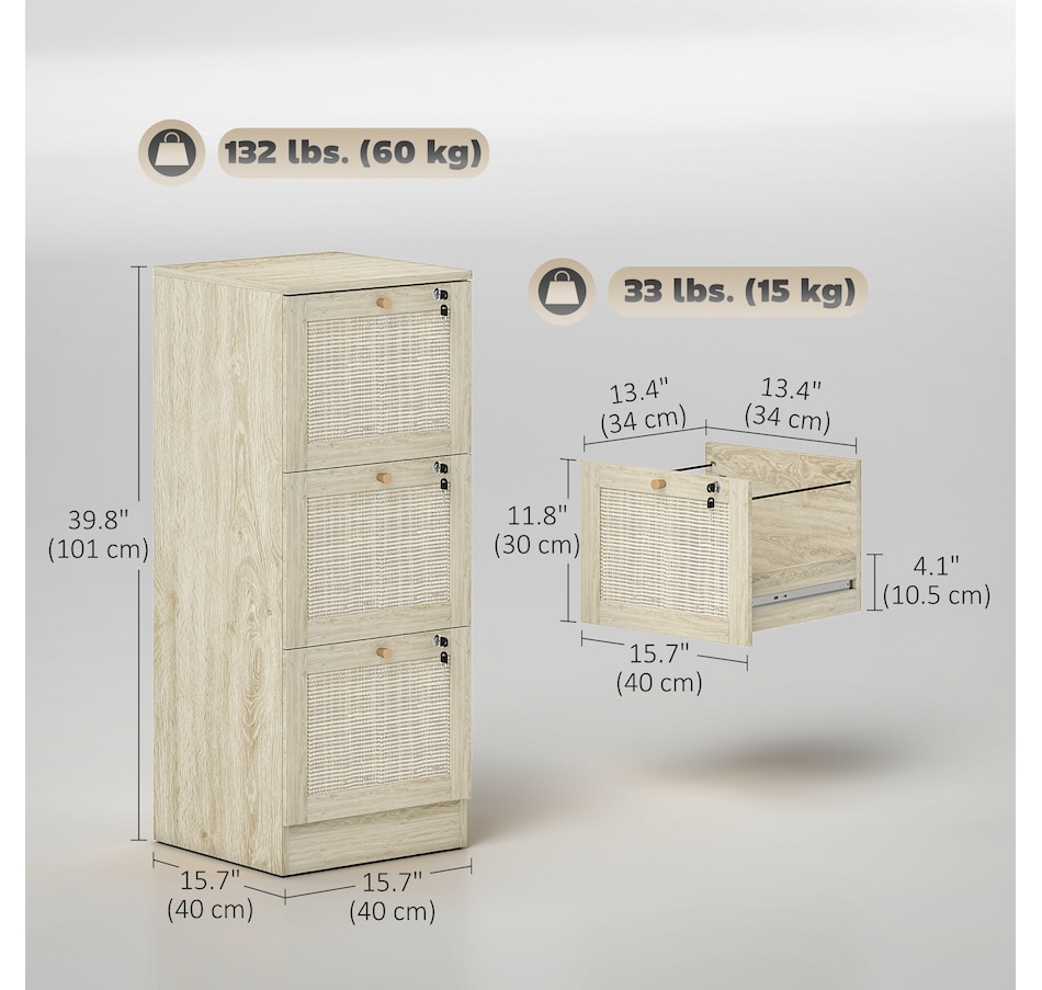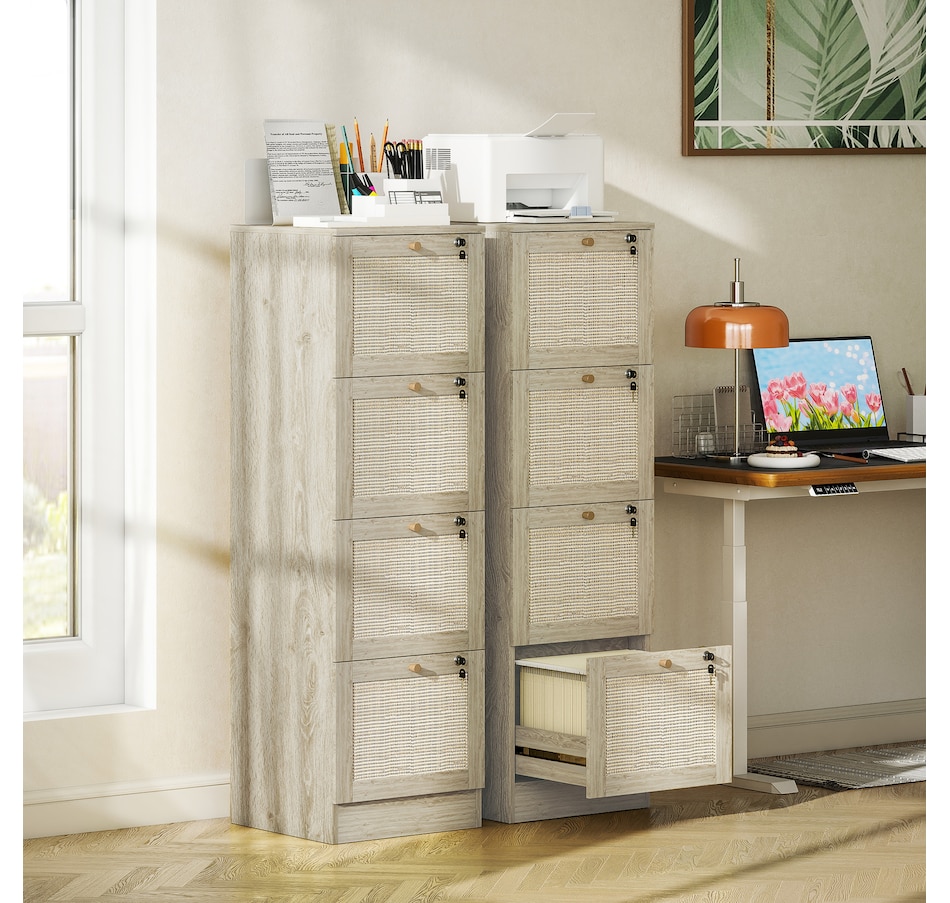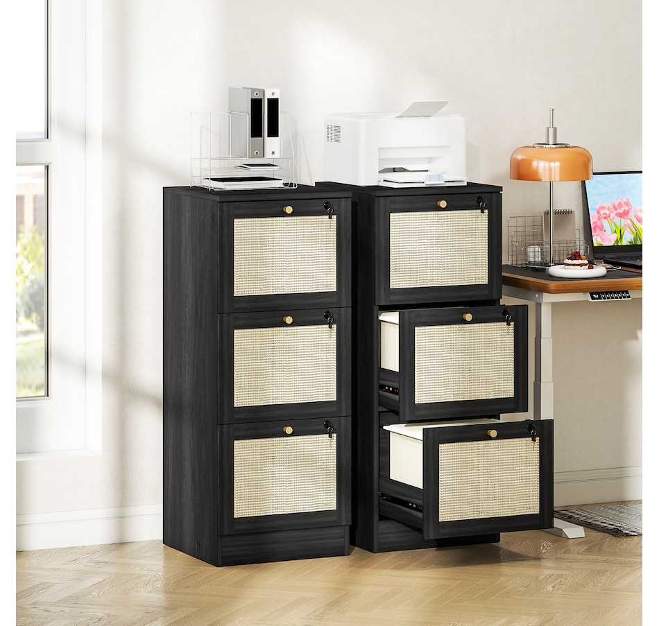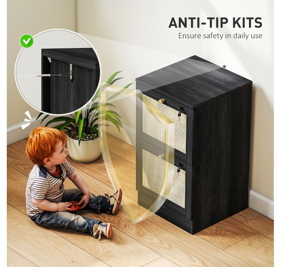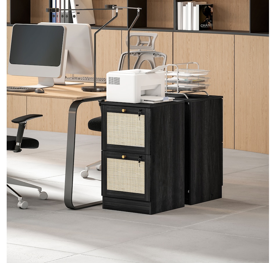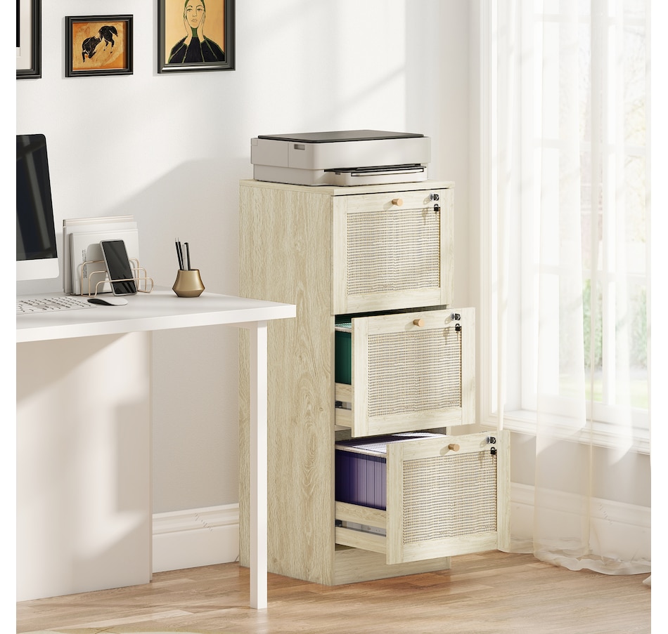 Transform your workspace with the file cabinet from HOMCOM, where natural rattan accents and wood grain finish create a bohemian charm. Imagine the peace of mind as each drawer locks securely, safeguarding your documents and enhancing your sense of security. With adjustable metal rods, this HOMCOM filing cabinet accommodates both A4 and letter-size files, streamlining your office routine and elevating your organizational efficiency.Features:
