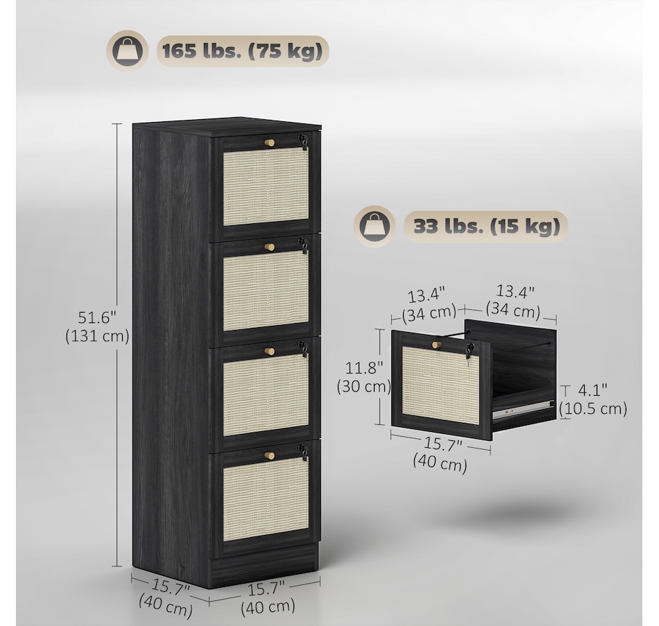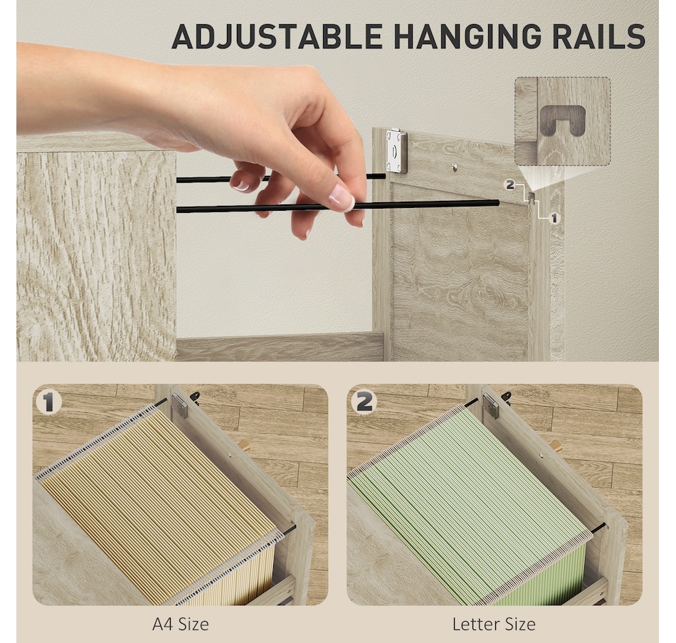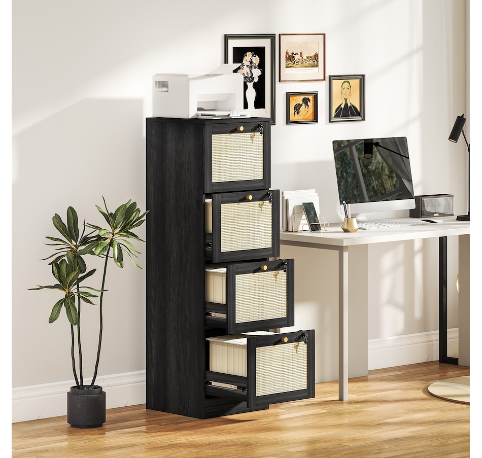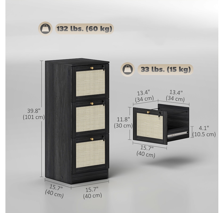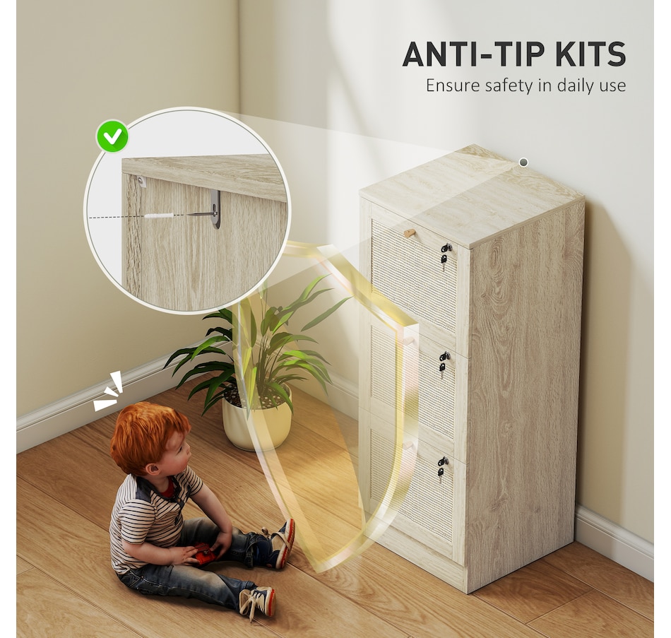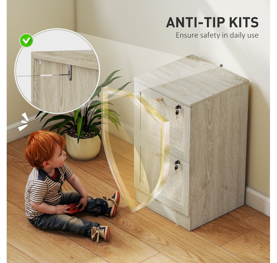 Transform your workspace with the file cabinet from HOMCOM, where natural rattan accents and wood grain finish create a bohemian charm. Imagine the peace of mind as each drawer locks securely, safeguarding your documents and enhancing your sense of security. With adjustable metal rods, this HOMCOM filing cabinet accommodates both A4 and letter-size files, streamlining your office routine and elevating your organizational efficiency.Features:
