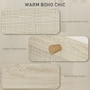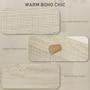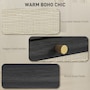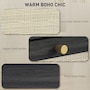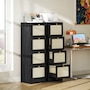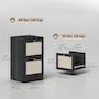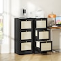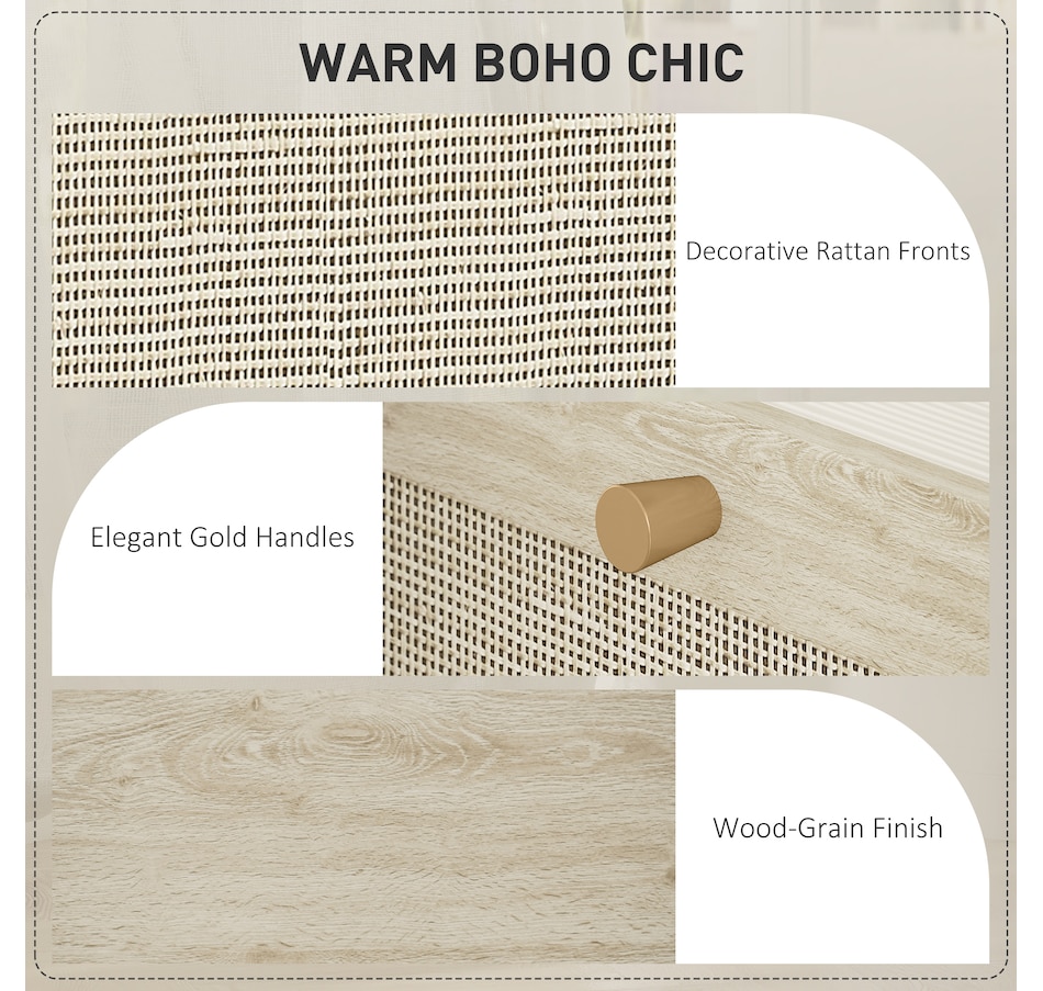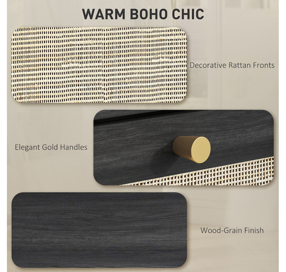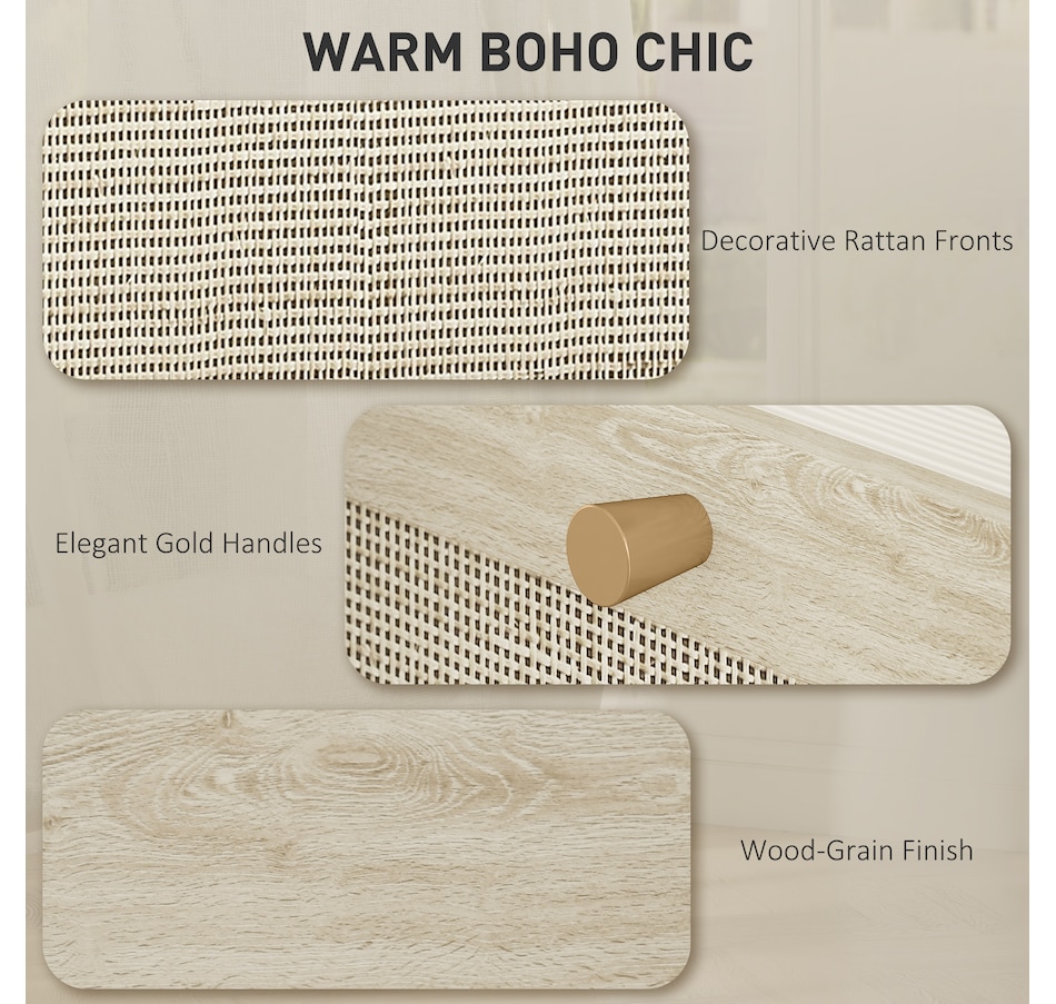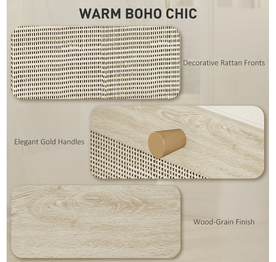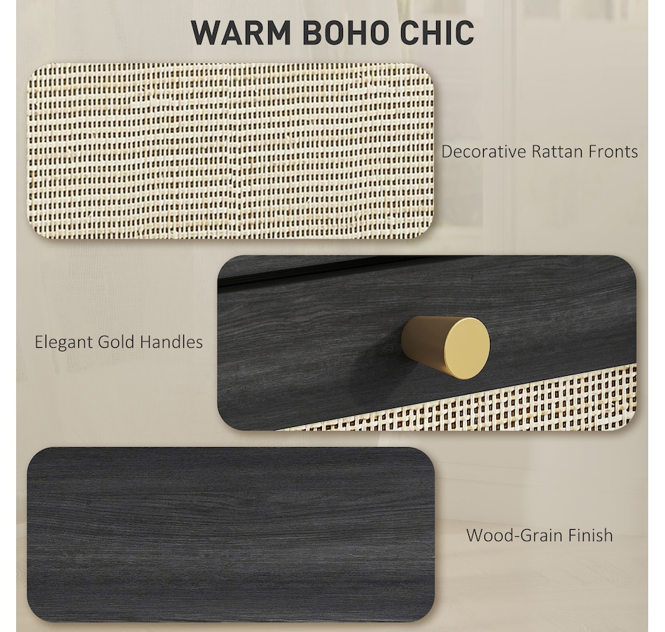● Natural rattan drawer fronts and wood grain finish create boho style accent;