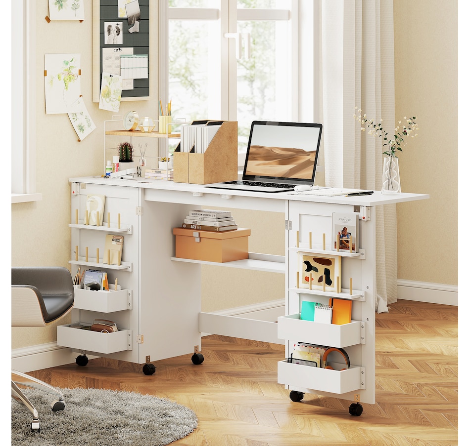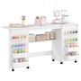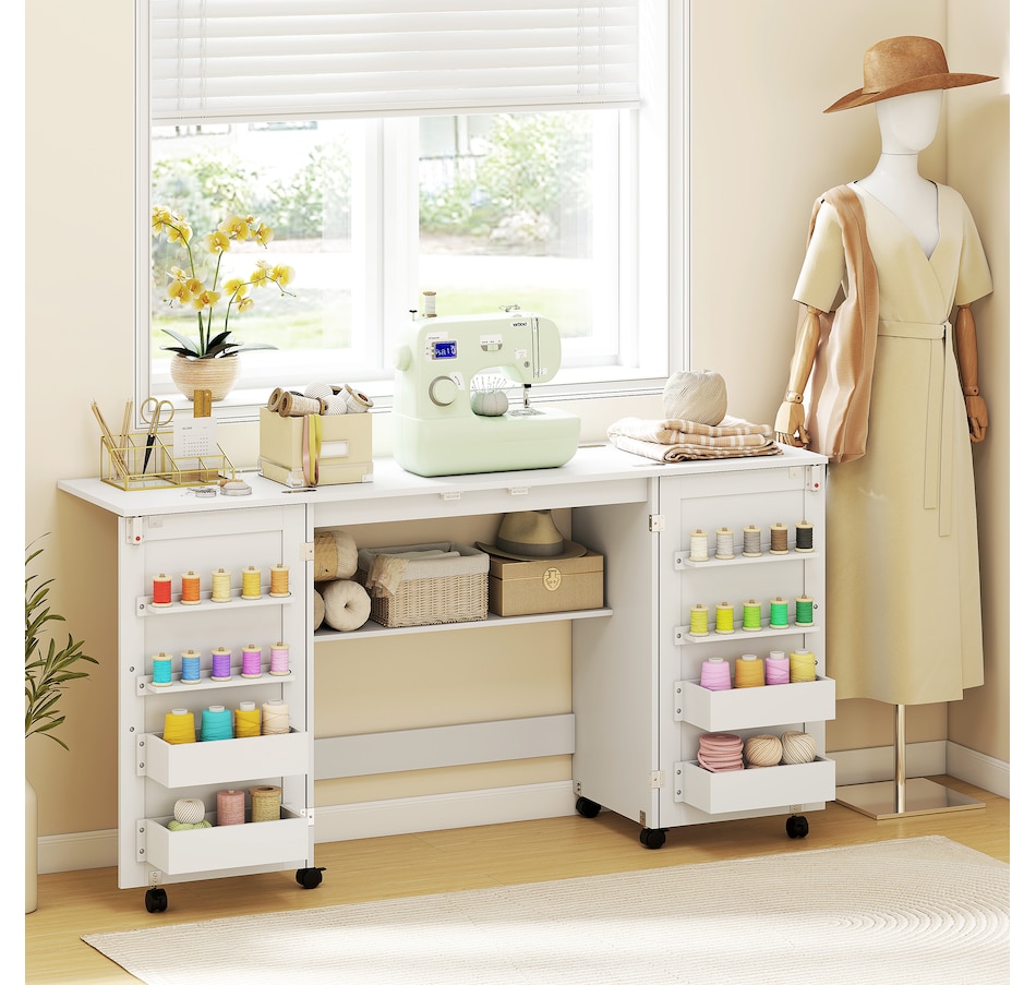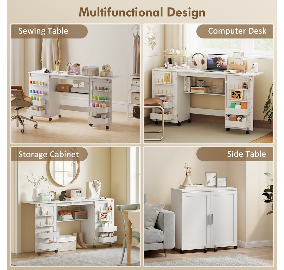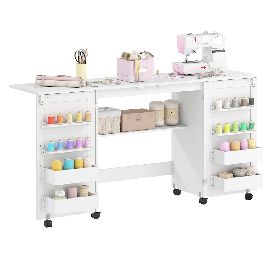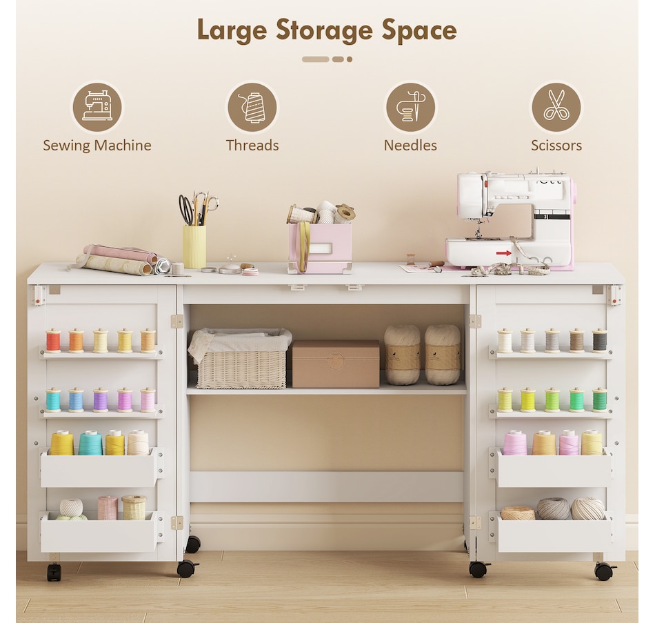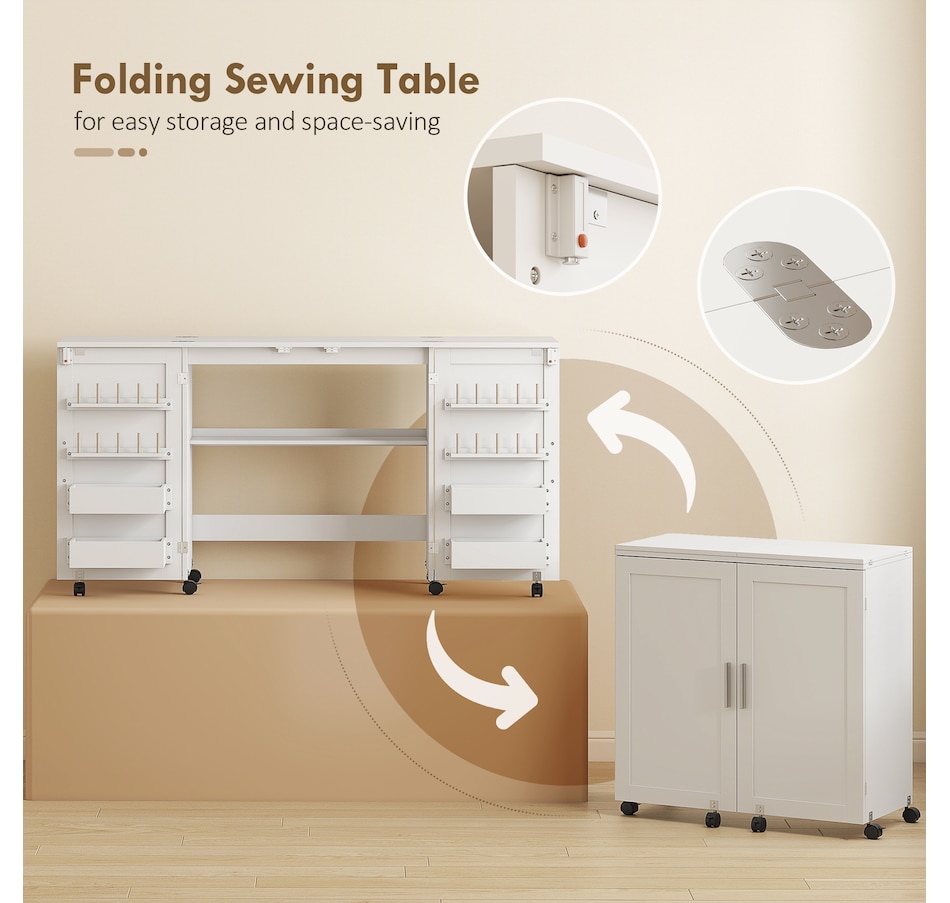 Folding Sewing Table with 2 Magnetic Doors Mobile Craft Table White