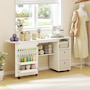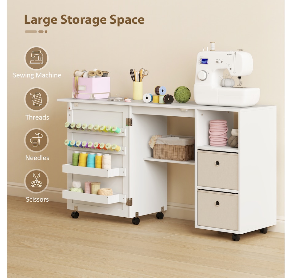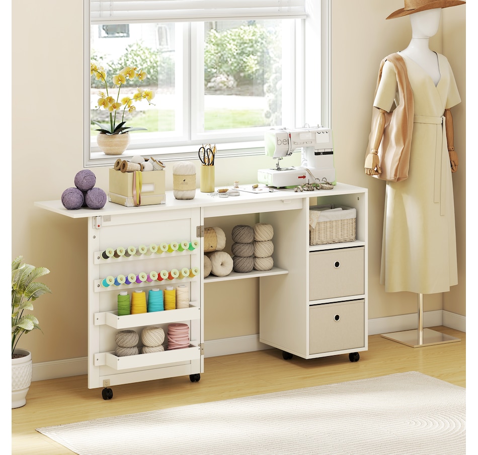 ● A lower shelf holds a sewing machine or extra crafting supplies;