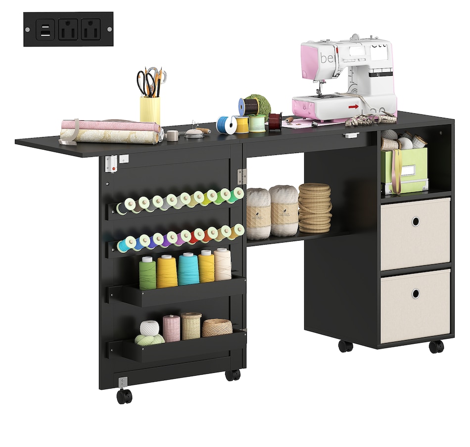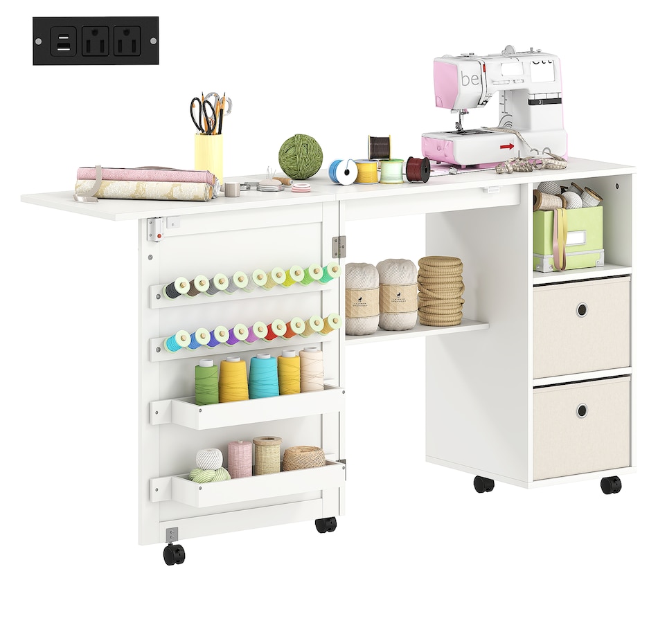 Folding Sewing Table with Power Outlet, Rolling Craft Table