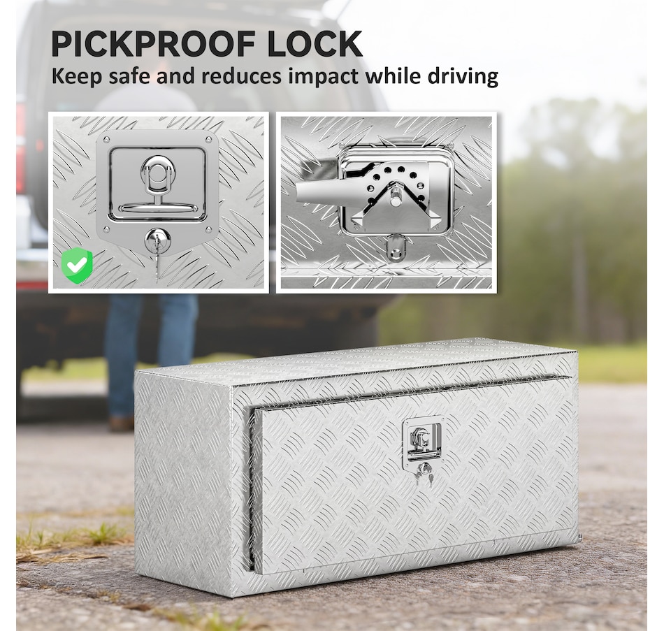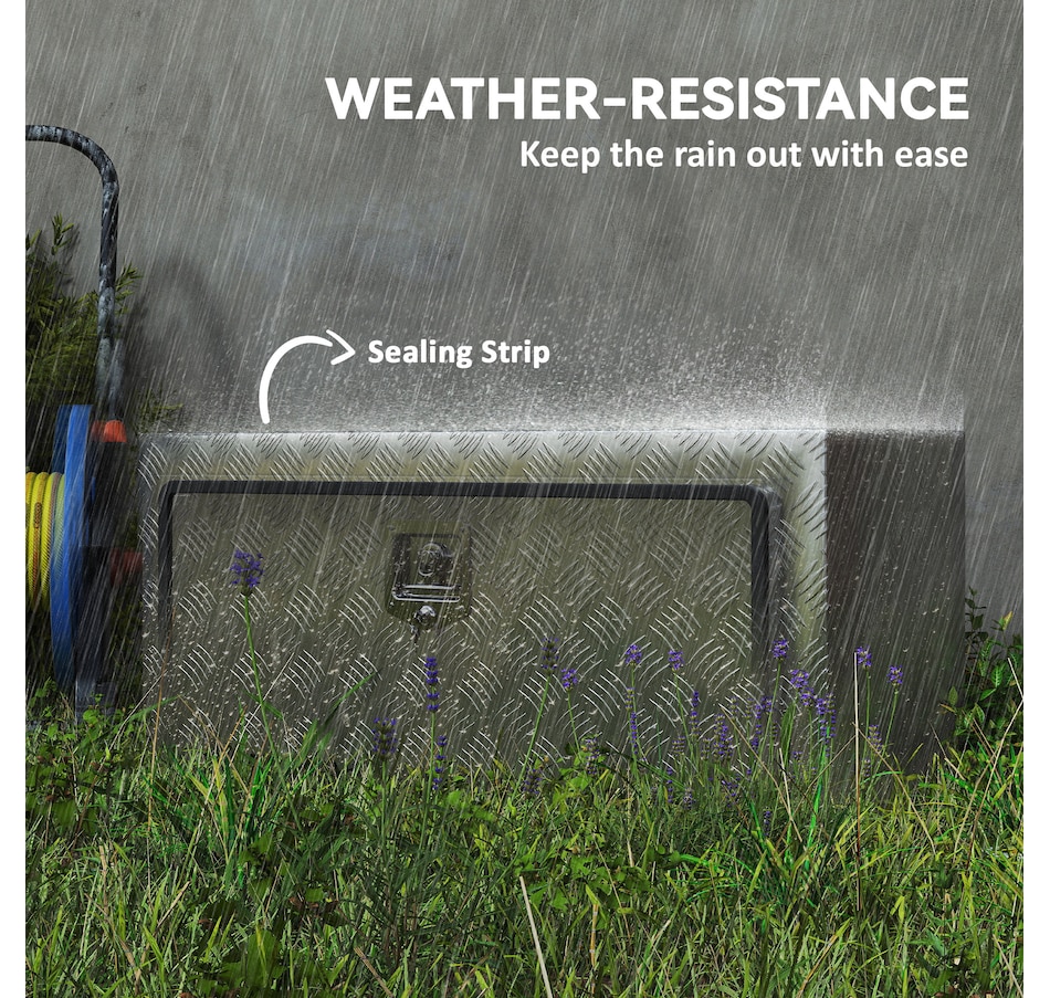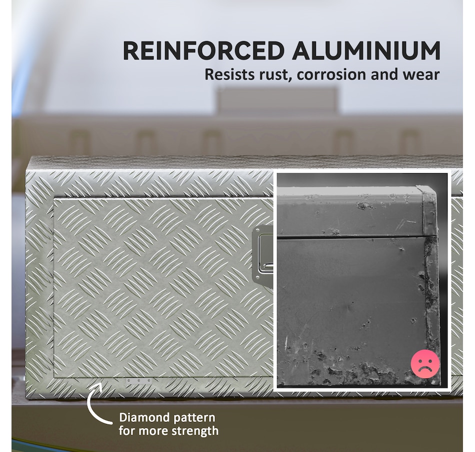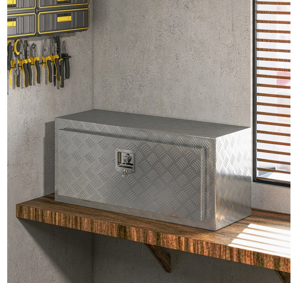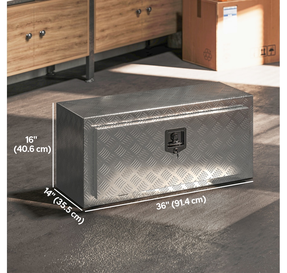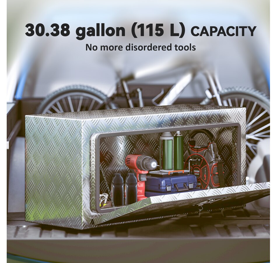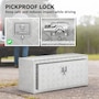 Looking for a reliable tool storage solution? This HOMCOM metal storage box is built from strong aluminum with a rust-resistant finish, keeping your tools safe in any weather. Its lock and tight-sealing lid protect against theft and moisture, while the 30.4 gal spacious interior fits buckets, power tools, and more. Lightweight yet strong, it's suitable for pickup trucks, trailers, RVs, garages, or job sites, keeping your gear organized and ready wherever you go.