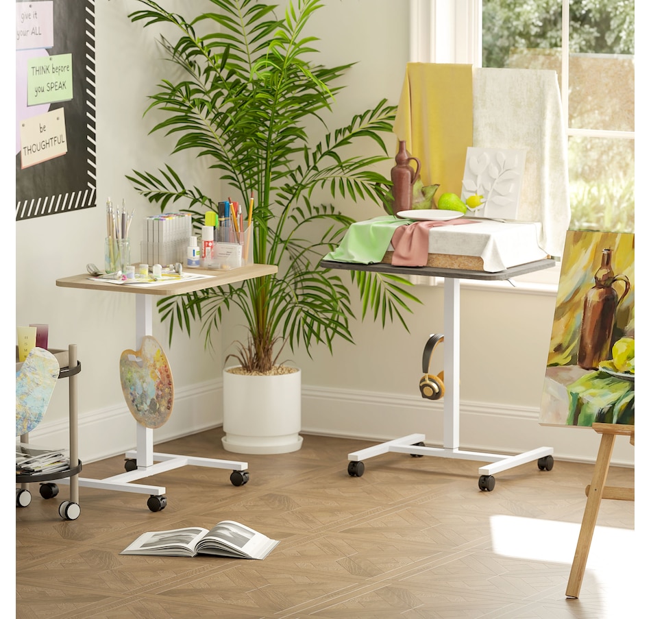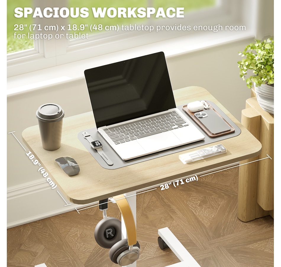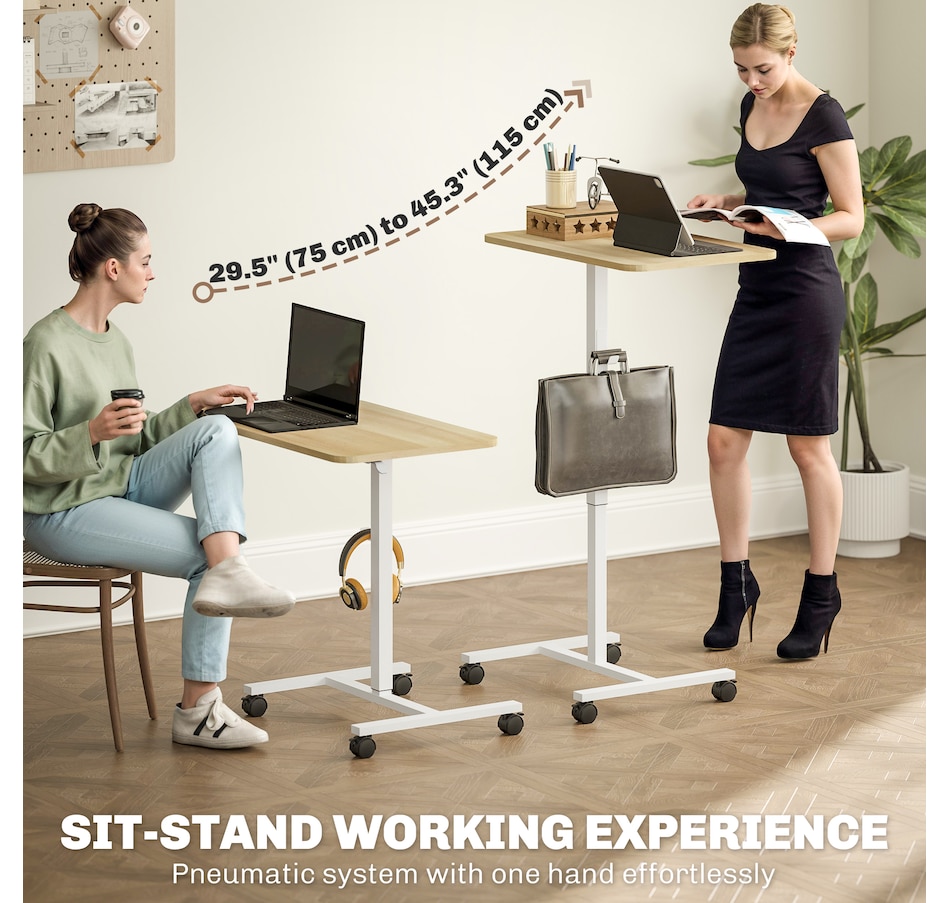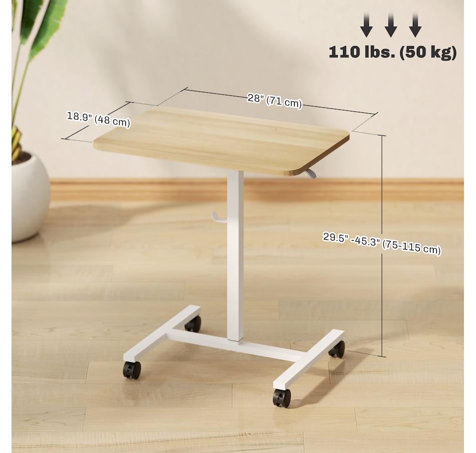 From sitting to standing, work comfortably with this HOMCOM small standing desk. The gas lift system smoothly adjusts the height between 29.5"–45.3", so you can set it to the level you prefer. The 28" x 18.9" tabletop offers space for a laptop, mouse, and coffee cup—everything you need for a focused work session. Four lockable wheels make it easy to move and stay securely in place.