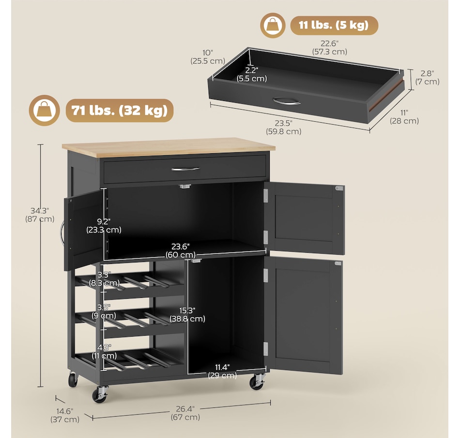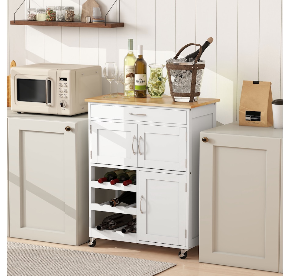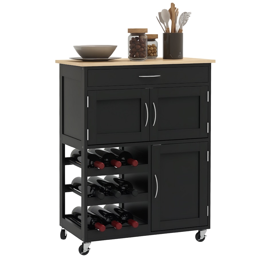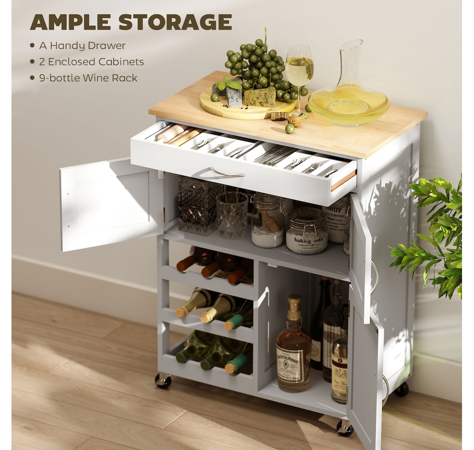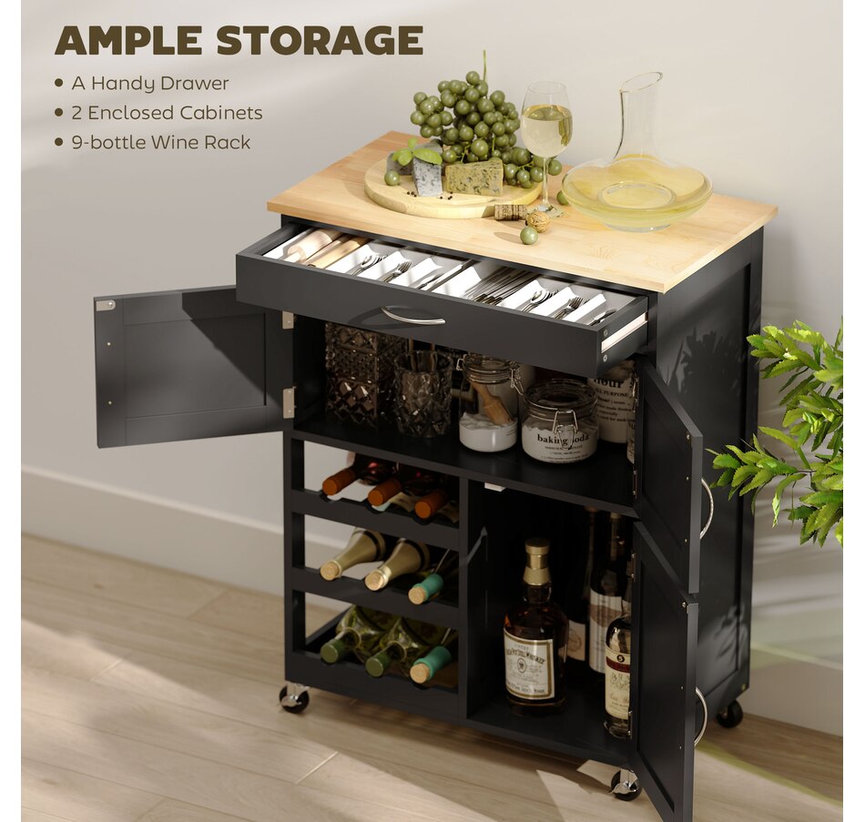 Kitchen Island on Wheels with Drawer, 9-bottle Wine Rack