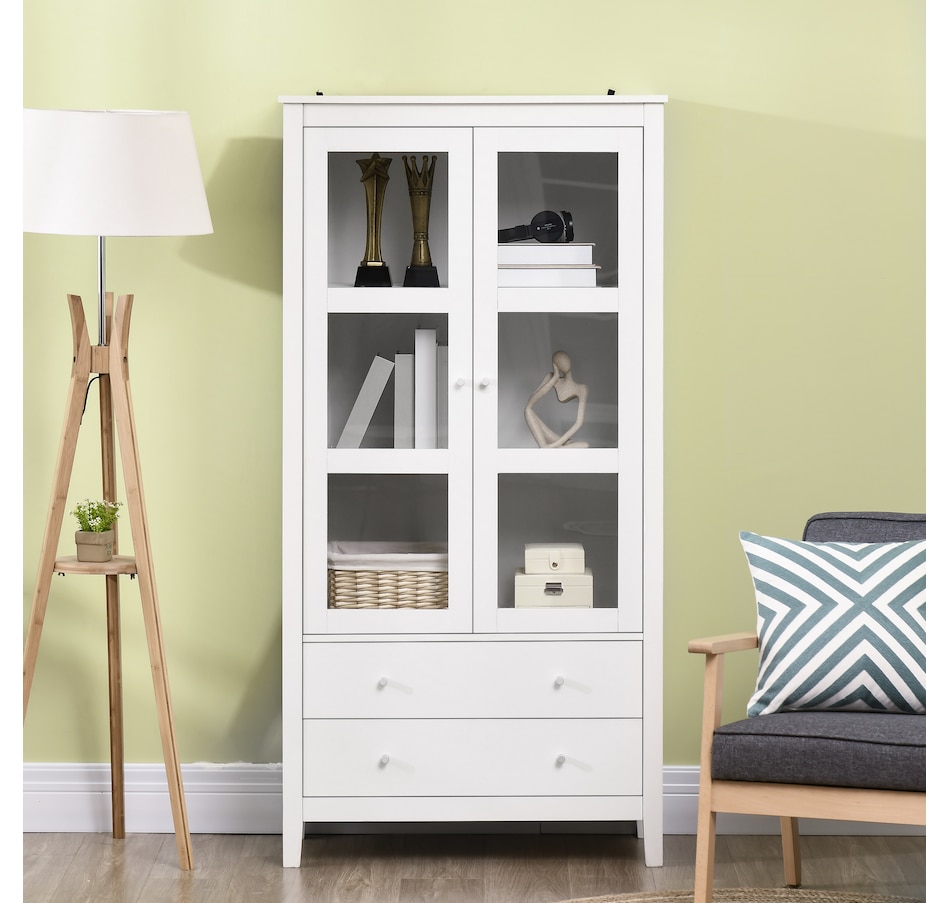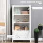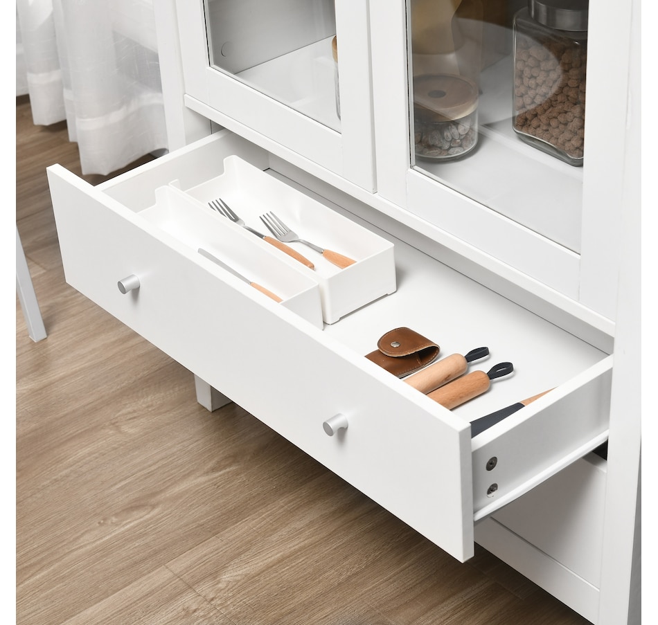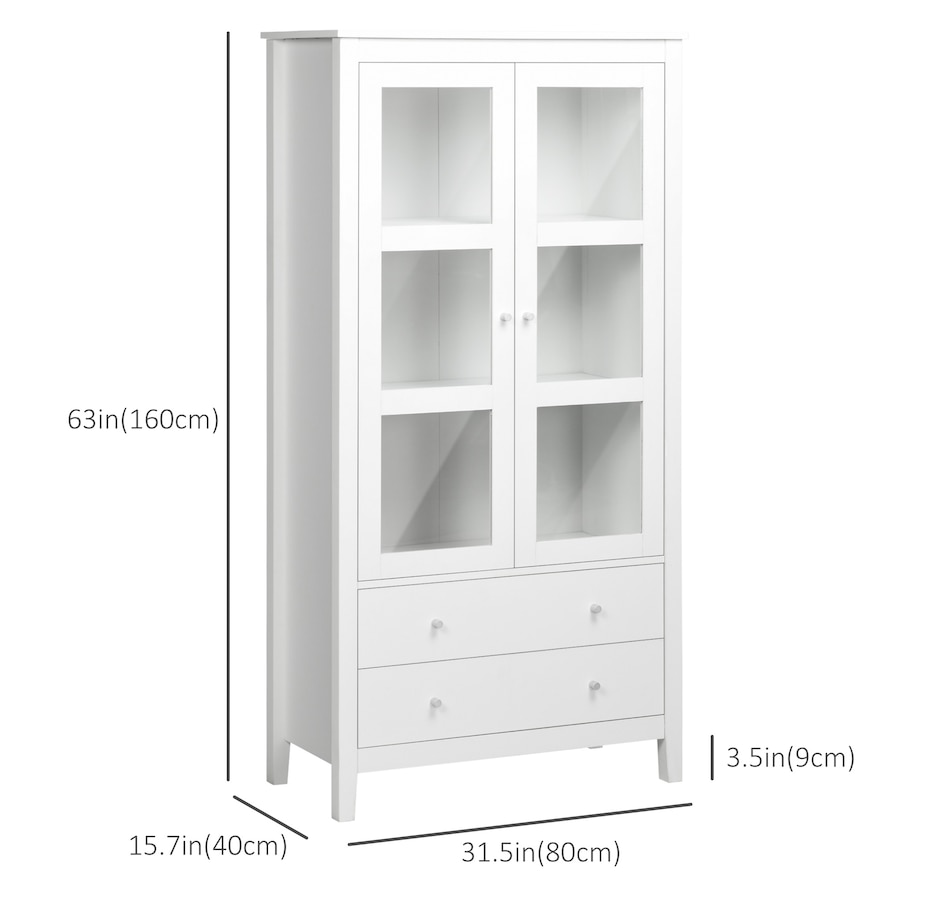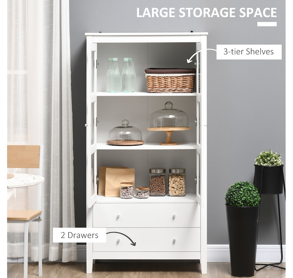 If you're struggling with unorganized clutter, the kitchen storage cabinet from HOMCOM will meet your needs. It features a clean-lined design with glass door panels to enhance the aesthetic charm of your cabinetry. Cut to a clean shape for simplicity, it comes with two large drawers and a three-tier cabinet, offering enough storage for your different items. Reduce visible clutter while adding an accent piece for your home decor with our pantry cabinets with shelves and doors.Features: