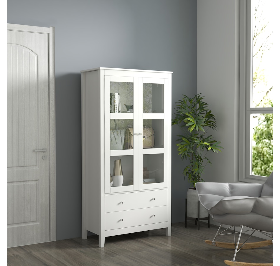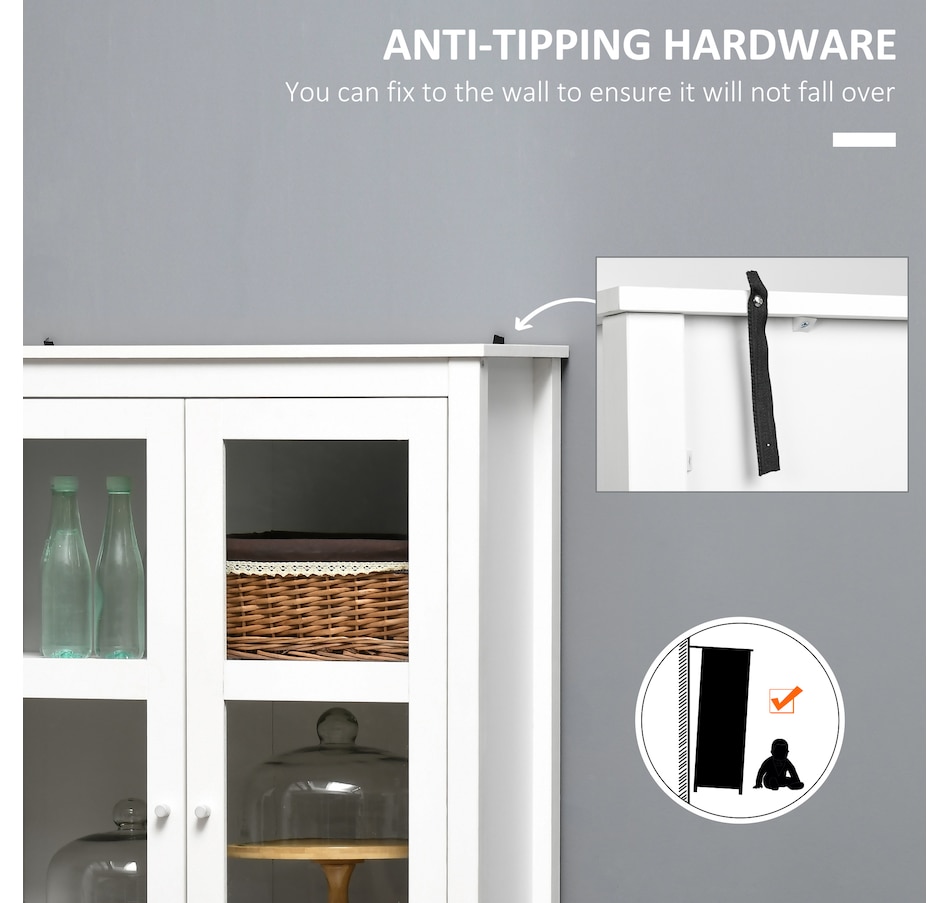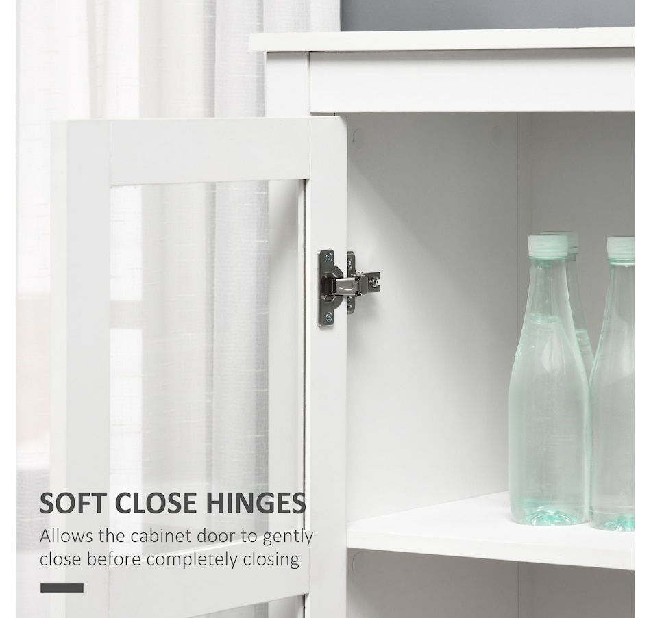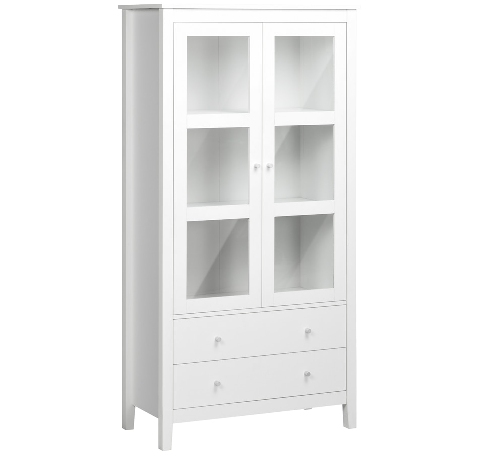 If you're struggling with unorganized clutter, the kitchen storage cabinet from HOMCOM will meet your needs. It features a clean-lined design with glass door panels to enhance the aesthetic charm of your cabinetry. Cut to a clean shape for simplicity, it comes with two large drawers and a three-tier cabinet, offering enough storage for your different items. Reduce visible clutter while adding an accent piece for your home decor with our pantry cabinets with shelves and doors.Features: