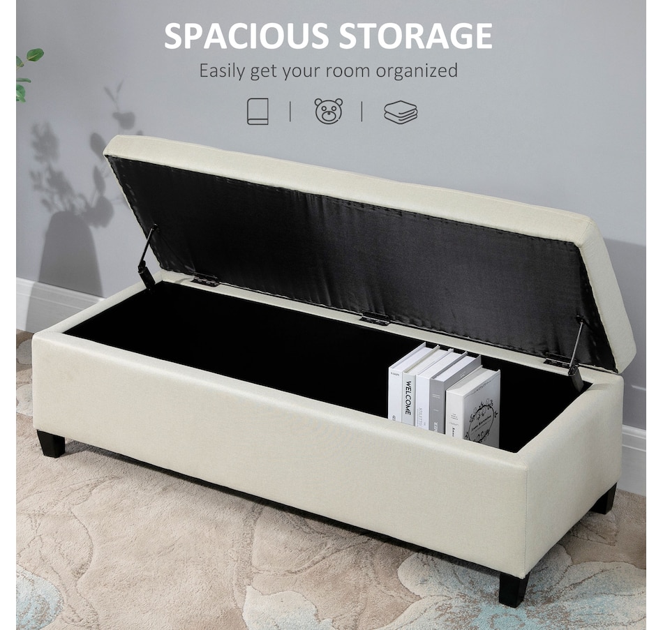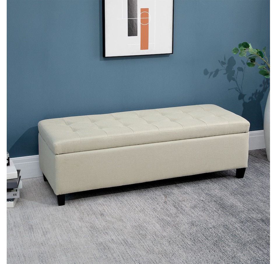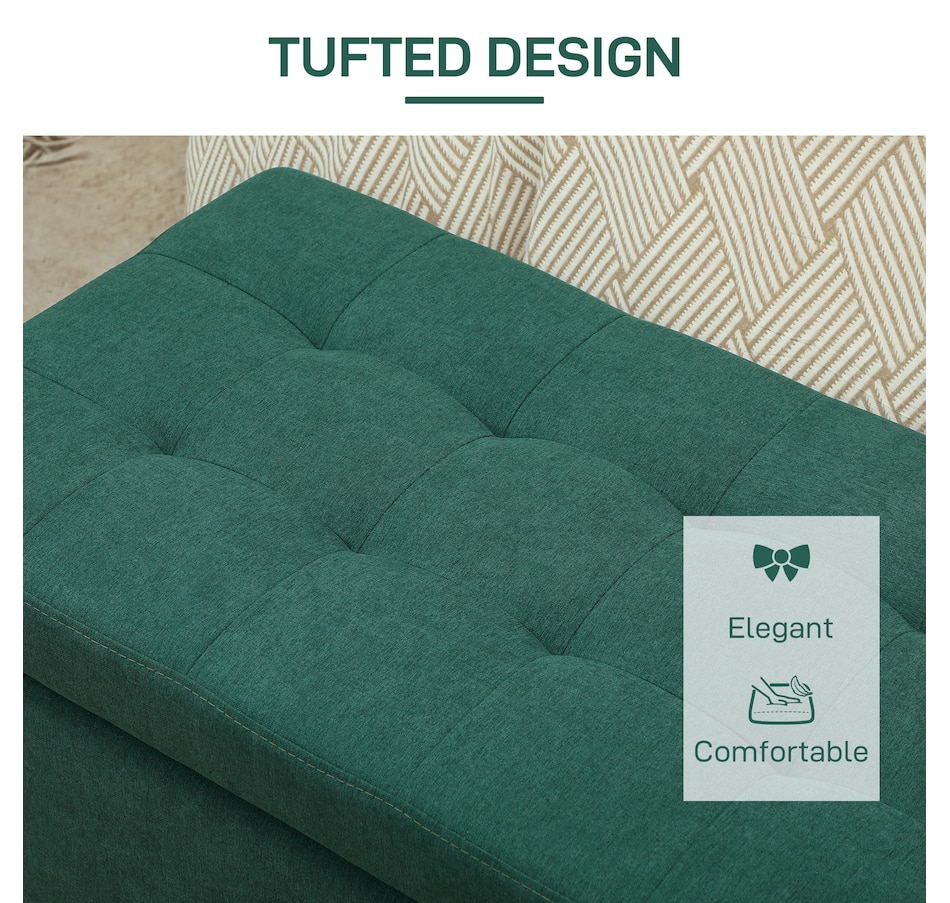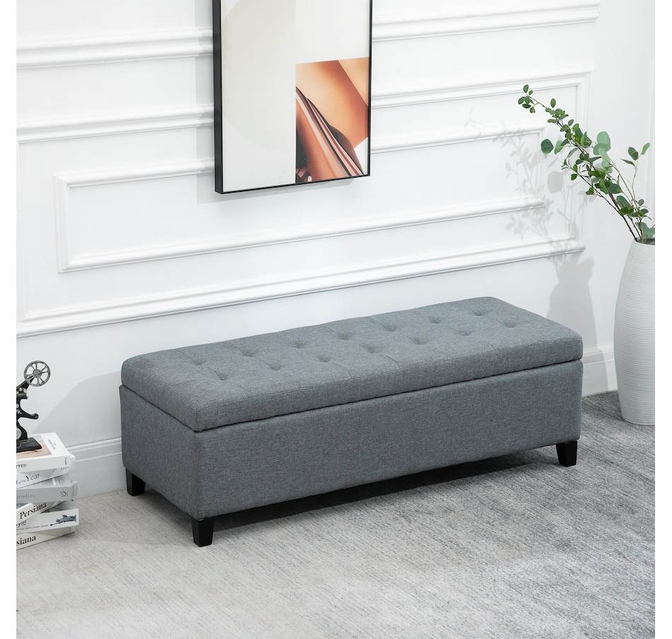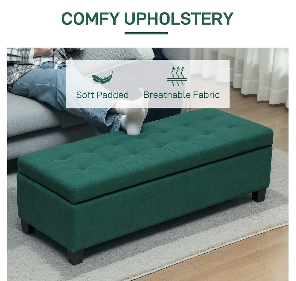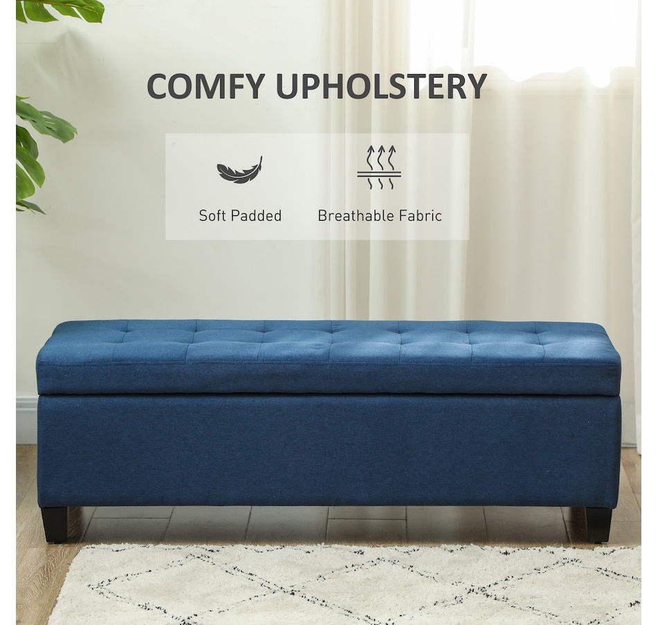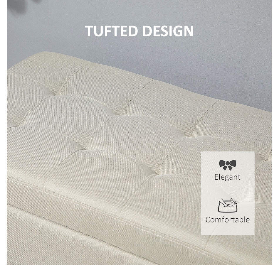 Finding the right style is necessary to help bring a room together and this chic, stylish HOMCOM fabric storage ottoman bench is a great addition to any living room, bedroom, or entryway. It features a beautiful elegant exterior and tufted top, along with firm wooden legs and a roomy interior that is great for storing extra pillows and blankets, shoes, or other clothing and accessories. The storage chest with thick padded cushion provides you with complete comfort and support.
