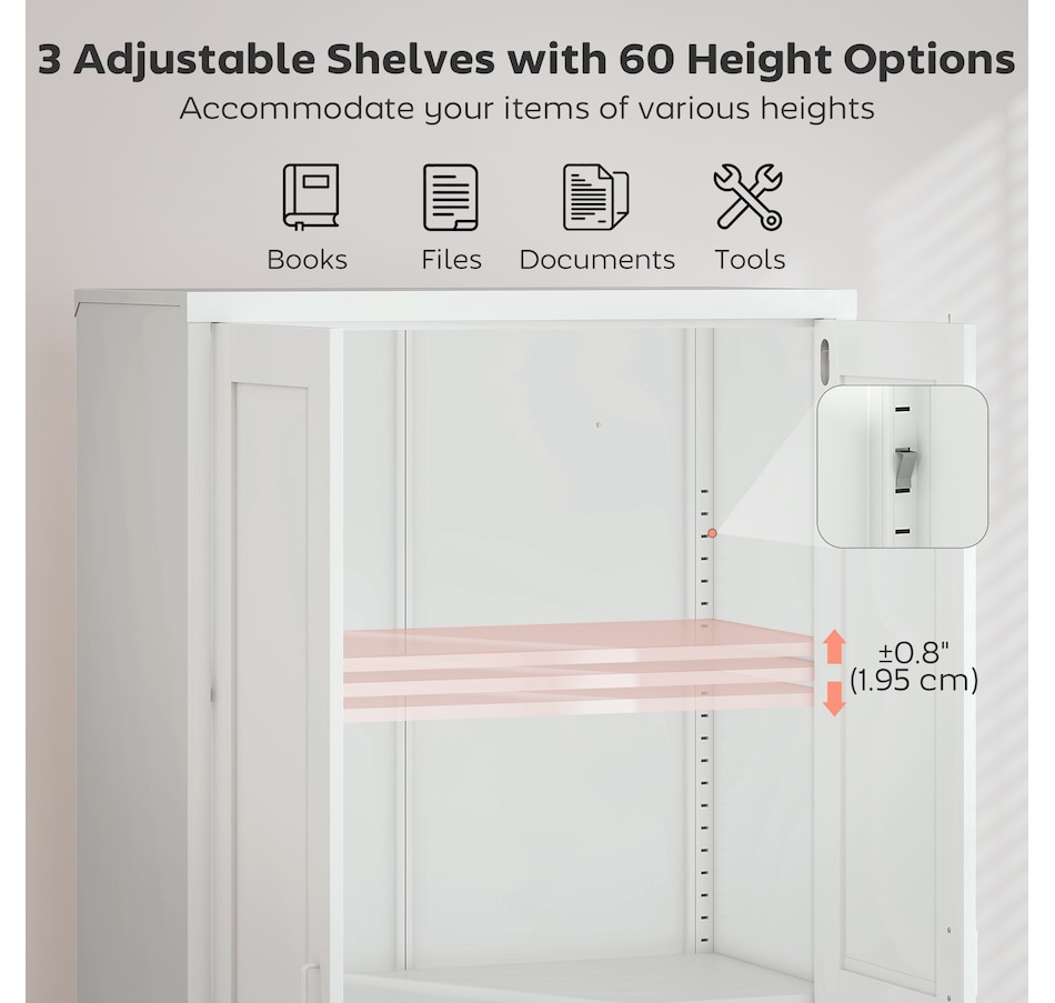 ● Three adjustable shelves with 60 height options, offering customizable storage for any item size;