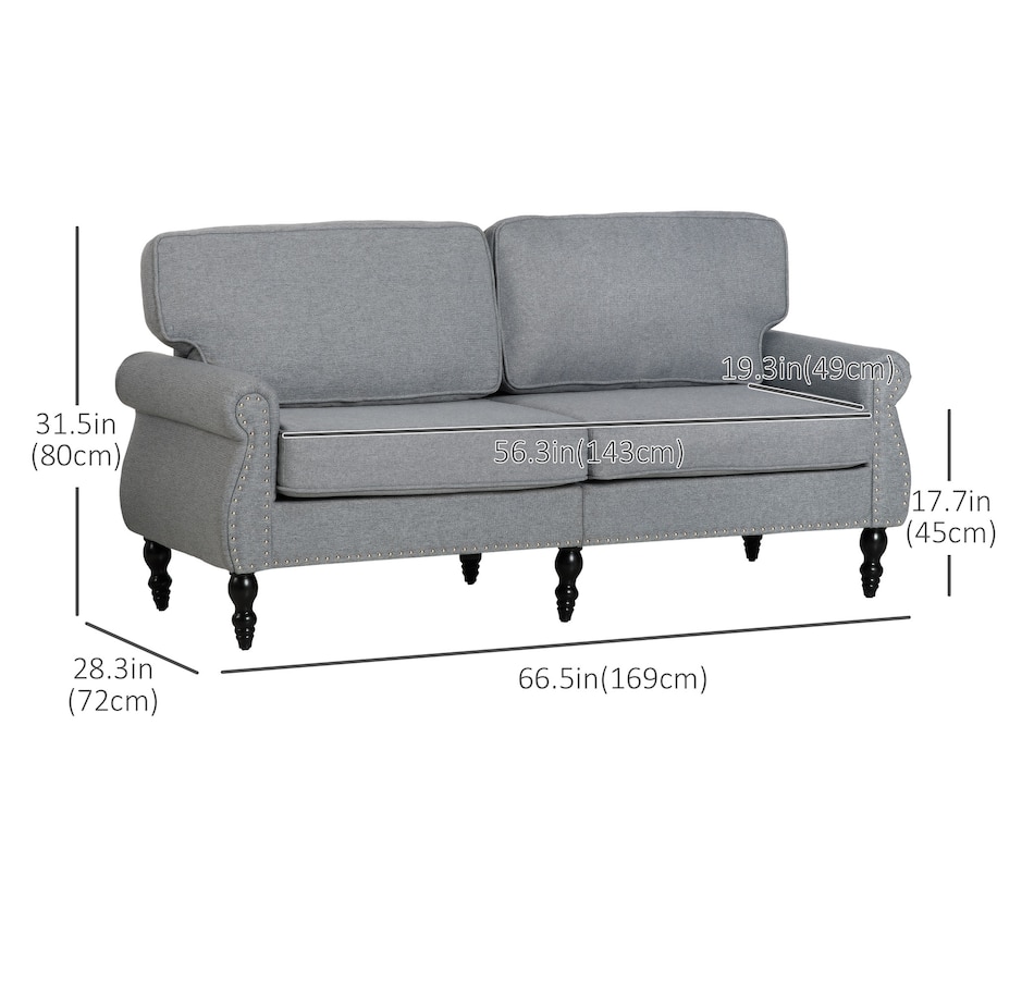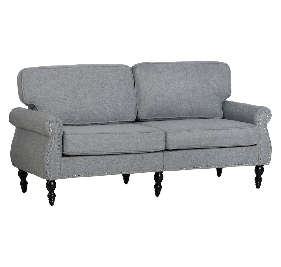 ● Traditional style double sofa features nail head accents, turned legs, and scrolled arms;