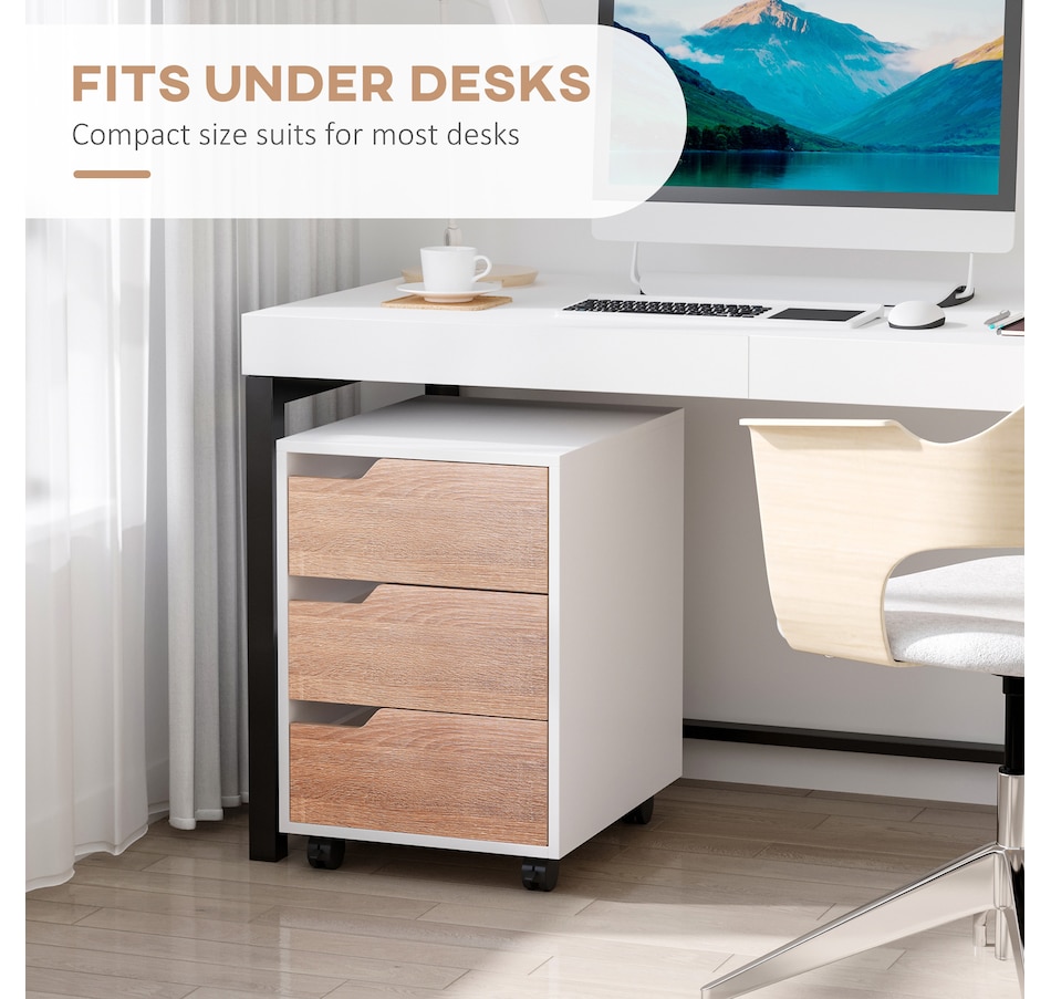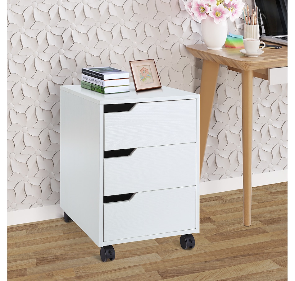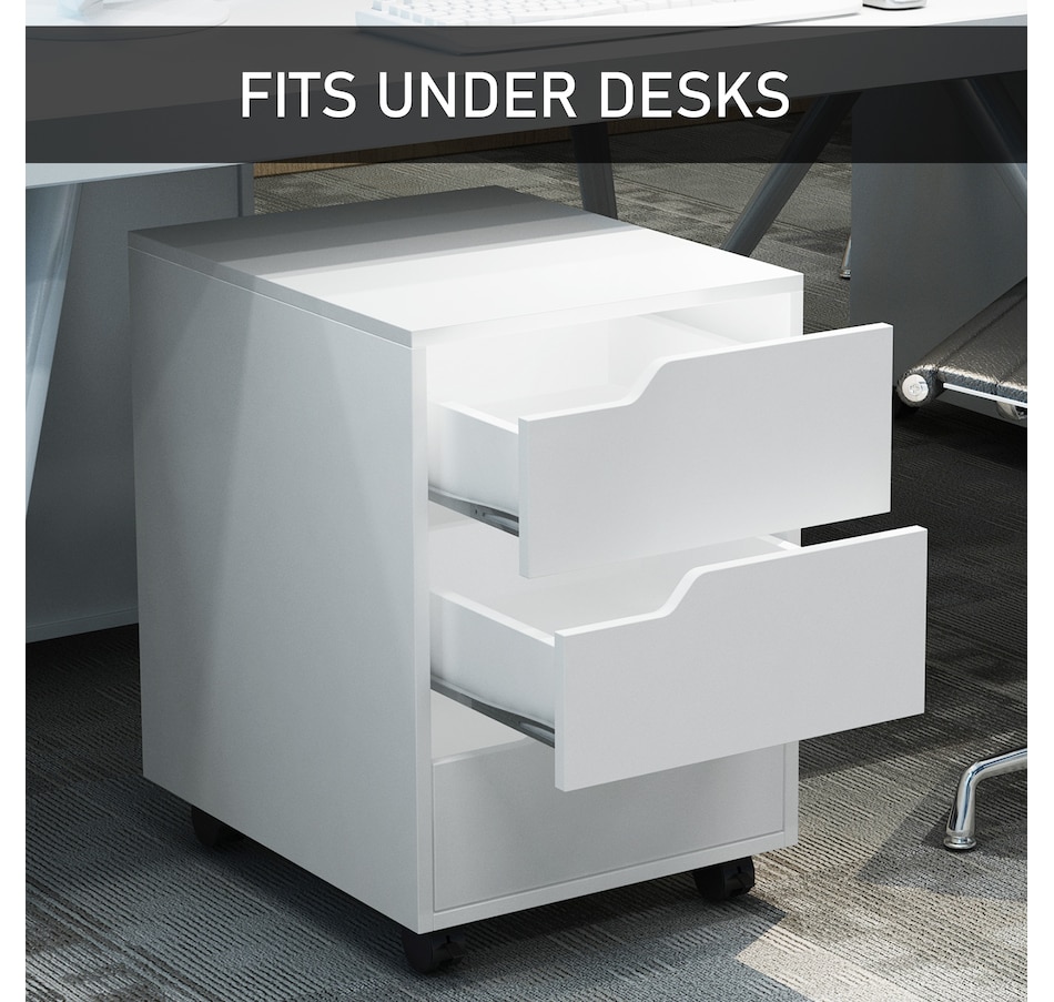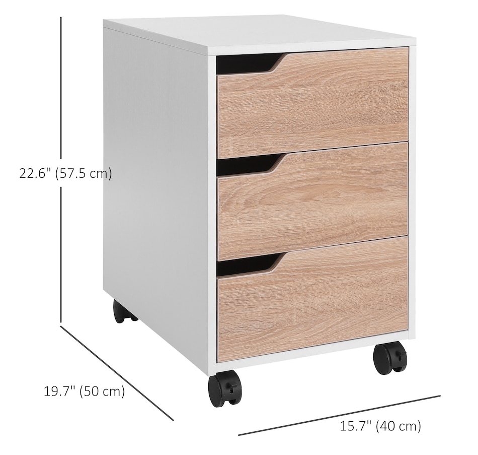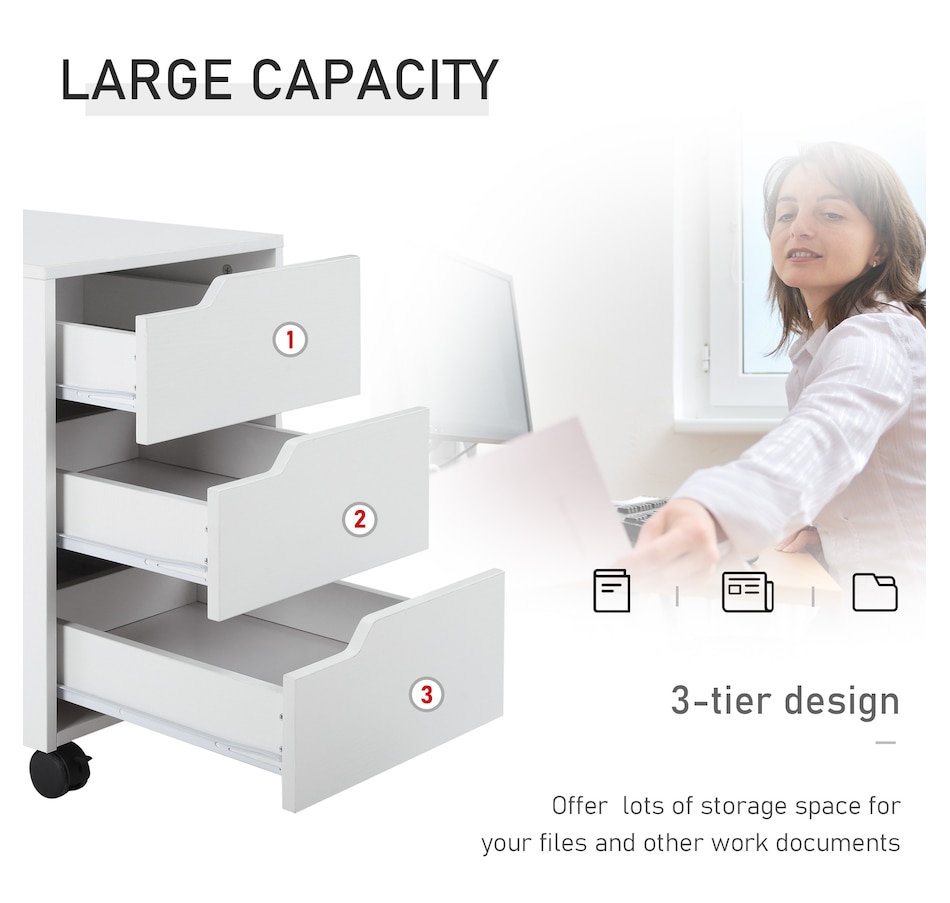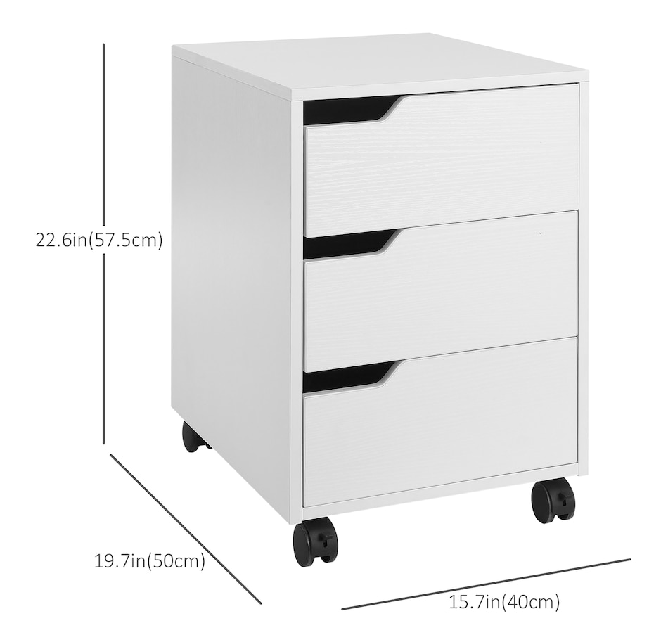 This HOMCOM 3 drawer filing cabinet is ideal for storing all of your office supplies and documents neatly. The drawers with cut-out handles make it simple to access your filing storage. Because it is supported by four rolling casters, two of which are lockable, this storage cabinet with drawers can be moved around easily while remaining stable in place to prevent accidental slide-away. It is compact and will fit perfectly in small spaces and under desks.