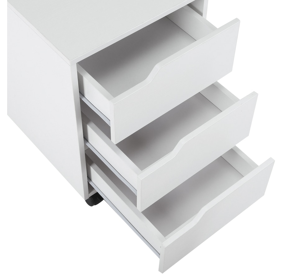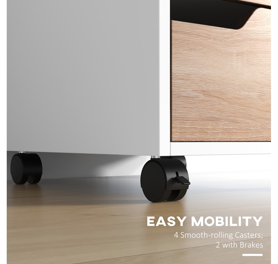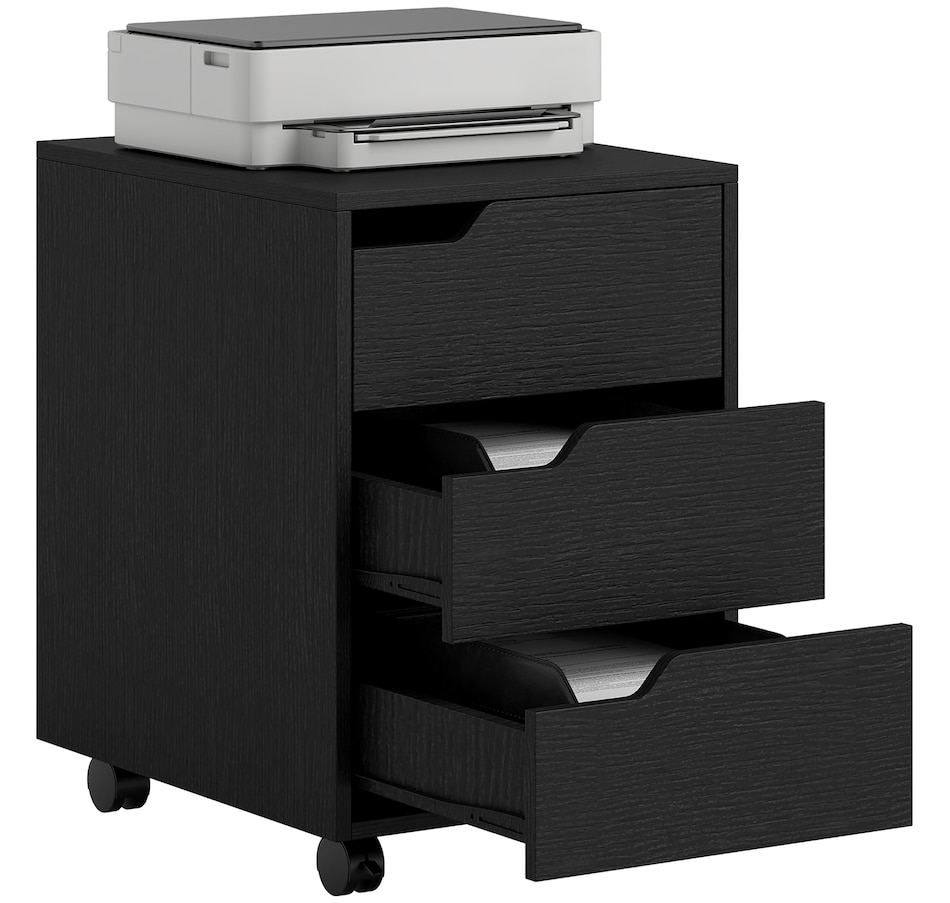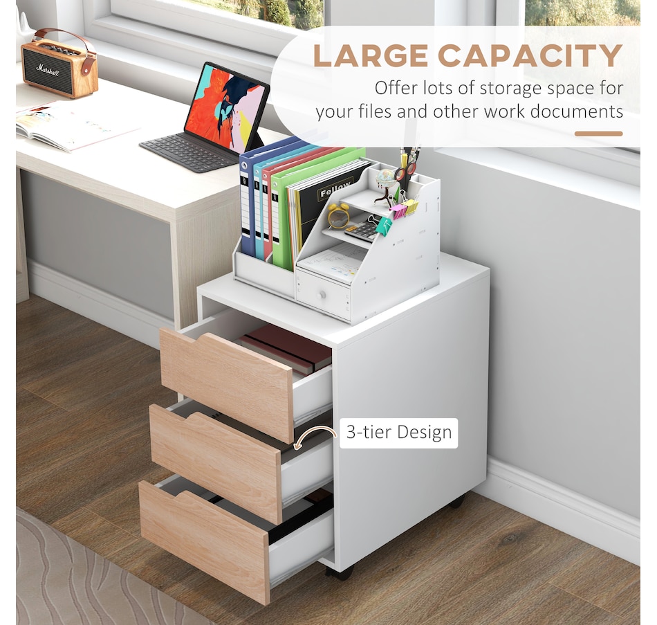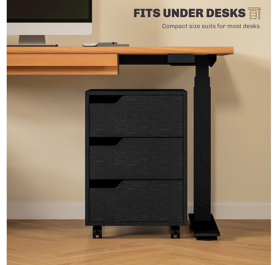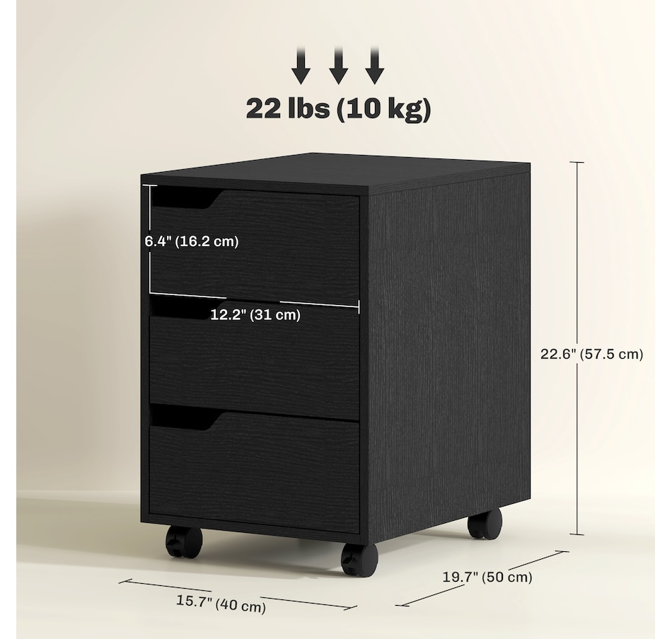 This HOMCOM 3 drawer filing cabinet is ideal for storing all of your office supplies and documents neatly. The drawers with cut-out handles make it simple to access your filing storage. Because it is supported by four rolling casters, two of which are lockable, this storage cabinet with drawers can be moved around easily while remaining stable in place to prevent accidental slide-away. It is compact and will fit perfectly in small spaces and under desks.
