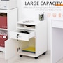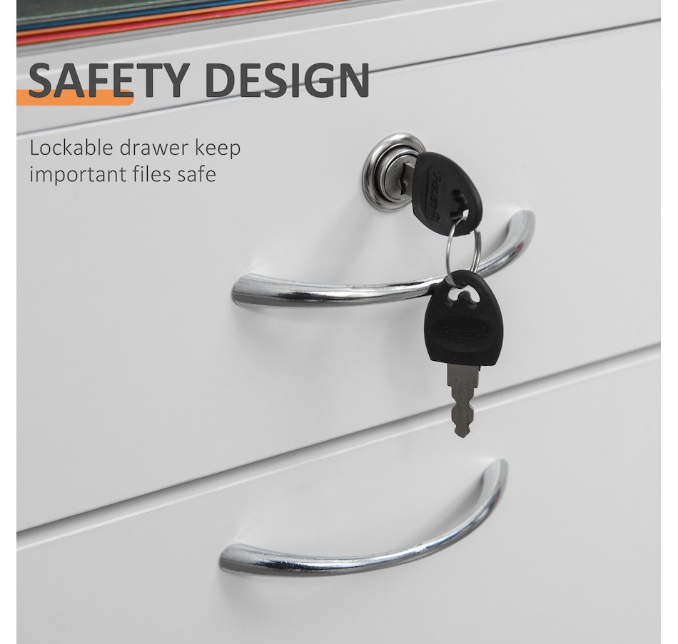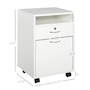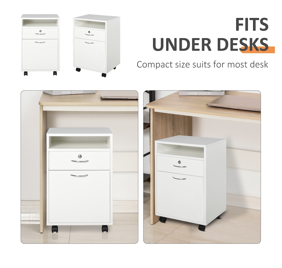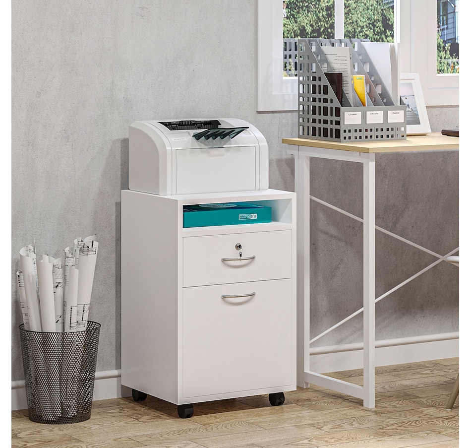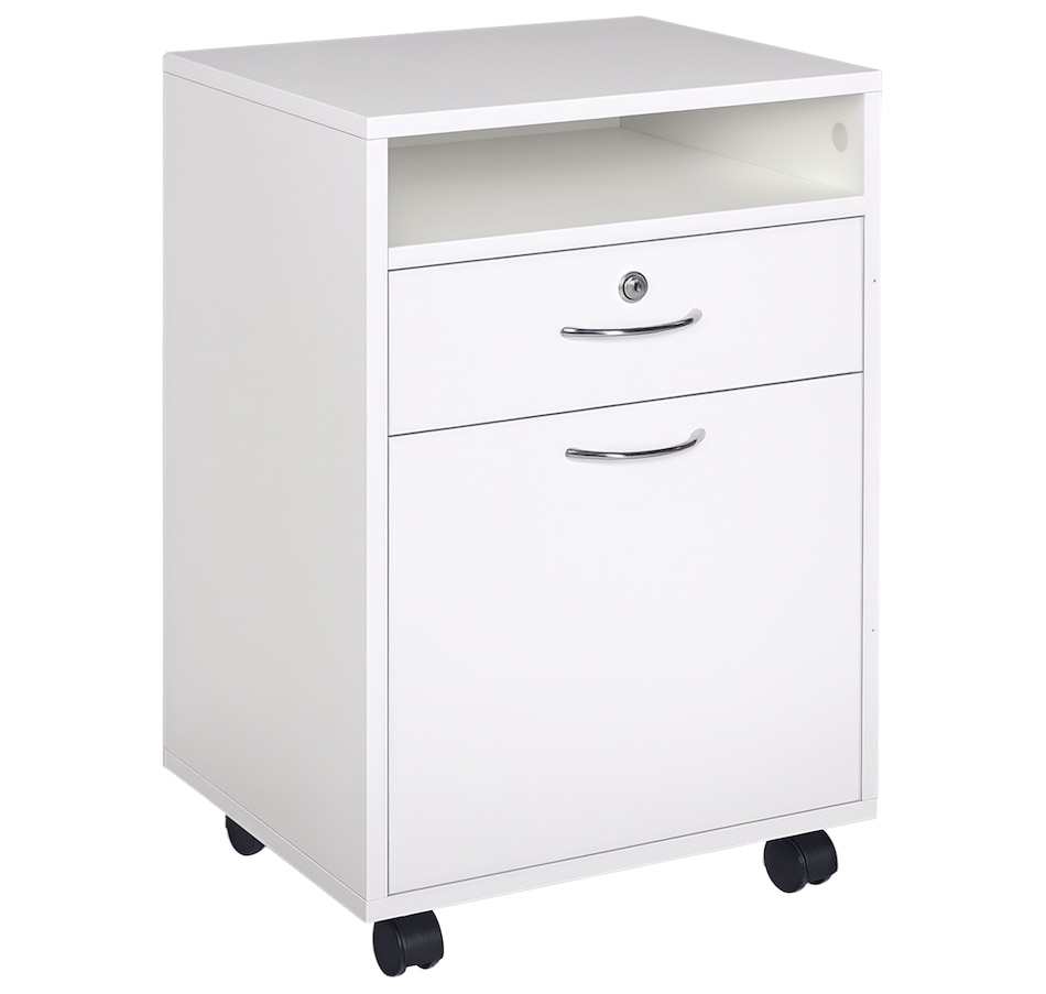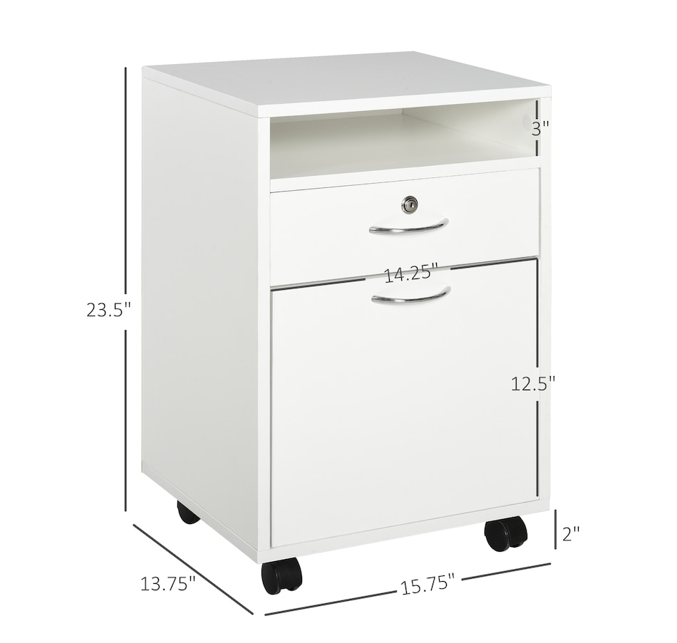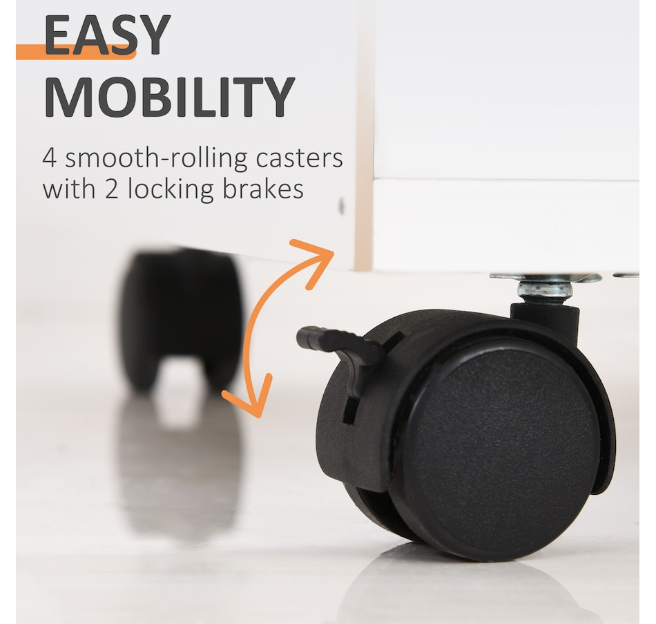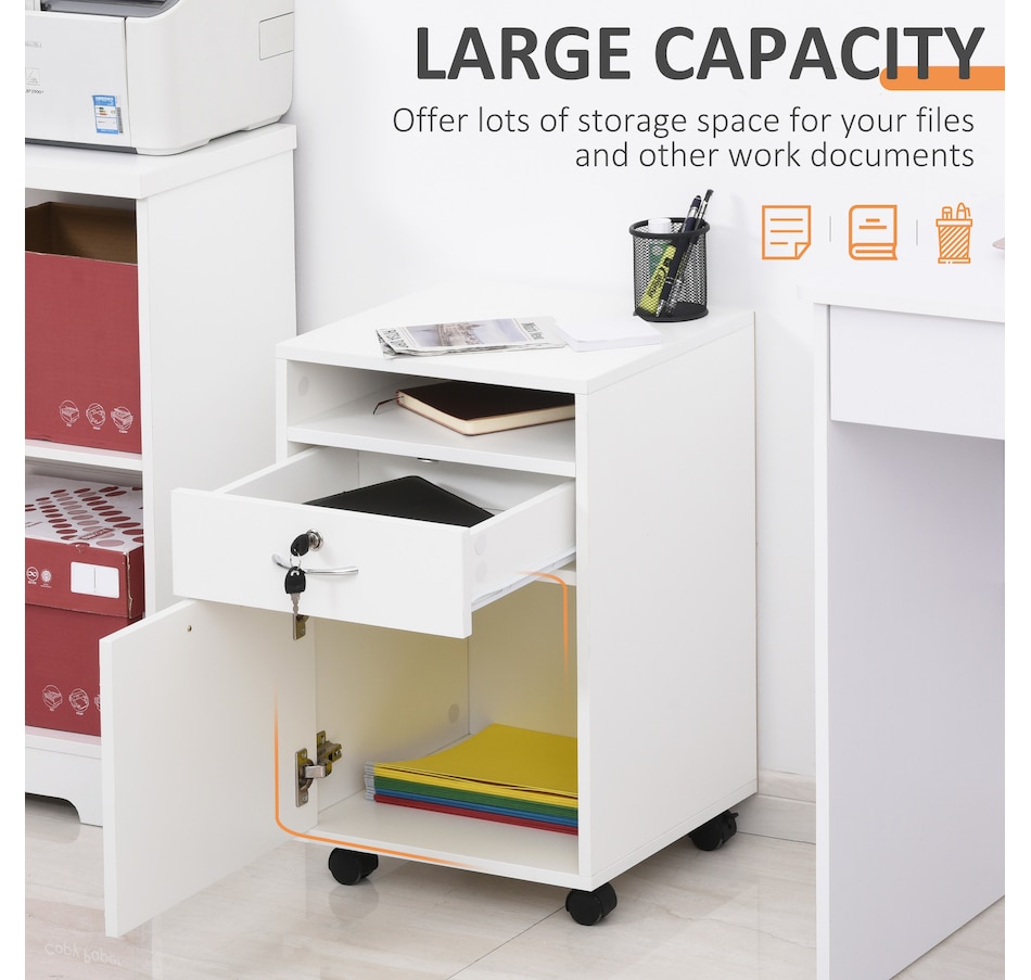 Work areas always need more room for storing things, and this compact printer stand with a desktop, an open shelf, a lockable drawer, and a large cabinet is the ideal solution. Lockable design keeps your files safe when away. 4 smooth-rolling casters with 2 locking brakes make this file cabinet organizer easy movement. Made of durable particle board for sturdiness and smooth surface for easy cleaning. Organize your work supplies neat and tidy with this storage cabinet with drawers from HOMCOM.