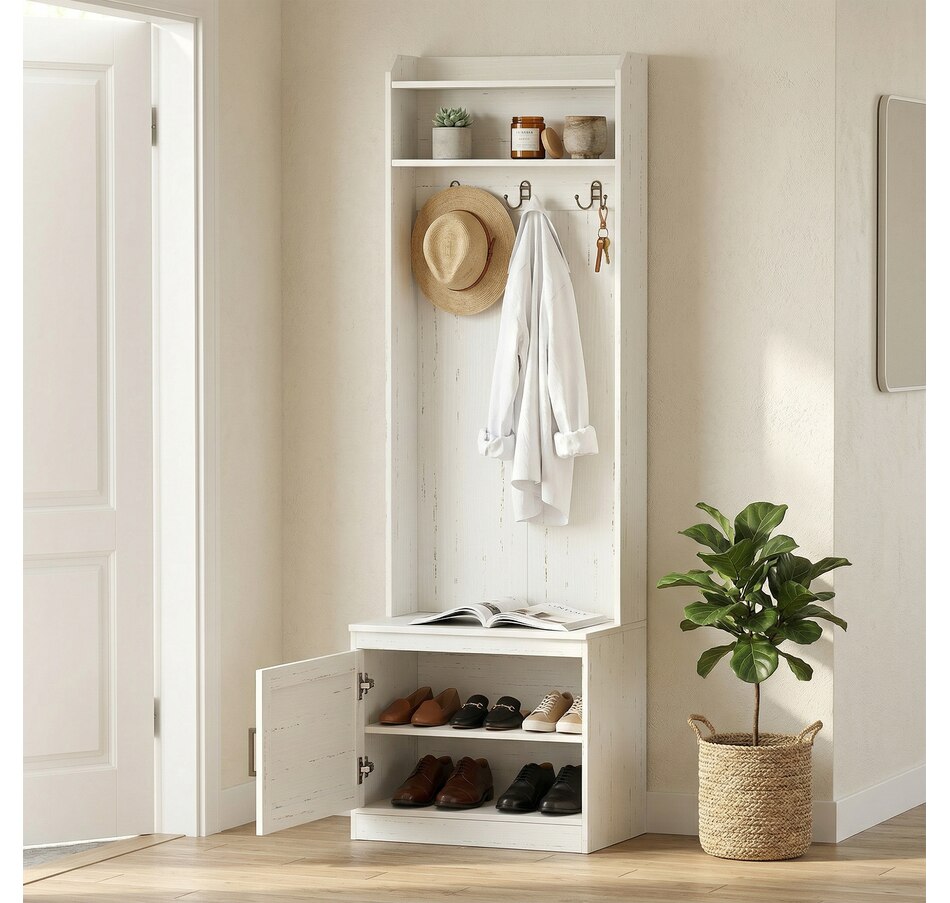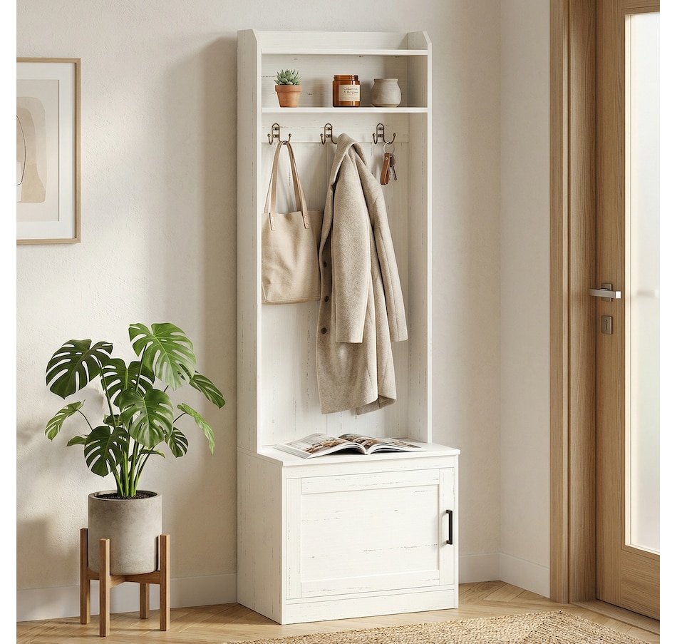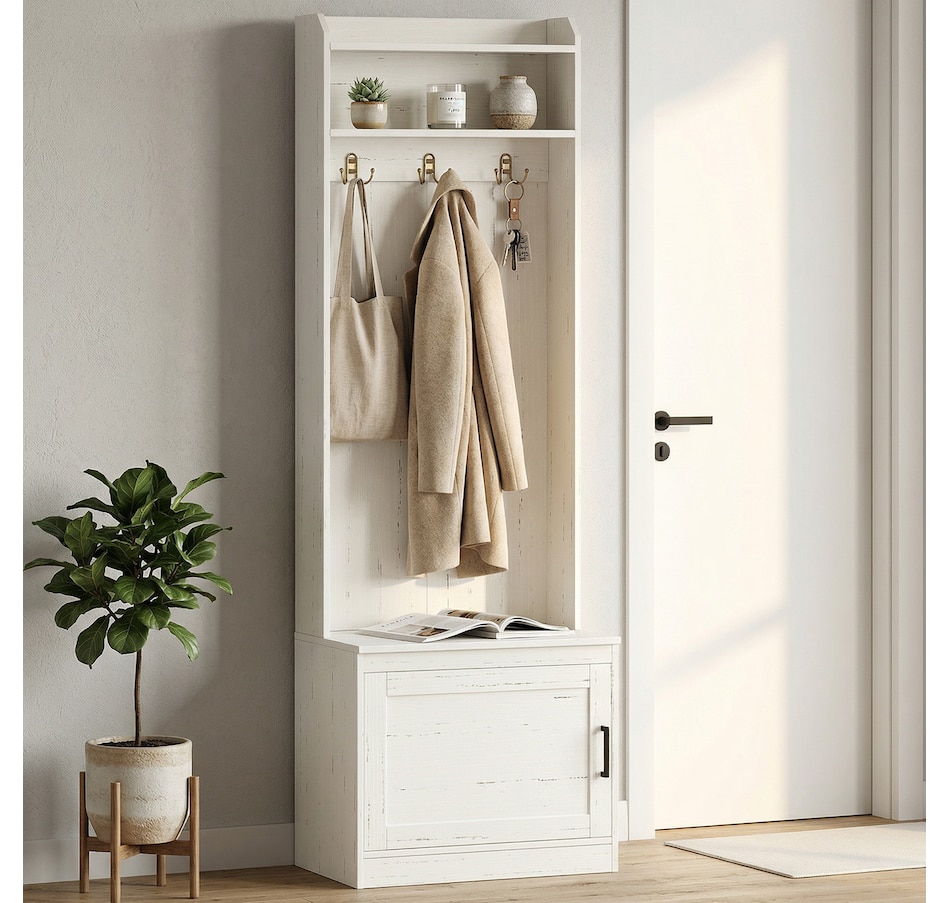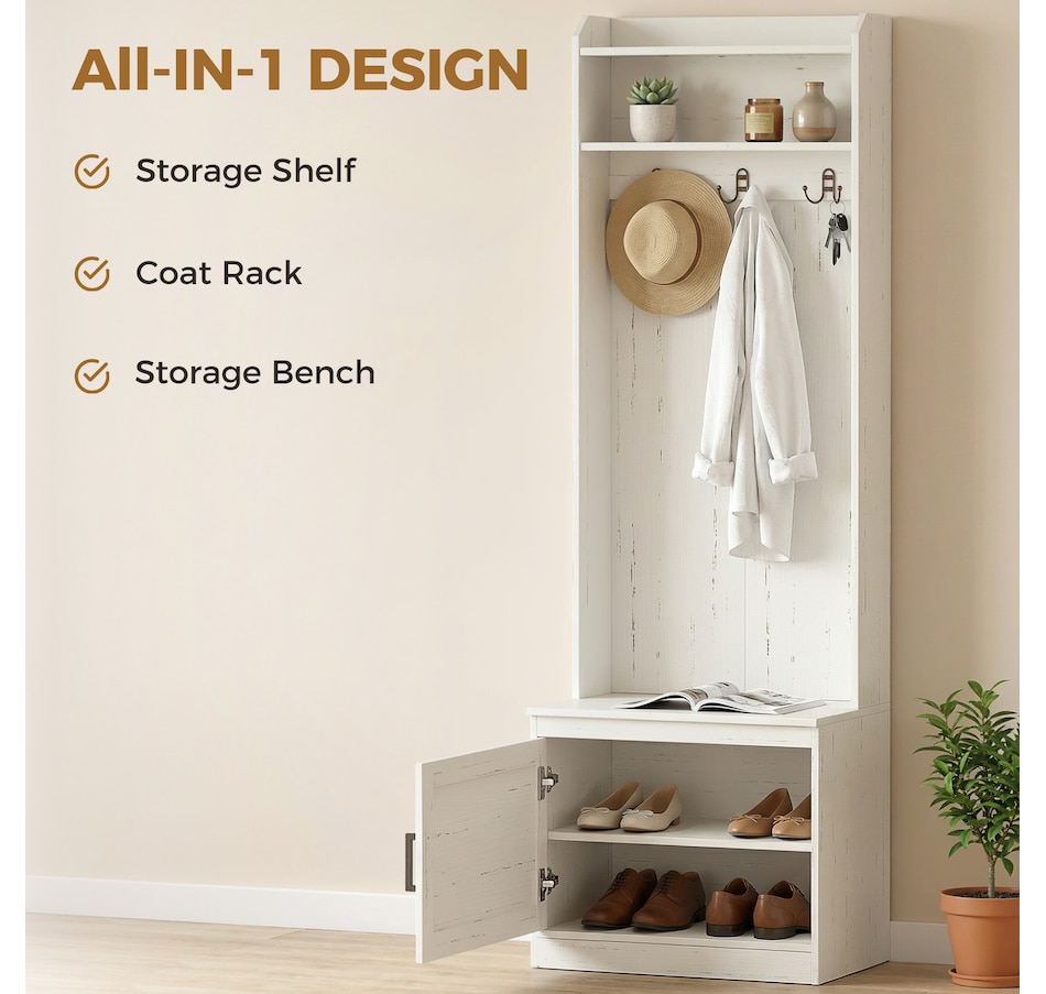 ● Combines open shelves, storage cabinet, coat hanger, and bench;
