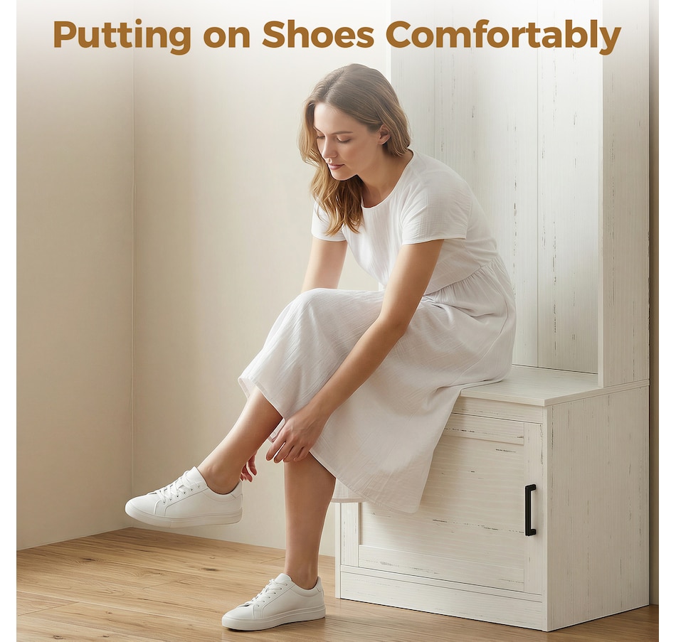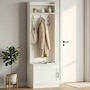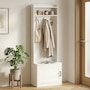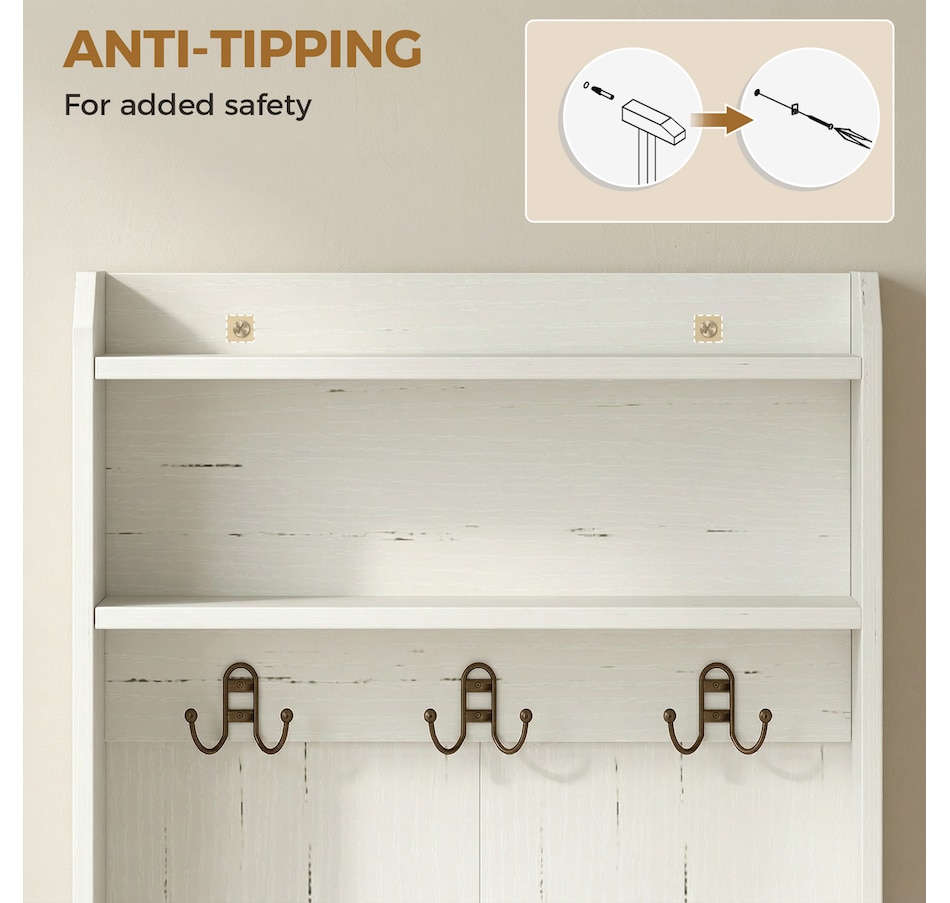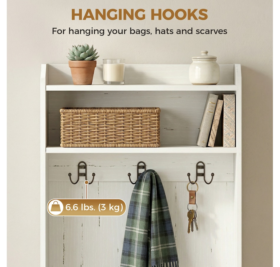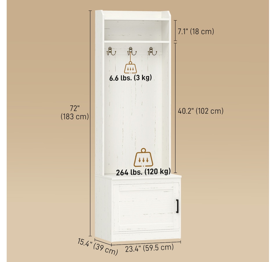 ● Combines open shelves, storage cabinet, coat hanger, and bench;