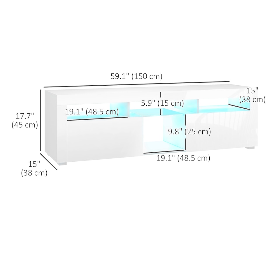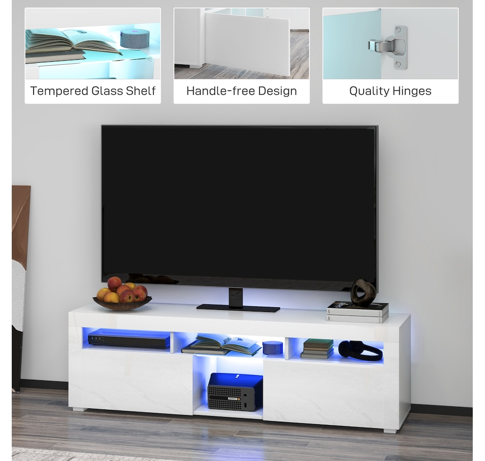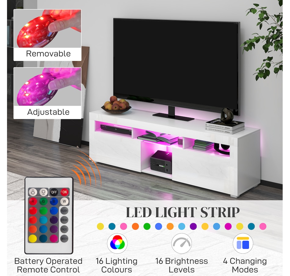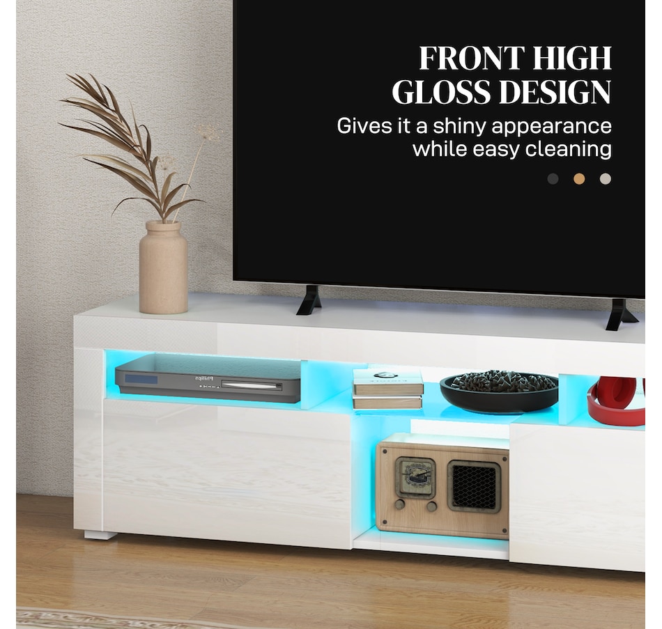 Take TV stand with storage from HOMCOM to make your home fashionable! This media unit with clean lines and high glossy white colour decorates any home style. 16 lighting colours with 16 brightness levels and 4 lighting modes add more exciting elements to your life. Open compartments and cabinets make your home cleaner. HOMCOM entertainment unit is a wonderful gathering piece for your living space!Features: