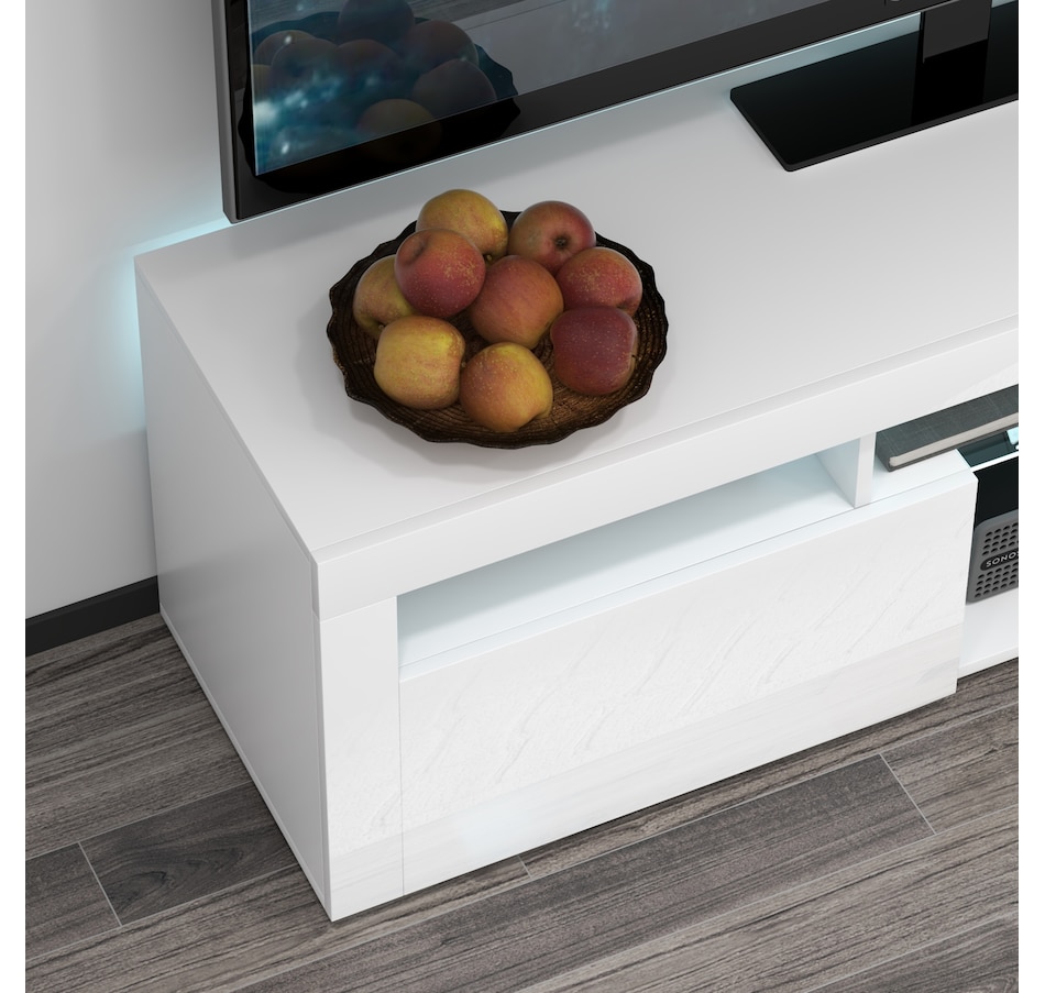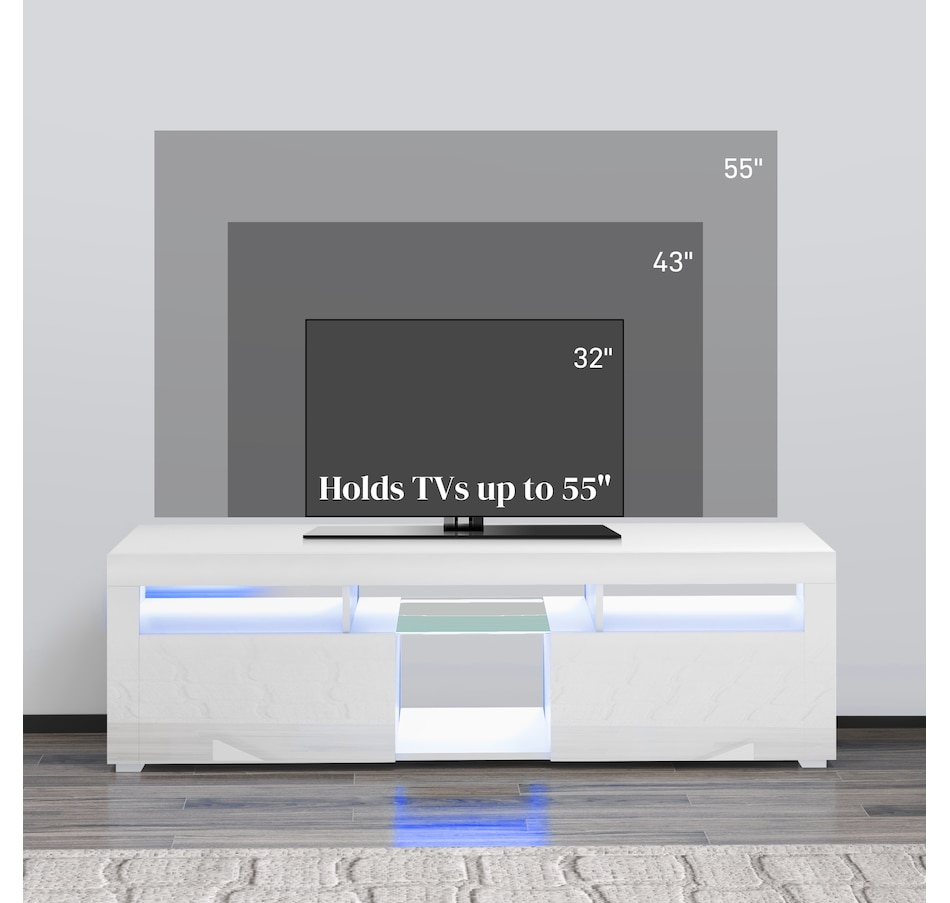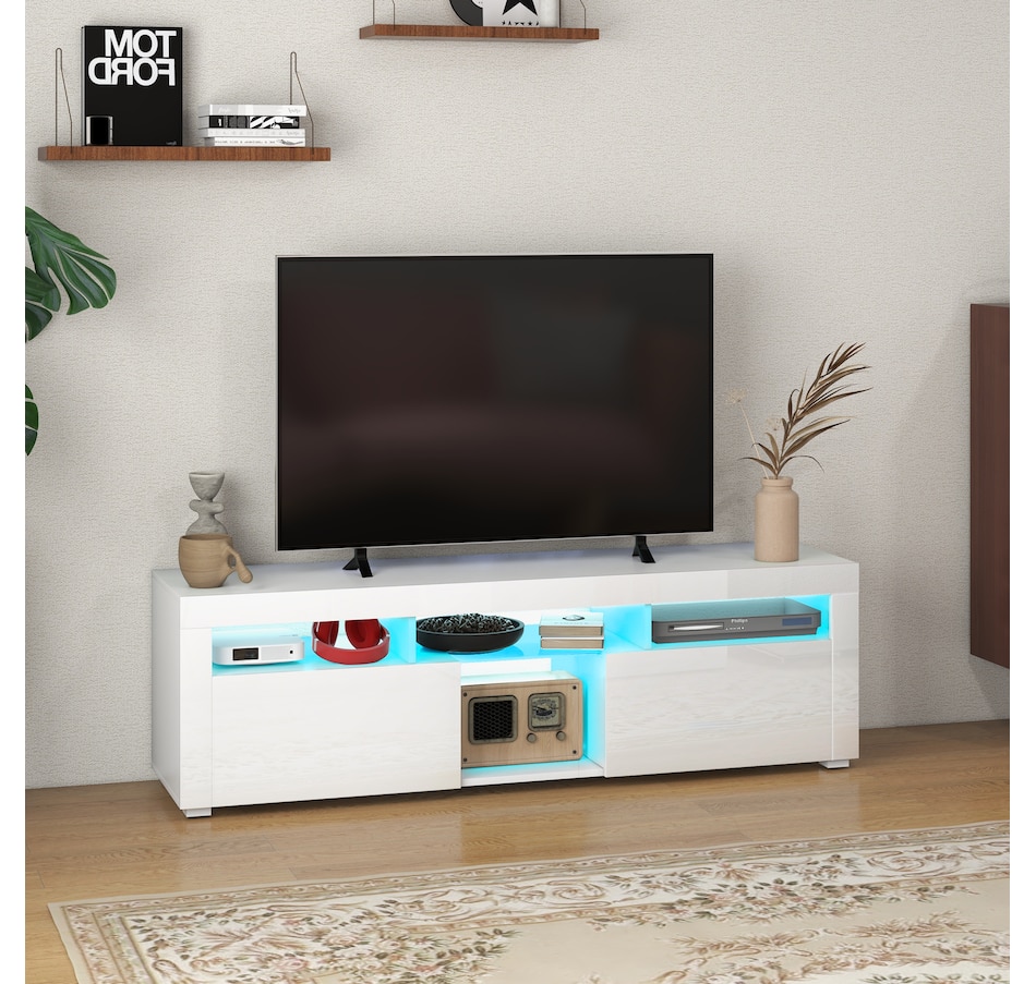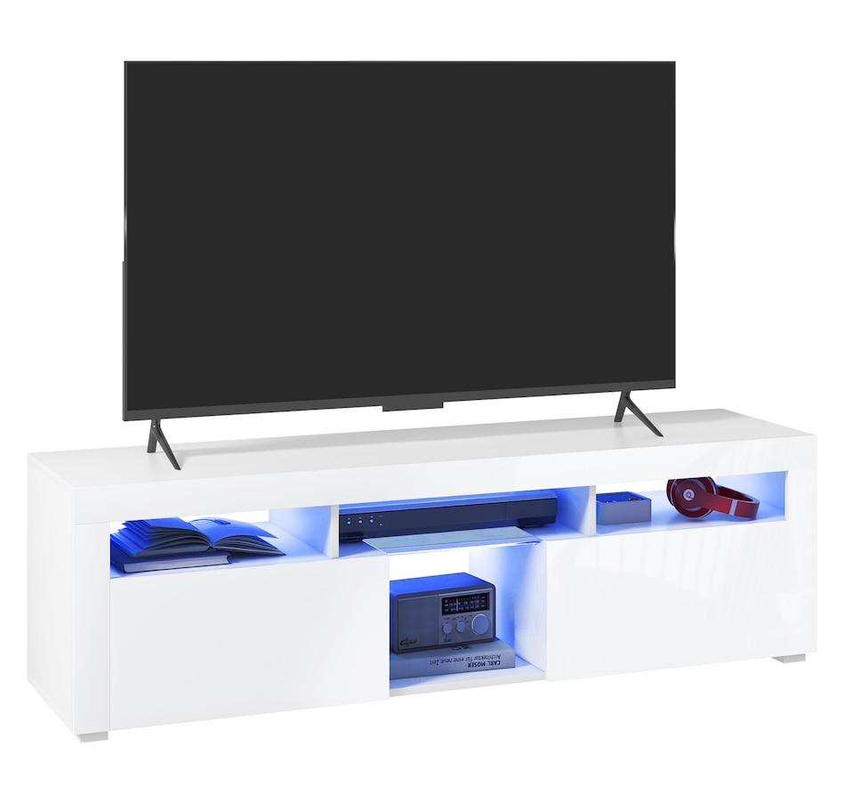 Take TV stand with storage from HOMCOM to make your home fashionable! This media unit with clean lines and high glossy white colour decorates any home style. 16 lighting colours with 16 brightness levels and 4 lighting modes add more exciting elements to your life. Open compartments and cabinets make your home cleaner. HOMCOM entertainment unit is a wonderful gathering piece for your living space!Features: