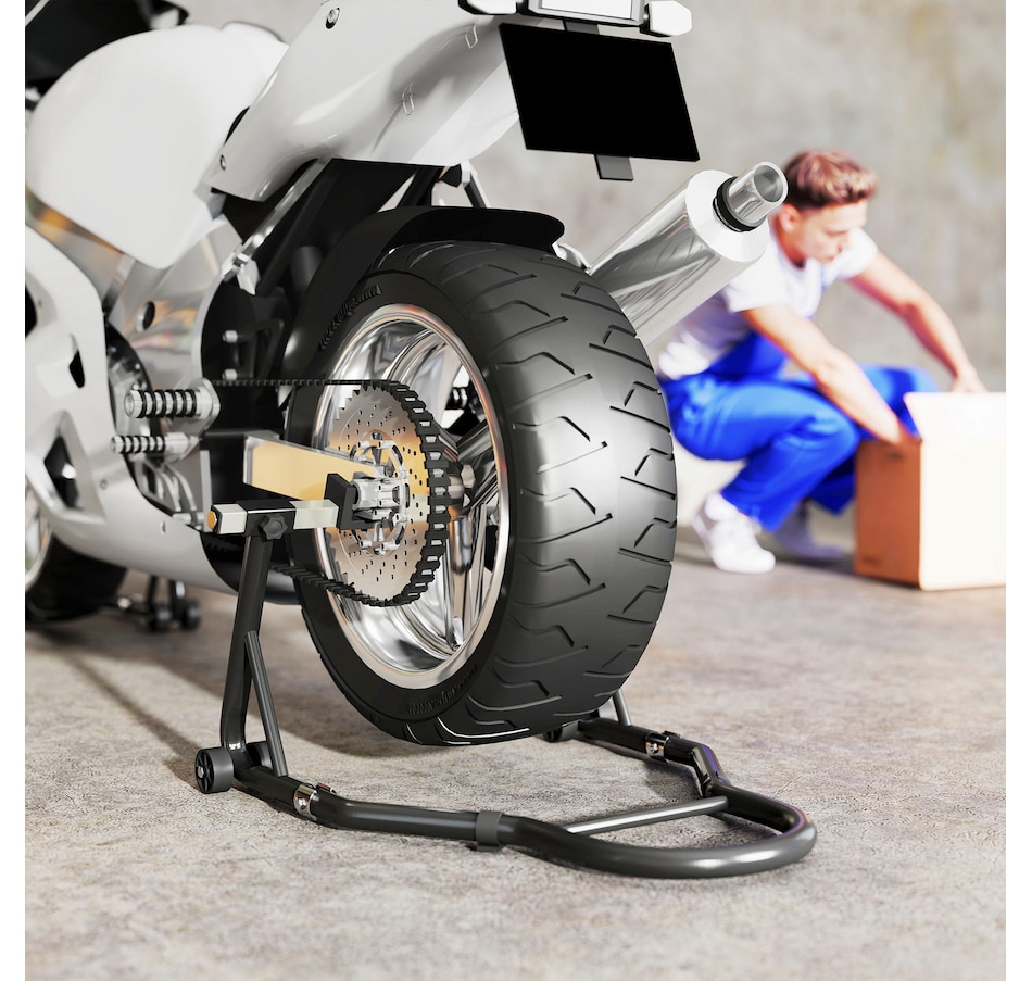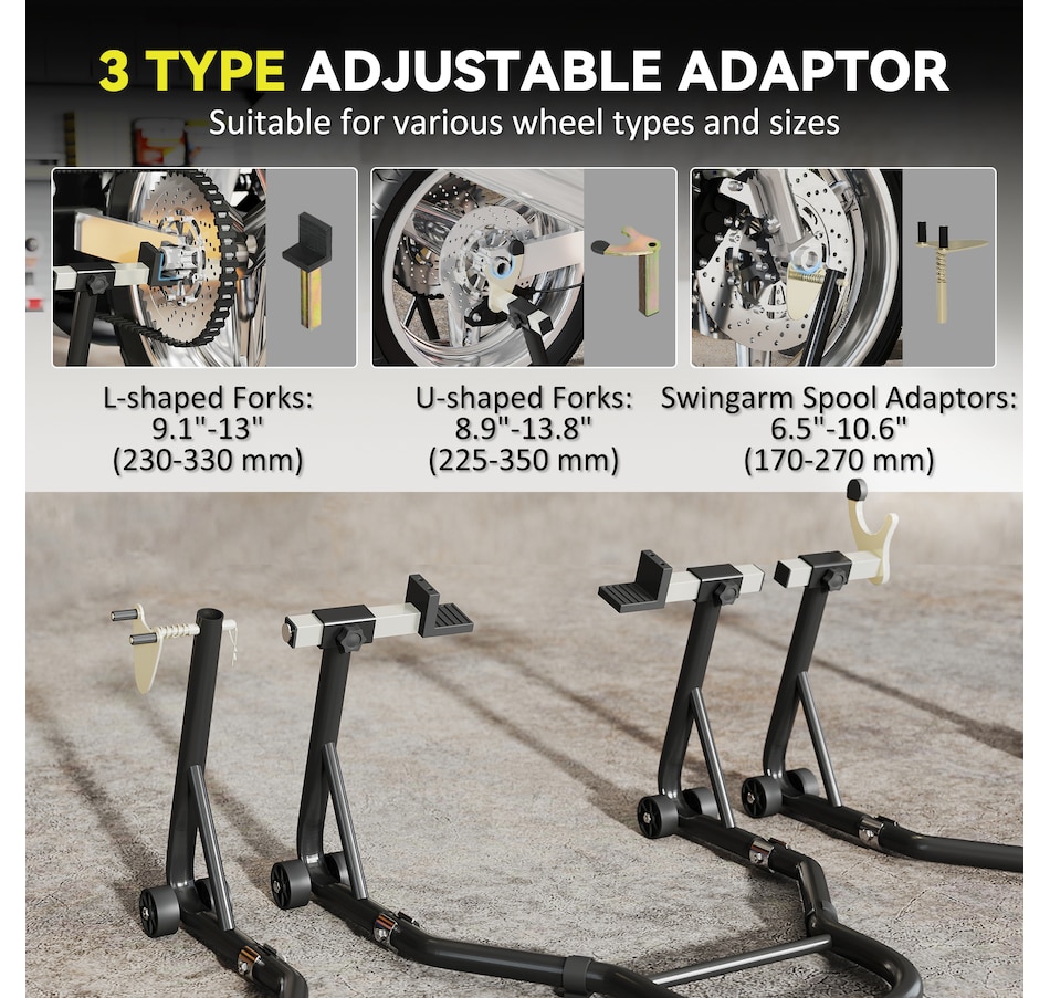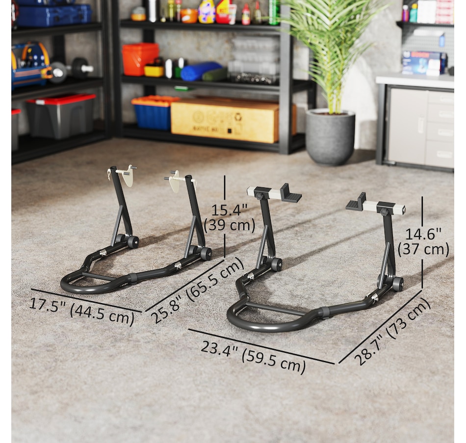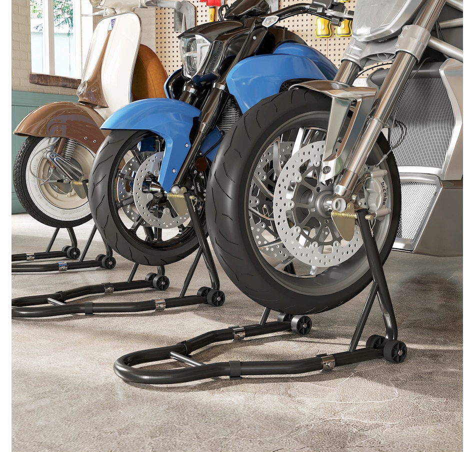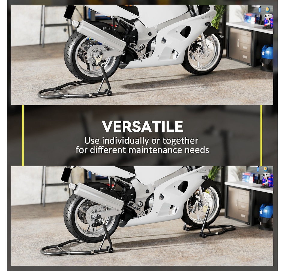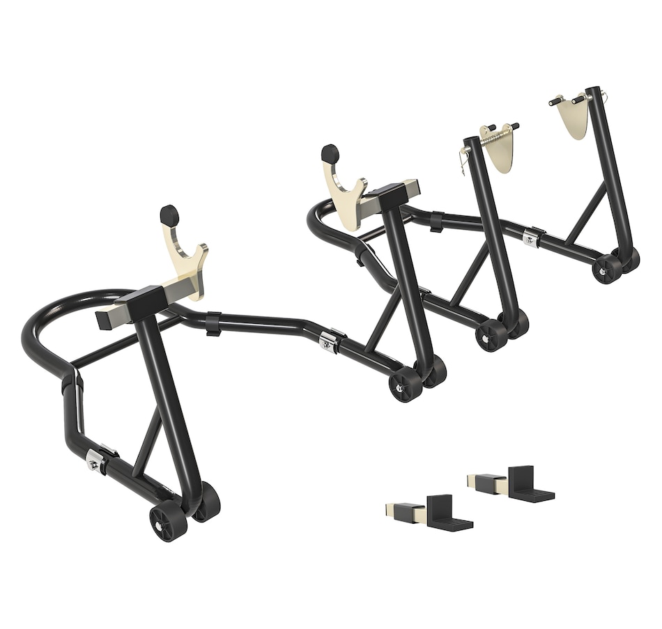 Secure your motorcycle effortlessly with HOMCOM Motorcycle Stand Lift Set. Complete with clamping clips to reduce wobble, the set gives you the confidence to tackle repairs or cleaning without hassle. The adjustable design makes it fit various bike sizes, great for every rider. Whether you're lifting the front, rear, or both wheels, the padded, four-wheel base provides stable support while avoiding abrasions. A must-have for any motorcycle owner who values safety, convenience, and versatility.