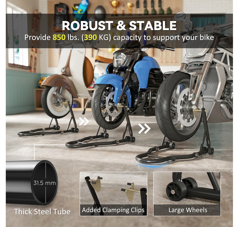 ● 6.5"-10.6" (170-270 mm) adjustable front wheel stand accommodates various motorcycle sizes;