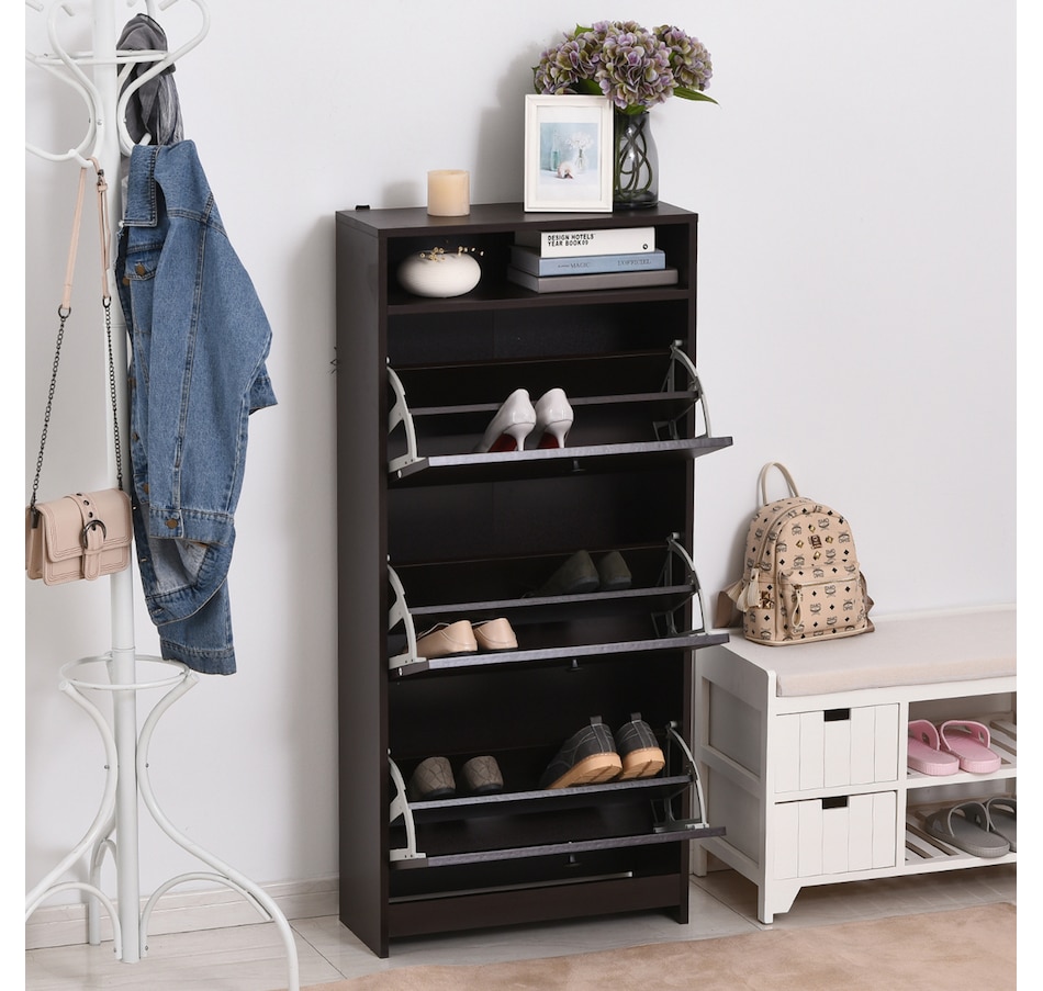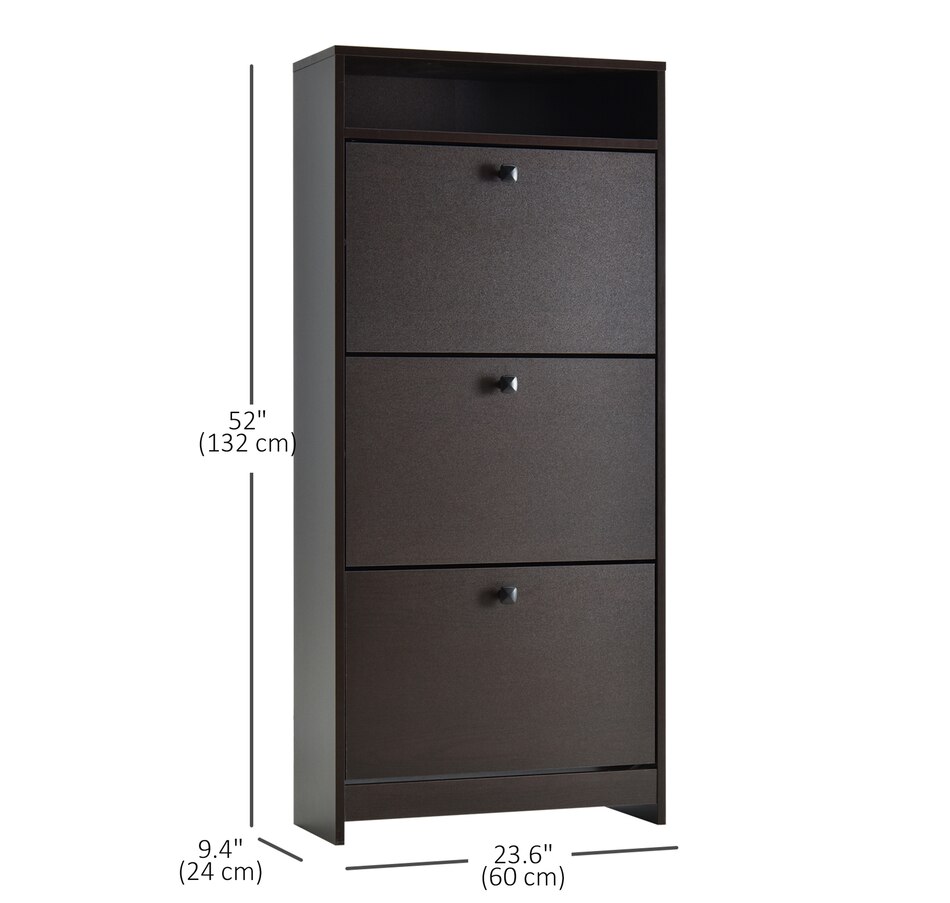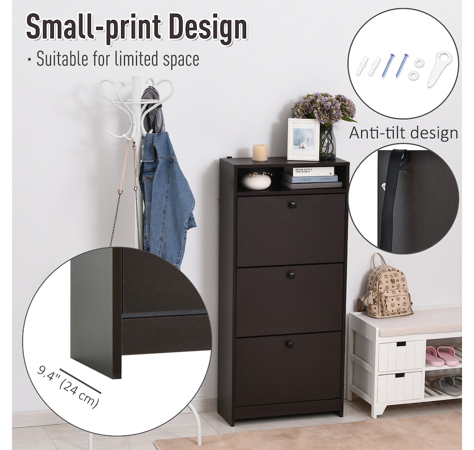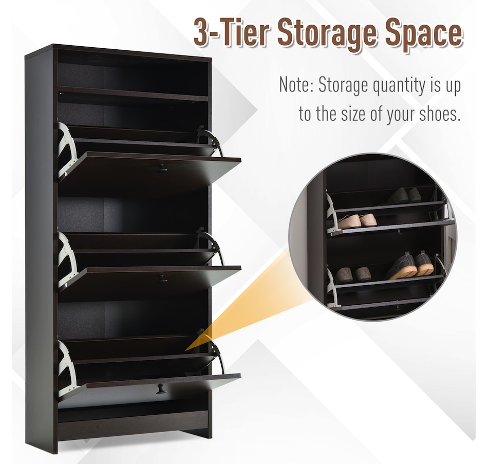 A narrow storage unit is an indispensable piece of furniture for every home, but only some pieces suit your needs well. Our HOMCOM shoe cabinet for entryway is certainly among them. Features three flip doors with adjustable shelves and an top shelf, this cabinet can store up to shoes and meets your different shoe storage needs. You can also display decorations on the flat-top space. Get your entrance tidy and clean with this beautiful and functional shoe storage cabinet.Features: