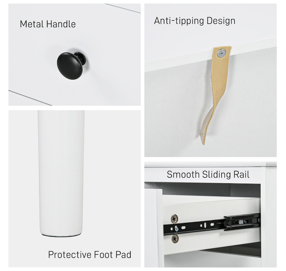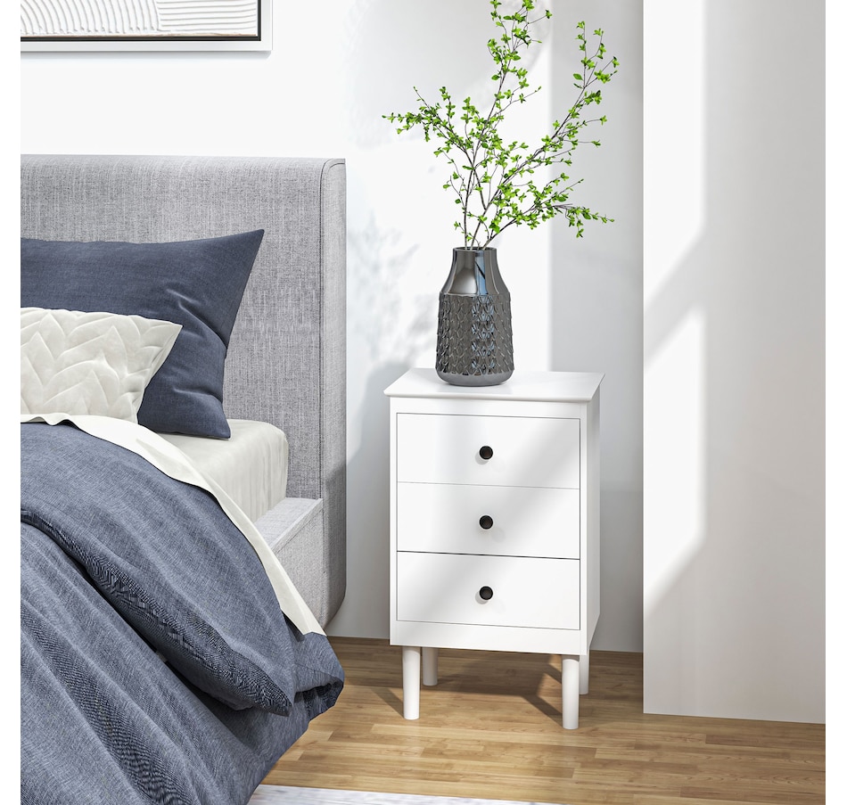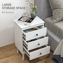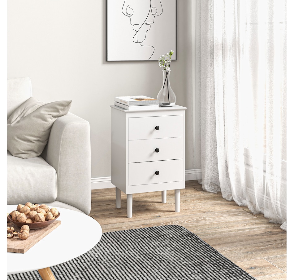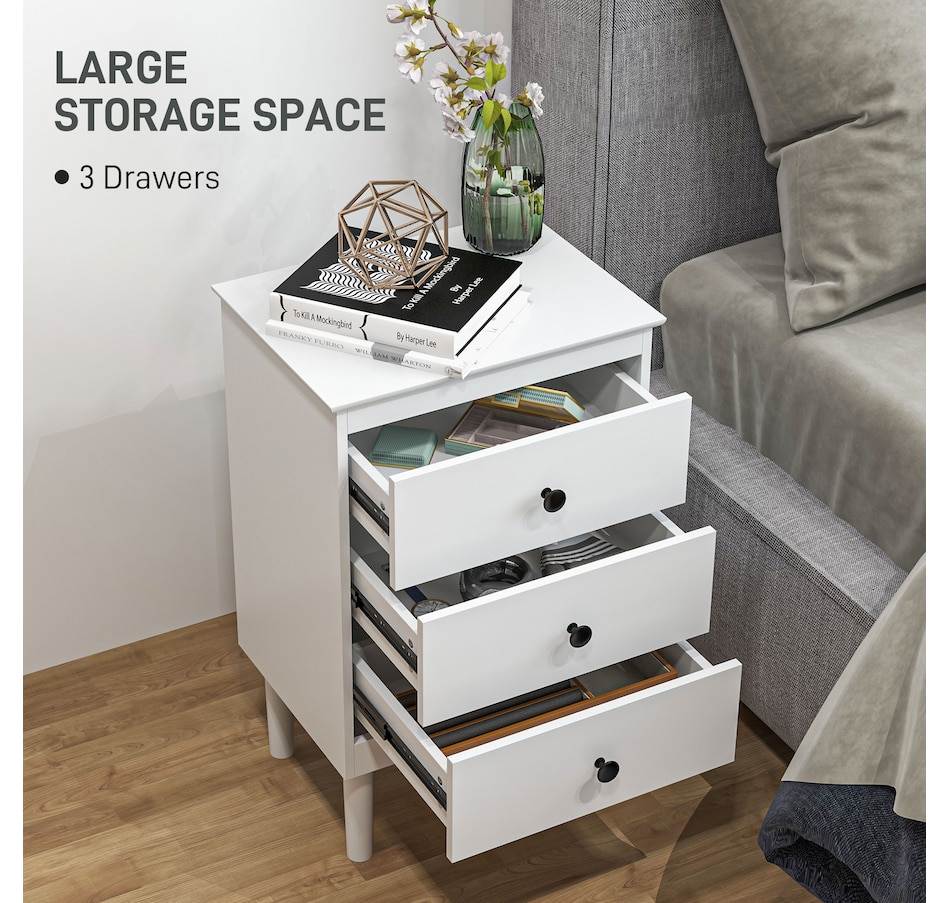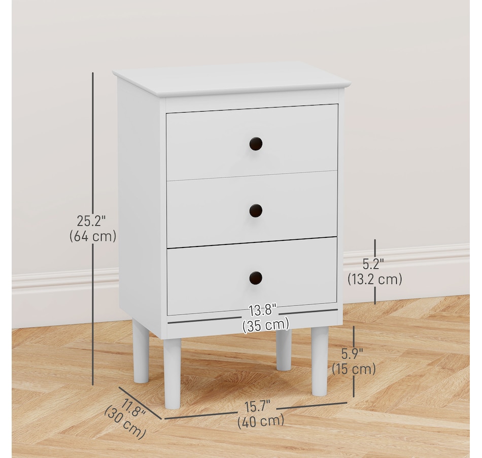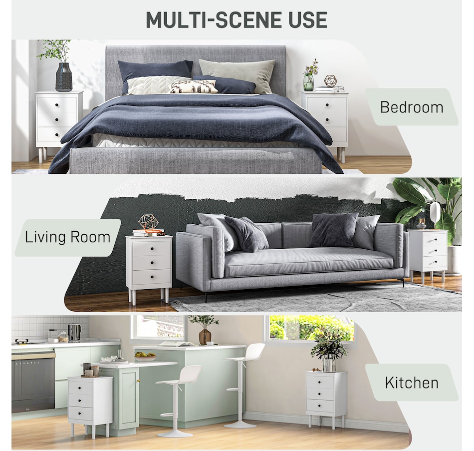 Simple style for all homes, offering plenty of nighttime space: say hello to these two HOMCOM bedside tables. In a clean white boxy design, they are super easy to welcome into your home interior style; the black handles add a touch of striking contrast. Three drawers offer handy holding room, with a flat tabletop to make space for essentials like an alarm clock. Made from particle board, each nightstand is reliable, with anti-tipping straps to securely fix to the wall.Features: