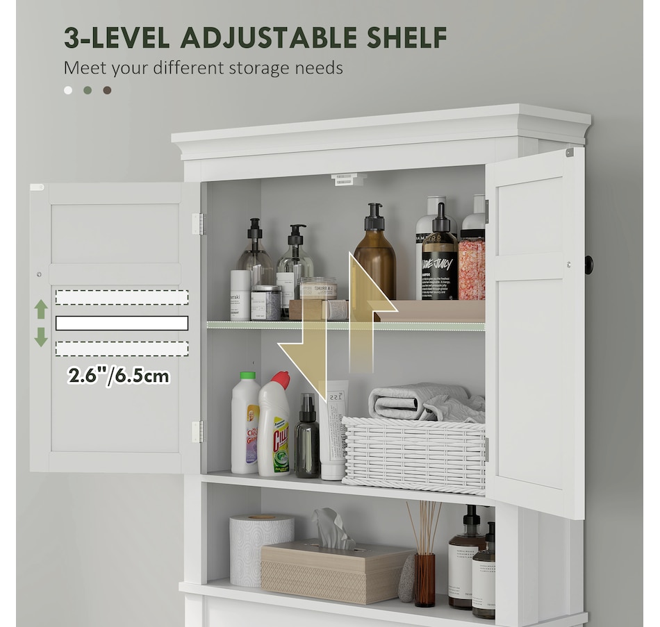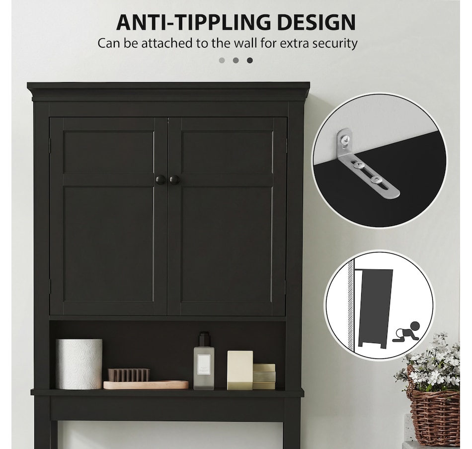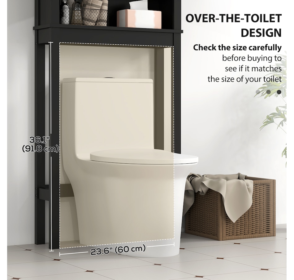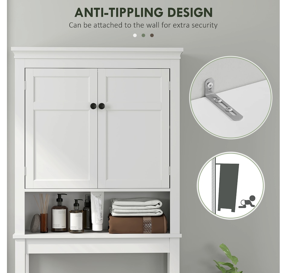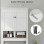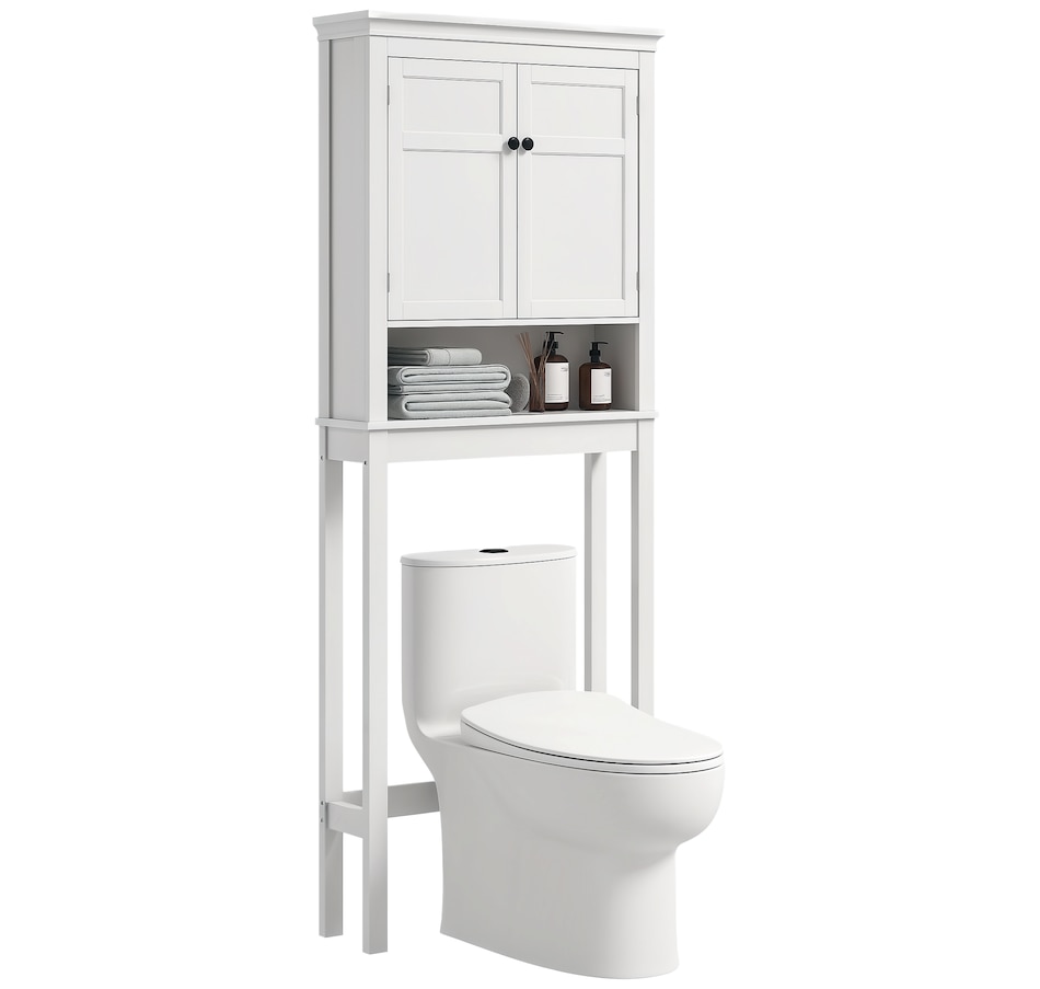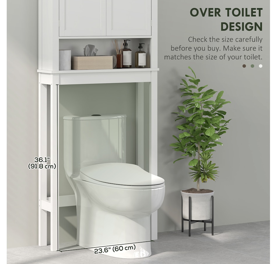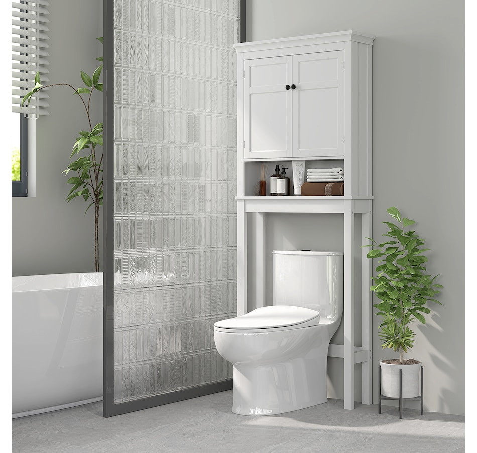 Maximize your space with the HOMCOM over toilet storage cabinet or washroom organizer! Designed to fit neatly above most standard toilets, this bathroom cabinet features a 2-tier cabinet and open shelf, turning clutter into organized bliss. An adjustable inner shelf adapts to your storage needs, while anti-tipping hardware ensures safety. Great for bathrooms, laundry rooms, and balconies.