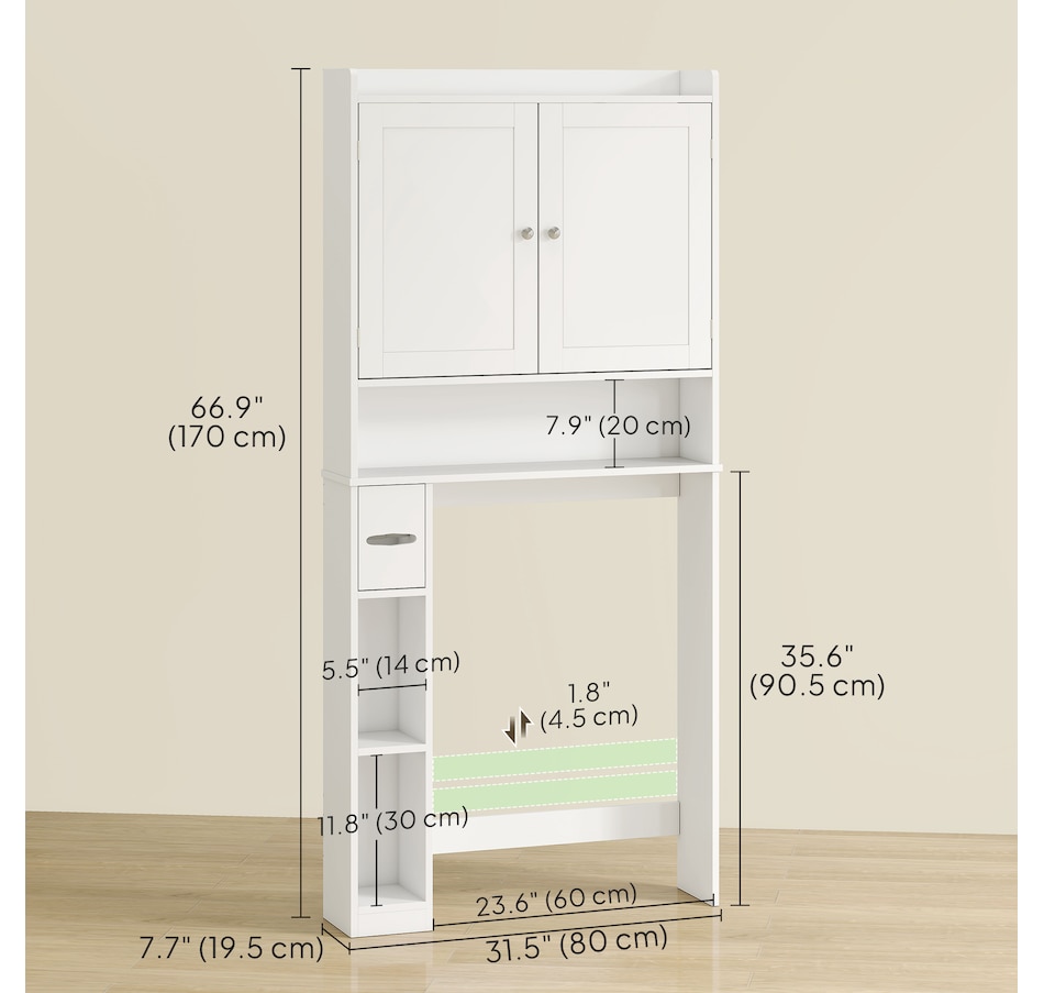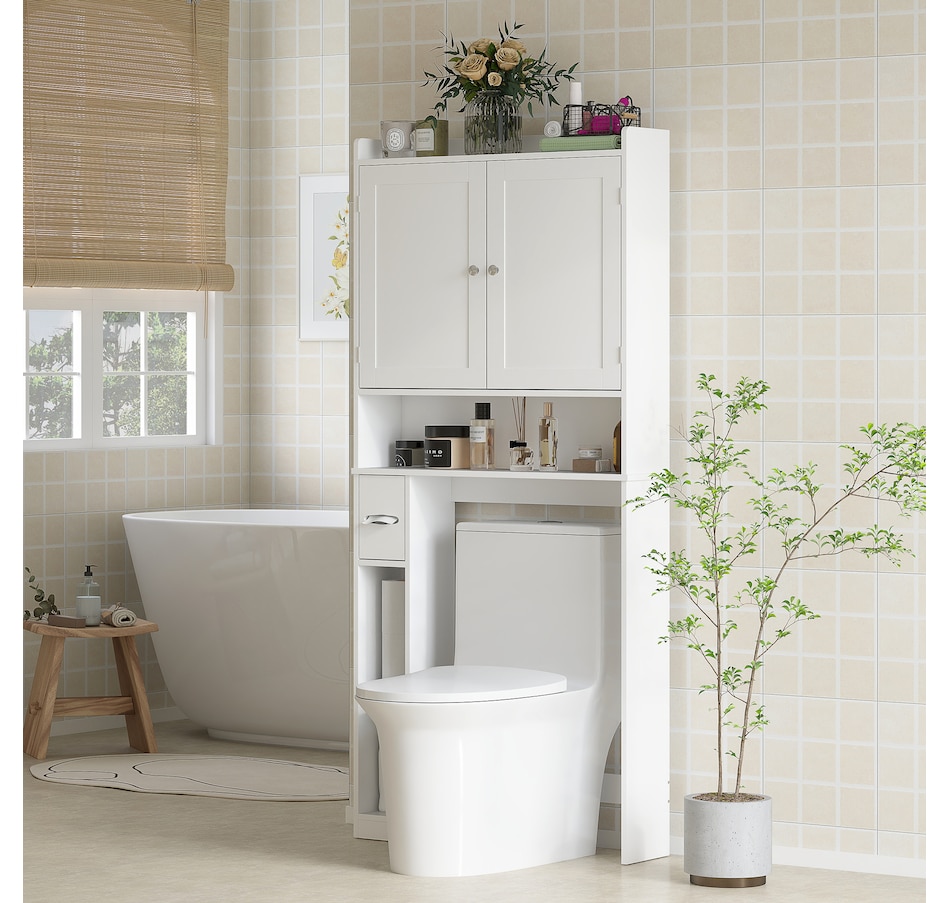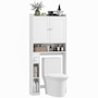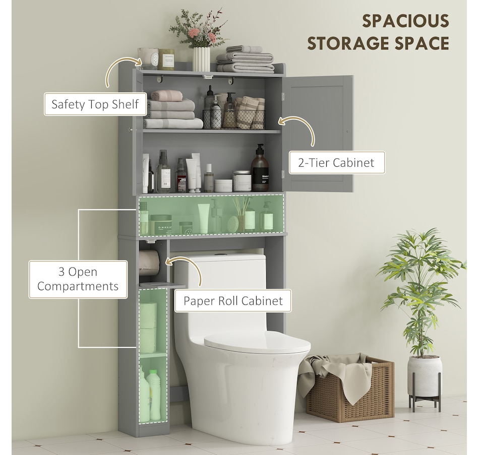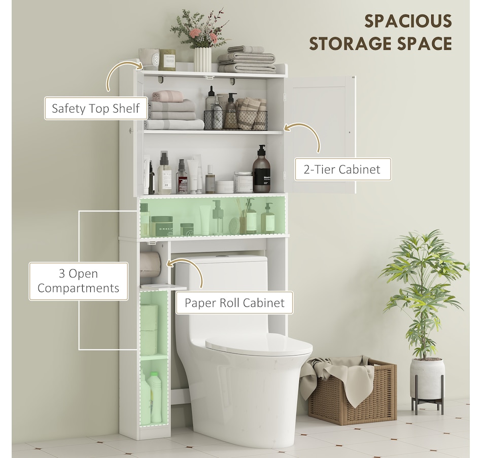 Maximize your bathroom space with the over the toilet storage cabinet from HOMCOM. Its spacious design includes a two-tier cabinet to neatly tuck away skincare items, three open compartments for easy access to daily essentials, an edged top shelf for safely displaying potted plants and a flip-down paper holder with a removable roll rod for added convenience. HOMCOM behind toilet bathroom organizer's modern look adds a sleek touch to your bathroom decor, ensuring style meets function.Features: