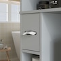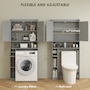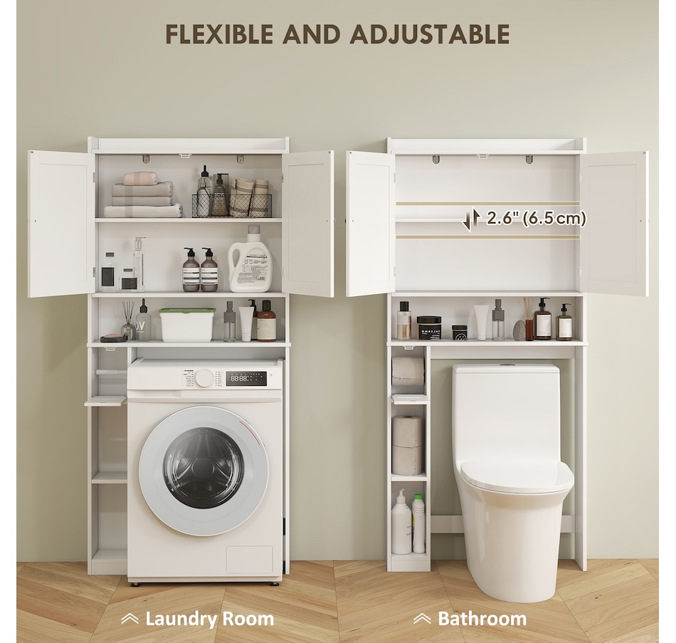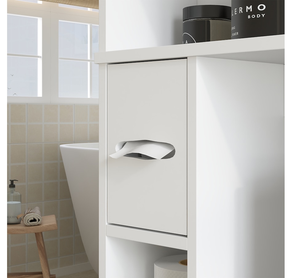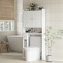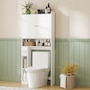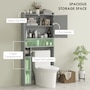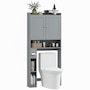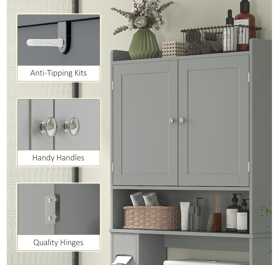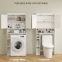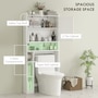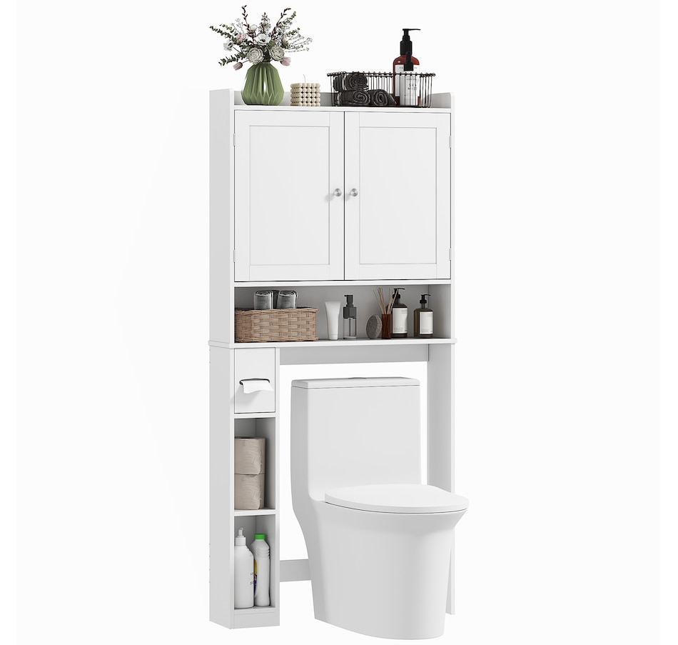 Maximize your bathroom space with the over the toilet storage cabinet from HOMCOM. Its spacious design includes a two-tier cabinet to neatly tuck away skincare items, three open compartments for easy access to daily essentials, an edged top shelf for safely displaying potted plants and a flip-down paper holder with a removable roll rod for added convenience. HOMCOM behind toilet bathroom organizer's modern look adds a sleek touch to your bathroom decor, ensuring style meets function.Features: