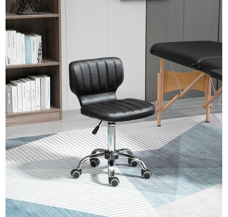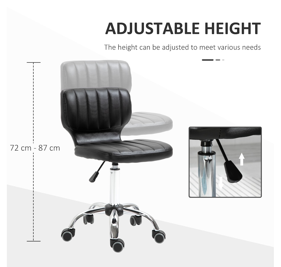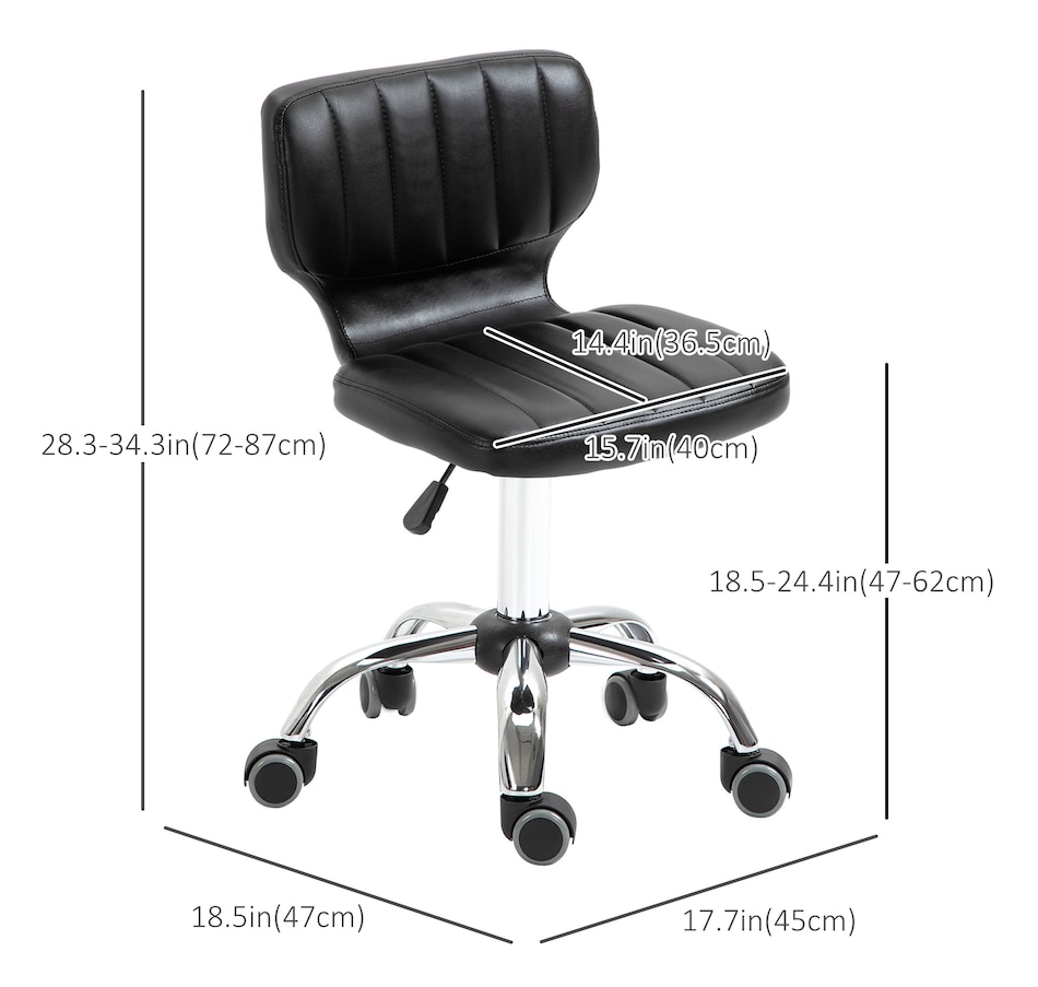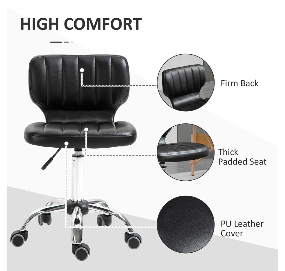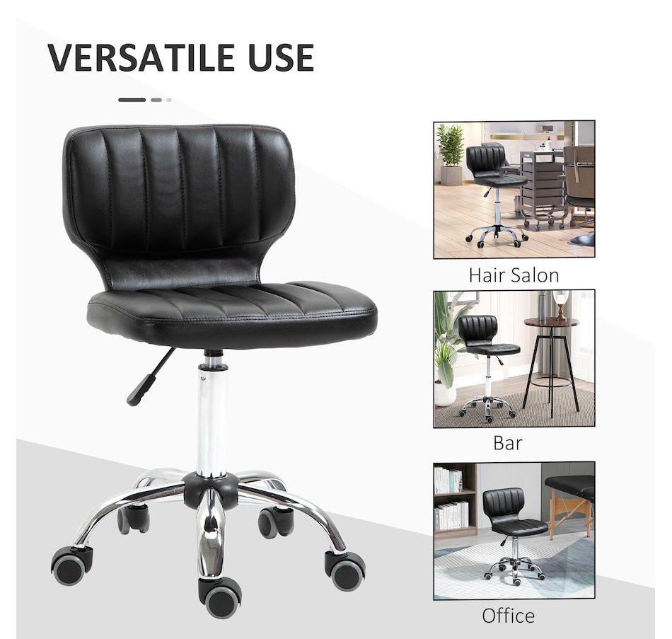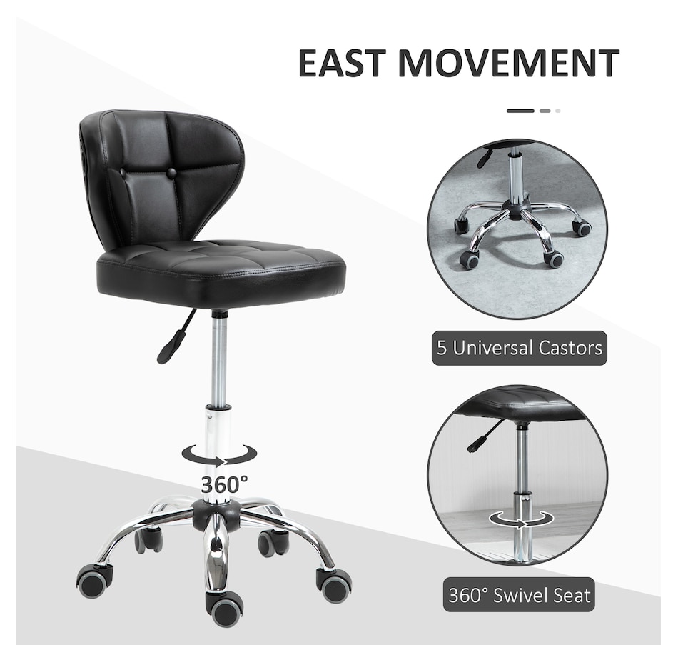 This salon chair from HOMCOM puts you at just the right height, helping to create a good working condition. Firm back and cushioned seat give you the comfort for the longer durations. PU leather cover is easy to maintain. You can adjust the seat height to meet different needs, which is so functional. 5 casters and swivel seat make it easy to slide around the working area. This chic adjustable stool will be a great addition to reception room, bar, beauty shop and more!Features: