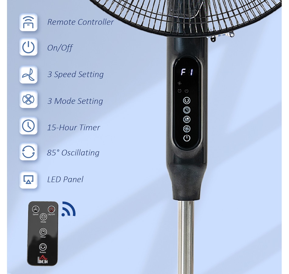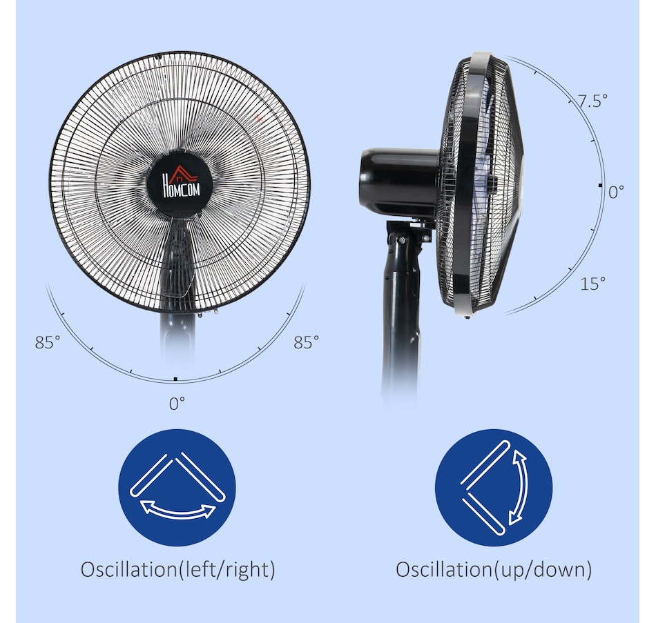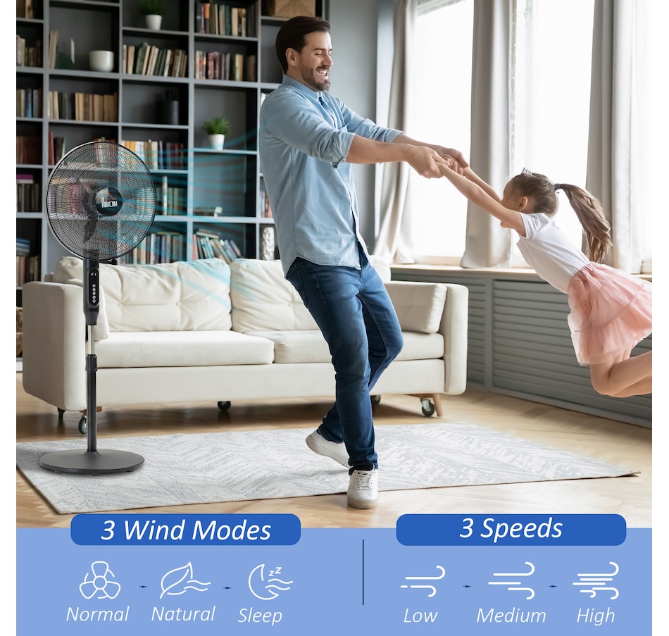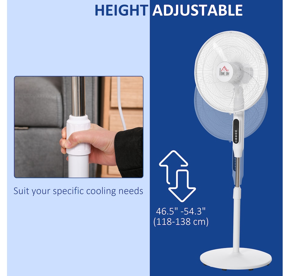Stay comfortably cool during those hot summer afternoons and nights with this electric fans for home from HOMCOM. It features 3 variable speed settings and 3 modes to meet different cooling needs. The oscillation function and adjustable height direct exactly the air flow where you require it to. 15-hour time offers you cooling breeze while saving energy. LED panel and remote controller making the operation easier. This pedestal fan is easy to use and the perfect addition to your home and office.
