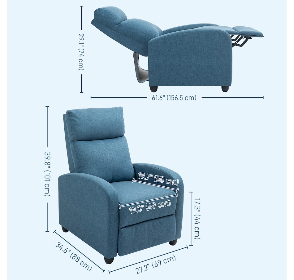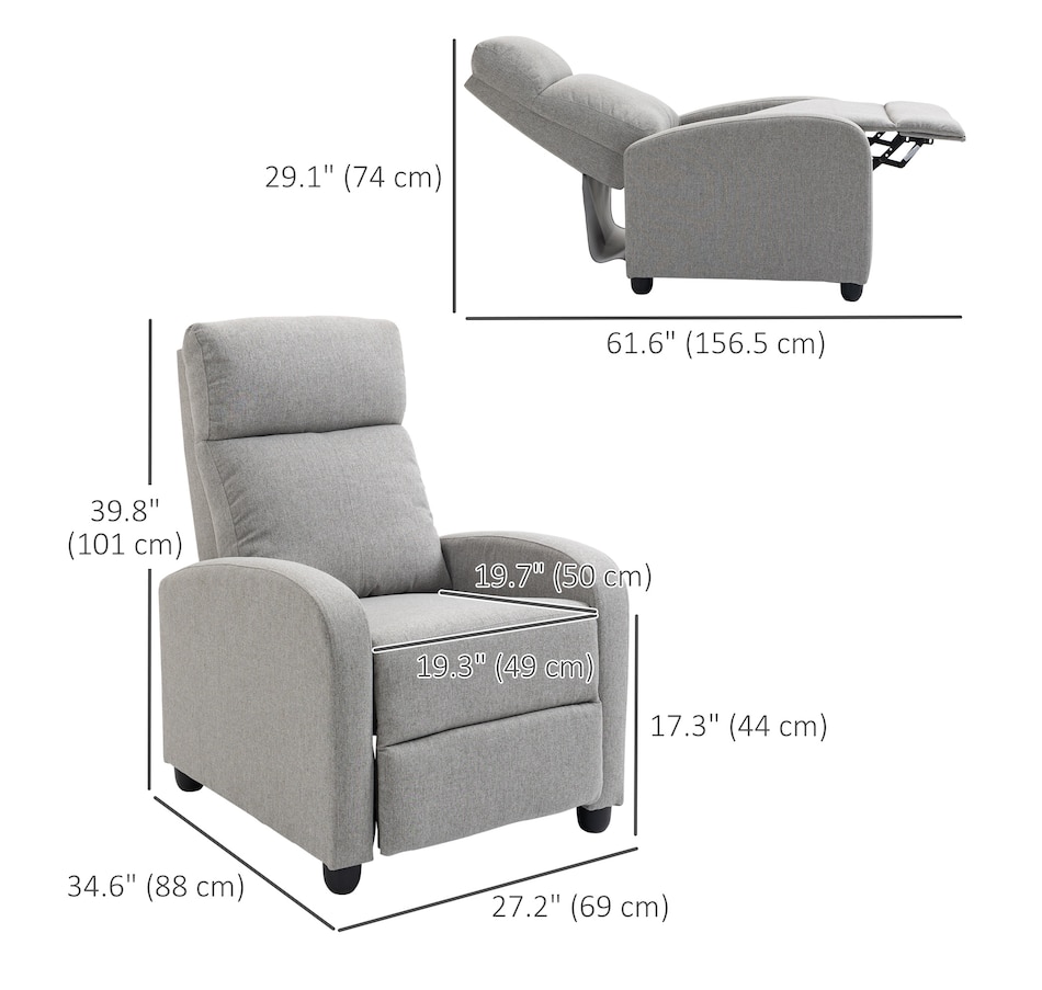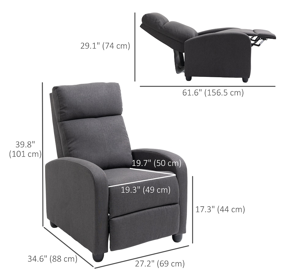 ● Reclining Dimension: 27.25"W x 61.5"D x 29.25"H;