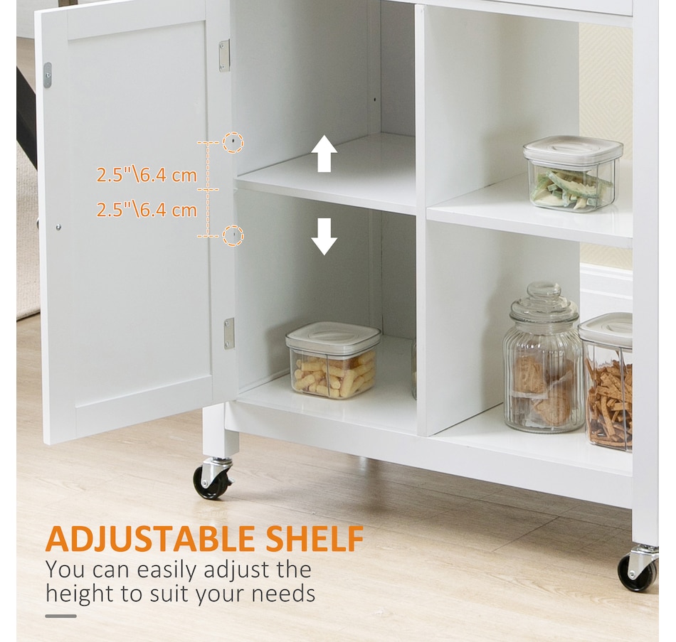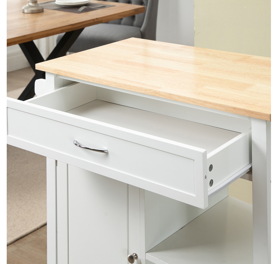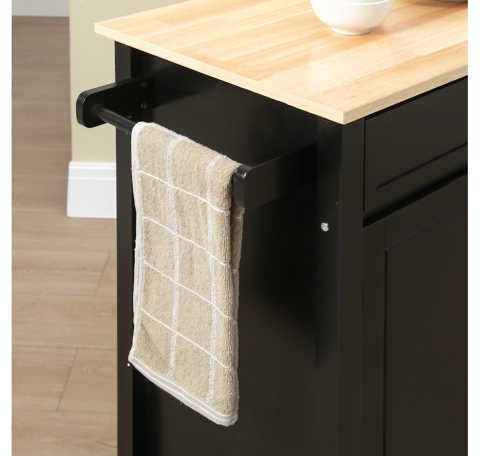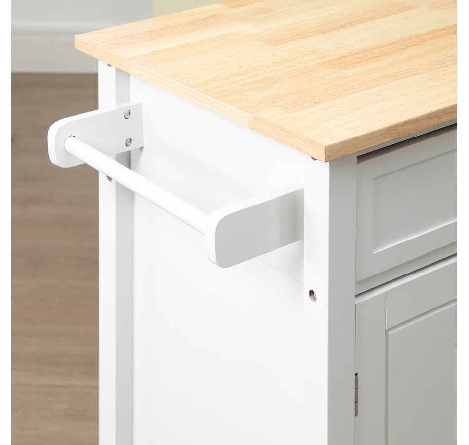 Make your home parties more convenient with this versatile kitchen cart on wheels. With its easy mobility, you can move it from room to room effortlessly. It features a practical drawer, a concealed cabinet, a 2-tier open shelf, and a towel rack, providing sufficient storage for your kitchen and dining essentials. Add this portable kitchen island to your kitchen space for a functional and stylish helper.