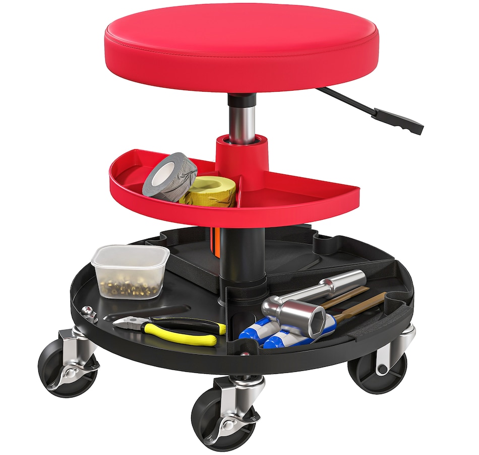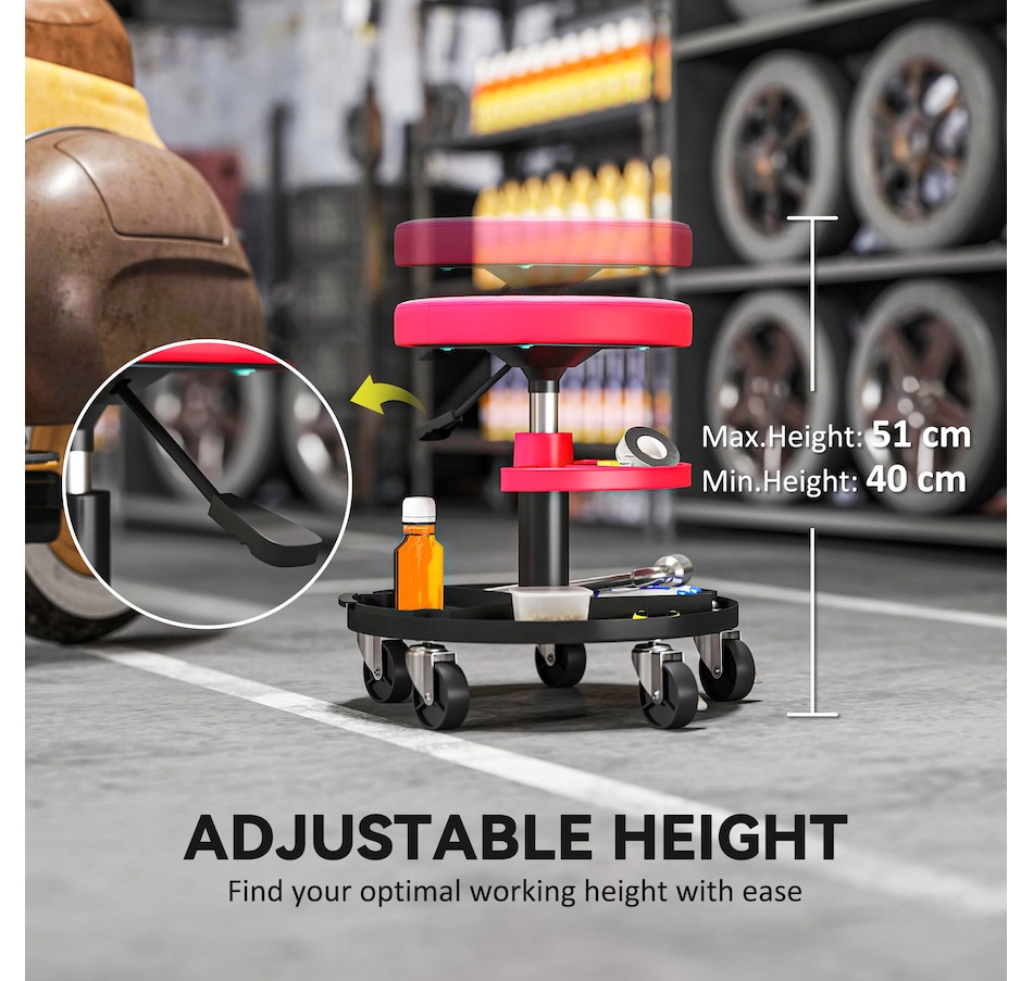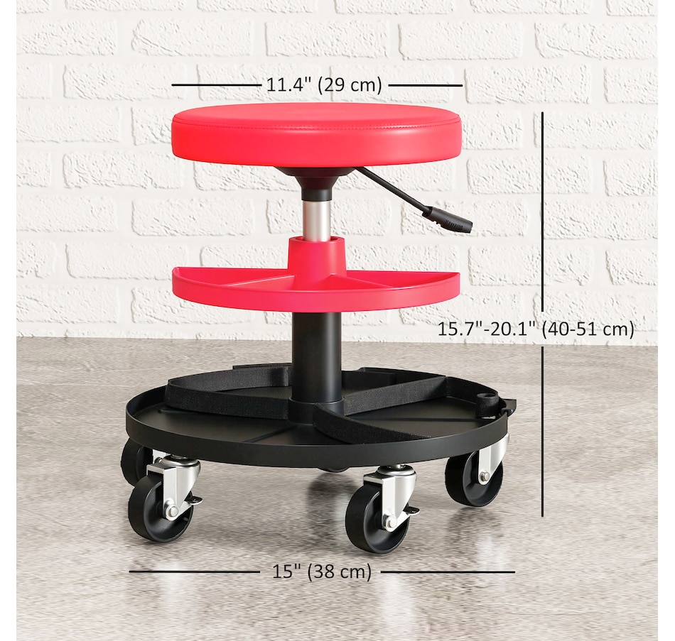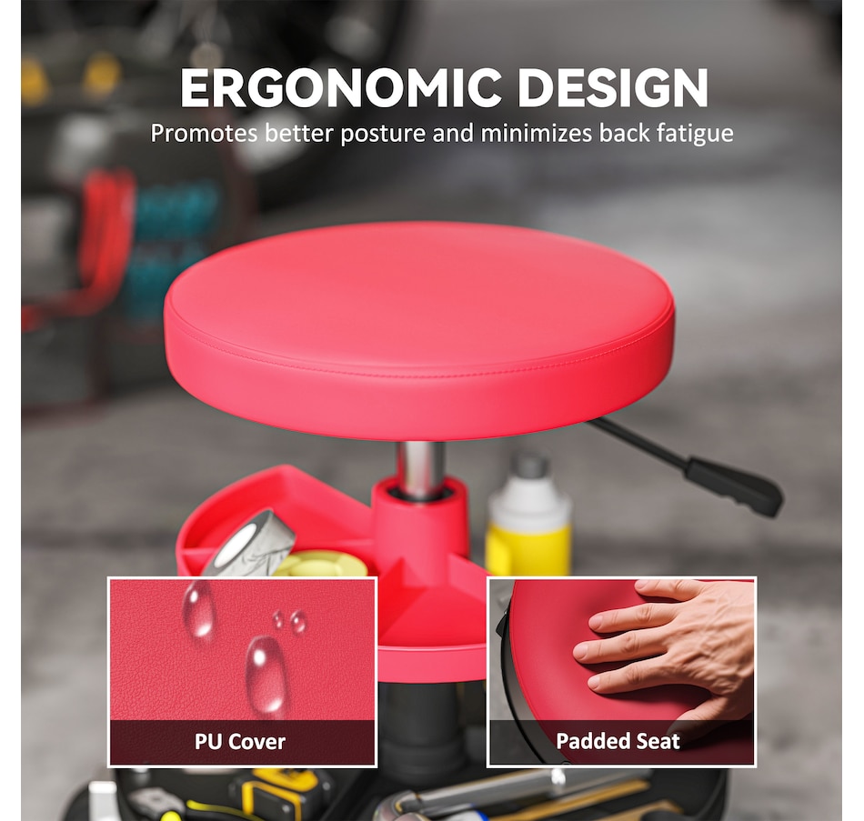 Transform your garage workspace with the HOMCOM Mechanic Roller Seat. Engineered from robust steel, this workshop stool supports up to 300 lbs (135 kg) and boasts a pneumatic height adjustment for optimal comfort. Complete with scratch-resistant leather and a plush cushion, it eases fatigue while the smooth 360° casters ensure effortless mobility around your work area.Features: