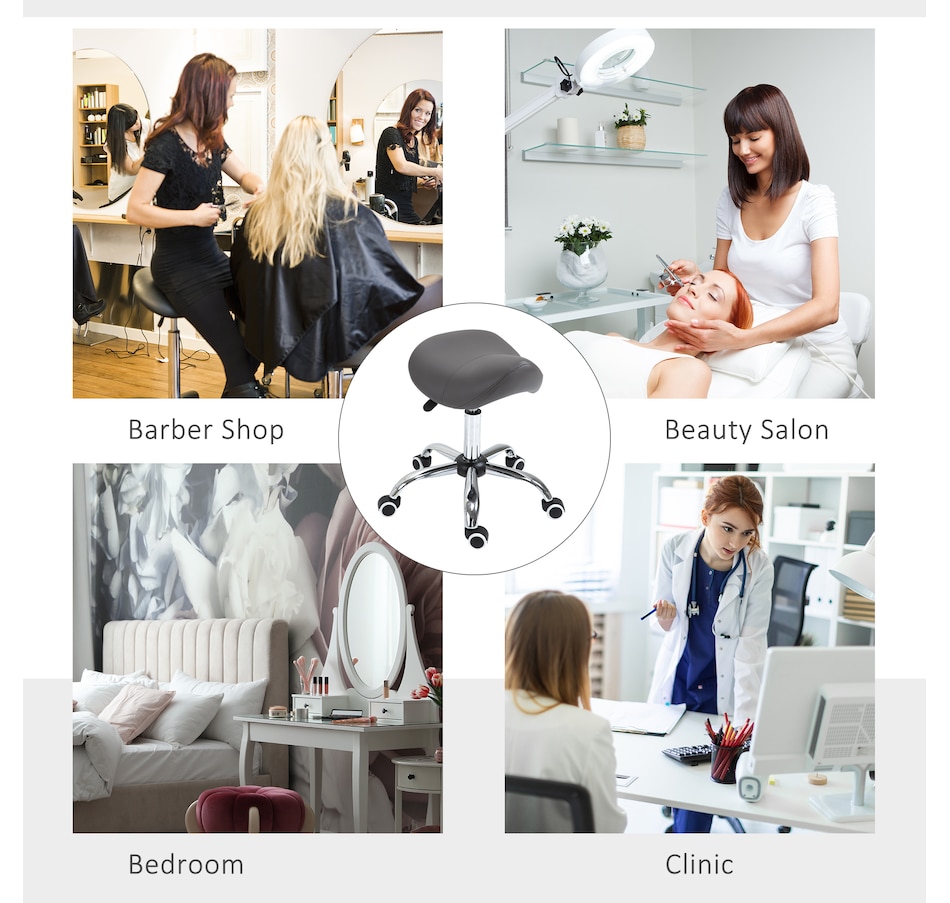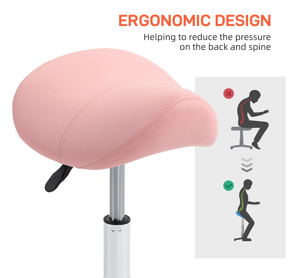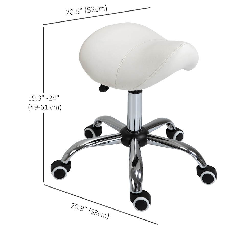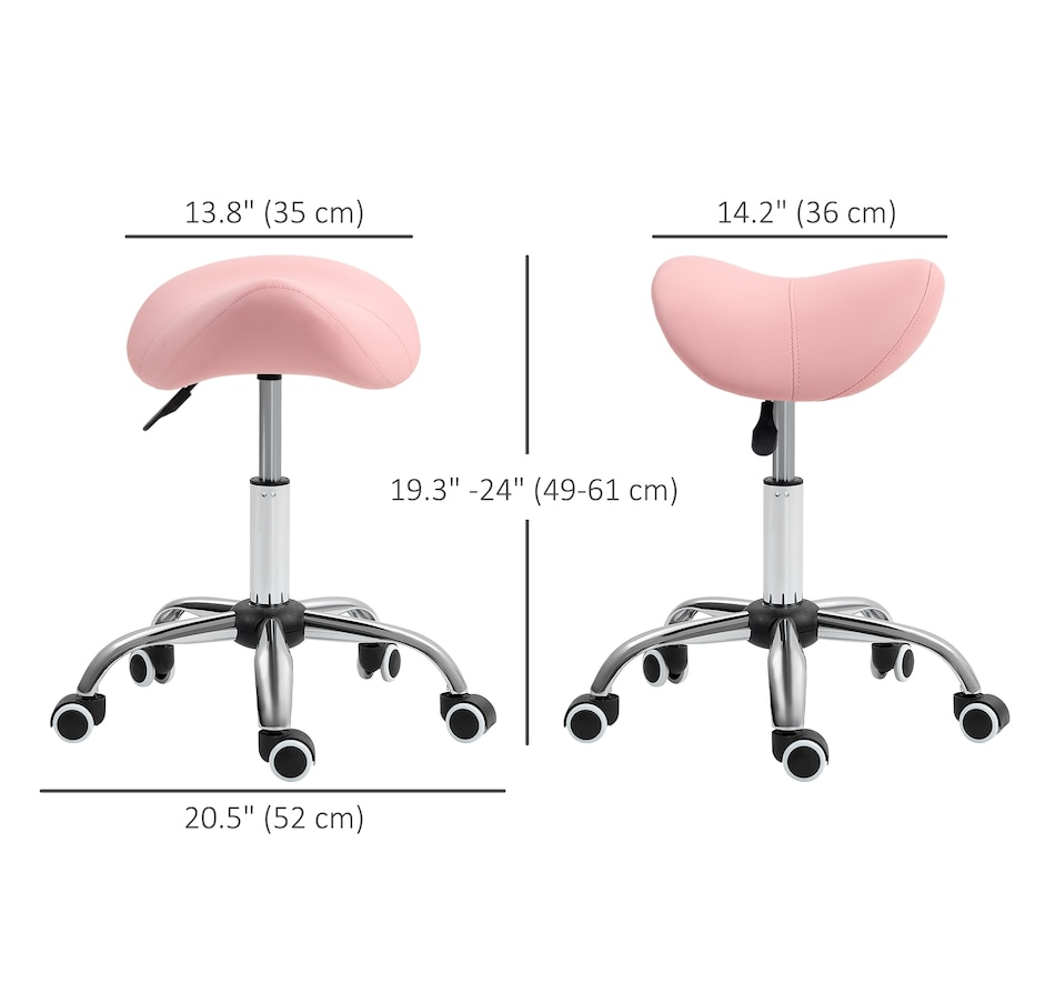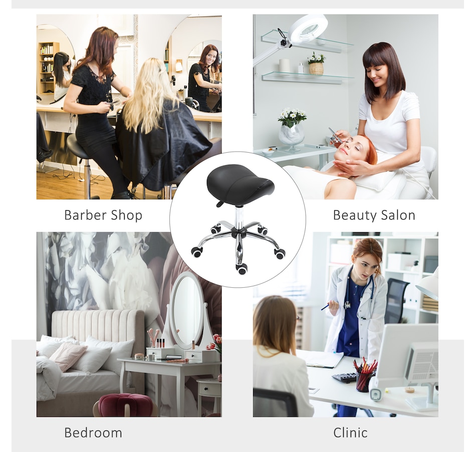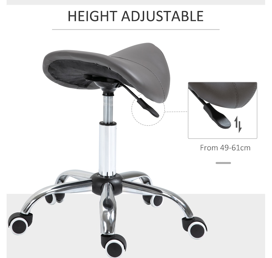 Ensure you have the correct posture when work in your saloon/tattoo parlour, or even at home, with this hairdressing chair from HOMCOM. A heavy metal base provides balance and stability, with an adjustable height between 49cm and 61cm — set this stool to your preferred level. The moulded seat is padded, for comfort and posture support. Five wheels to move around easily whilst seated.Features: