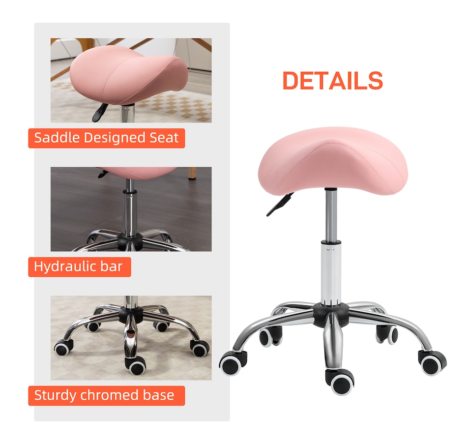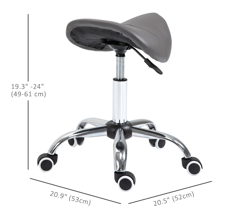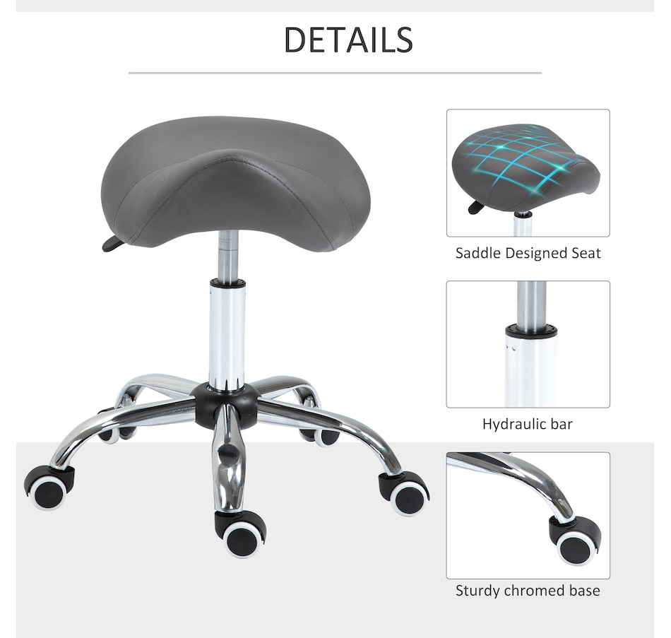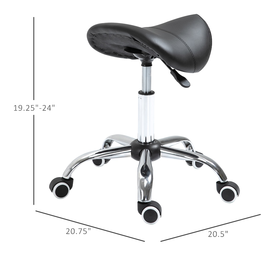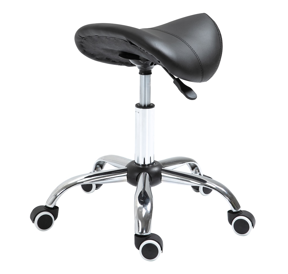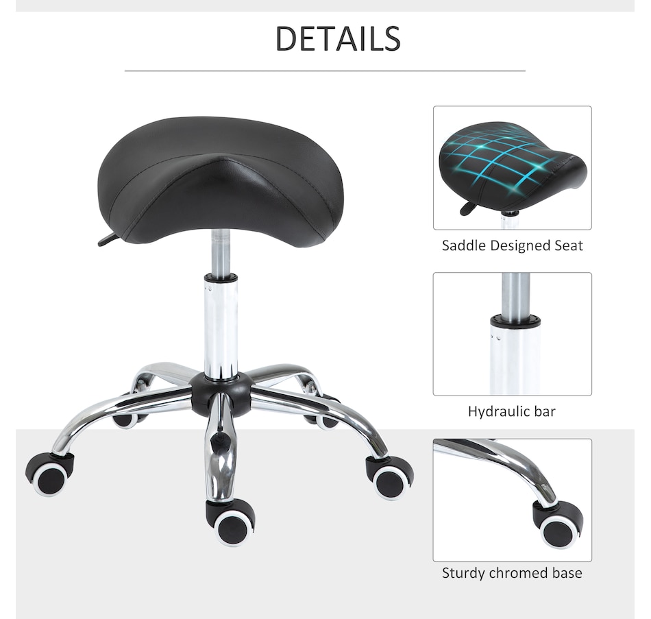 Ensure you have the correct posture when work in your saloon/tattoo parlour, or even at home, with this hairdressing chair from HOMCOM. A heavy metal base provides balance and stability, with an adjustable height between 49cm and 61cm — set this stool to your preferred level. The moulded seat is padded, for comfort and posture support. Five wheels to move around easily whilst seated.Features: