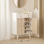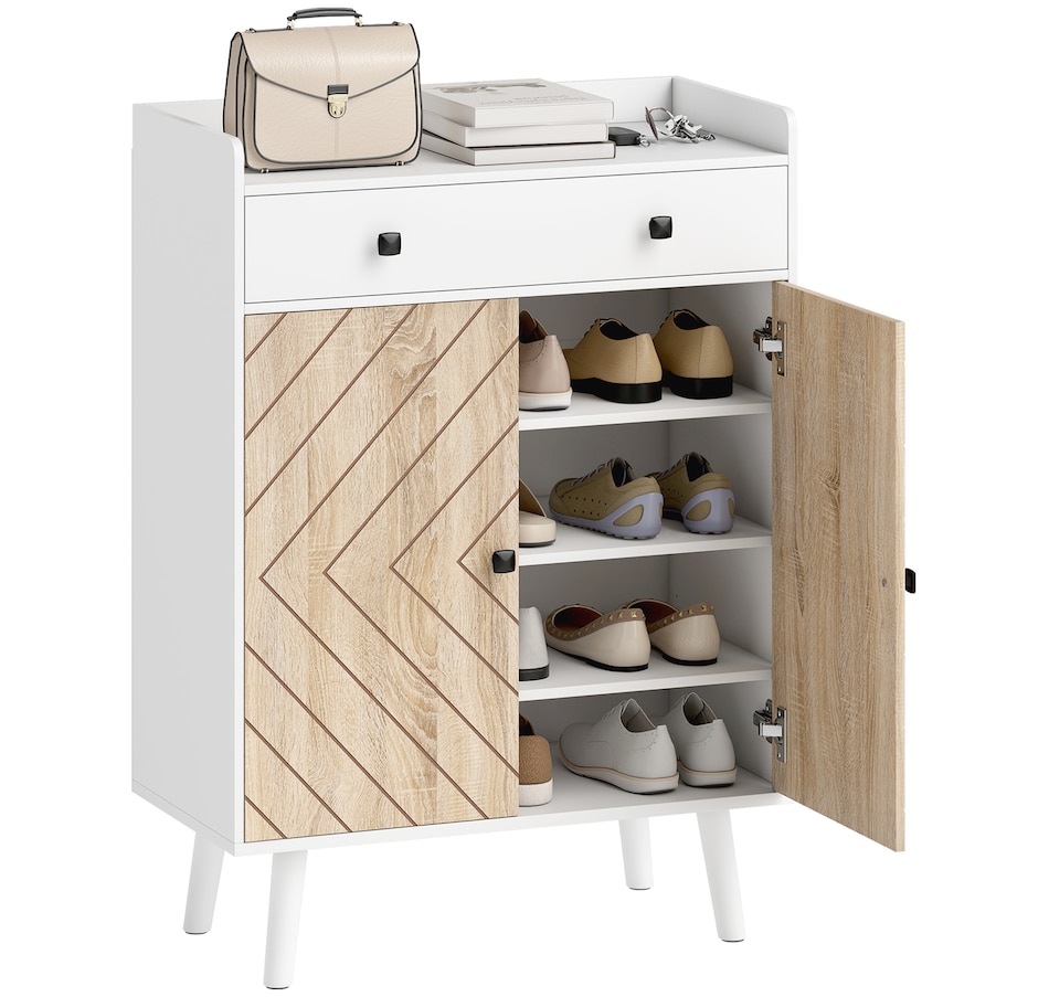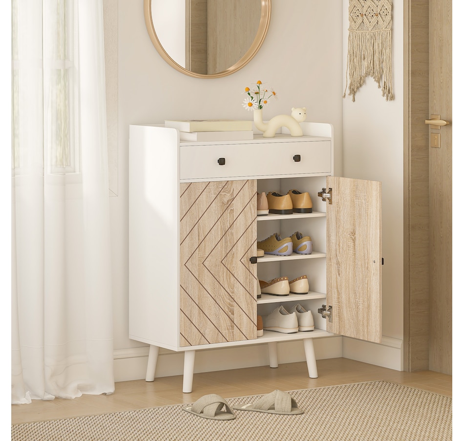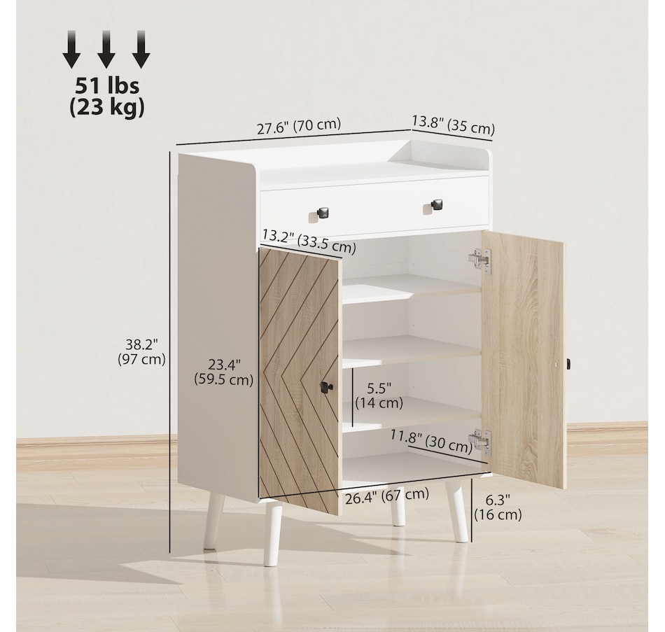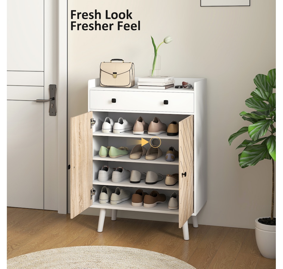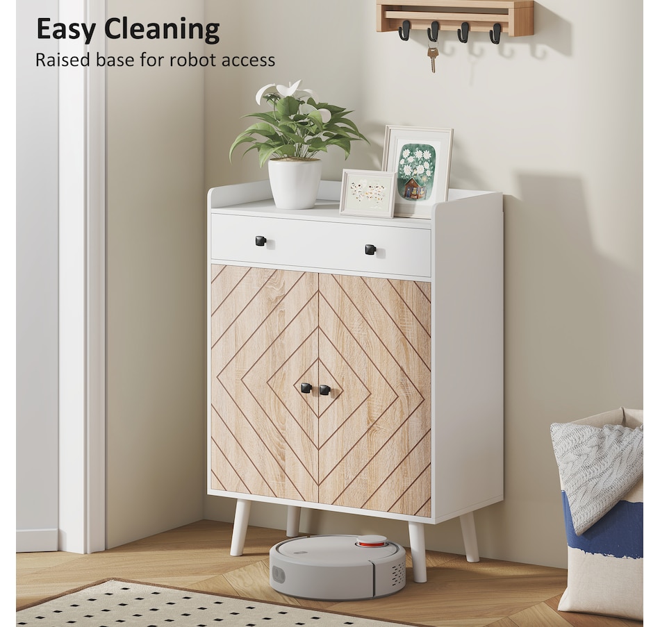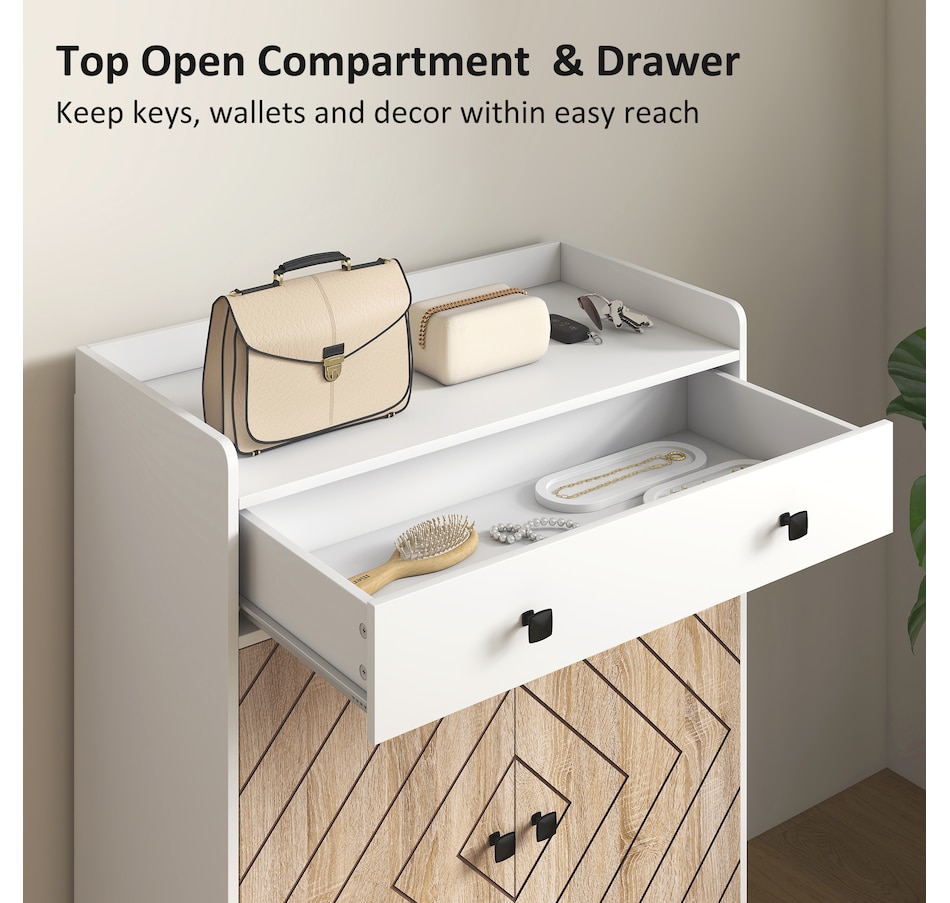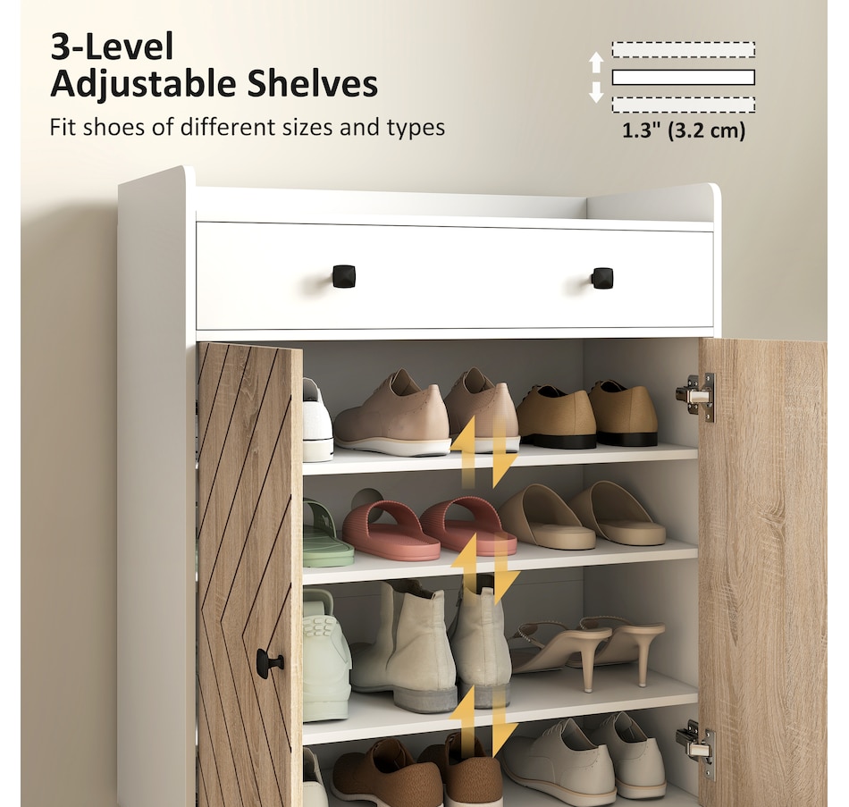 Tired of a cluttered entryway and misplaced essentials? The HOMCOM shoe storage cabinet offers the great solution. Its adjustable shelves and convenient drawer keep shoes, keys, and wallets neatly organized, transforming your space. This modern entryway cabinet, with sleek white and wood grain design, enhances any home. Crafted from robust particleboard, this shoe cabinet includes non-slip foot pads and anti-tipping kit, ensuring safety and peace of mind for families.Features: