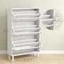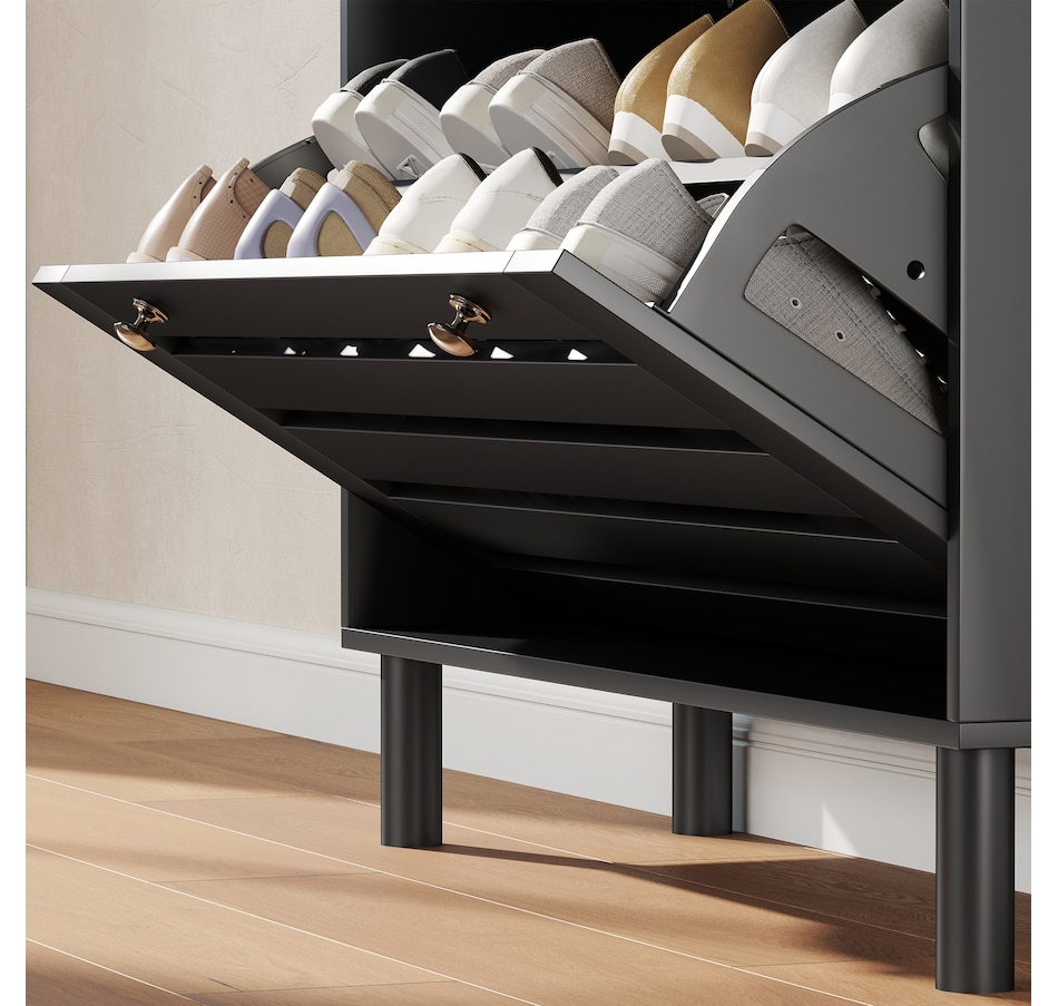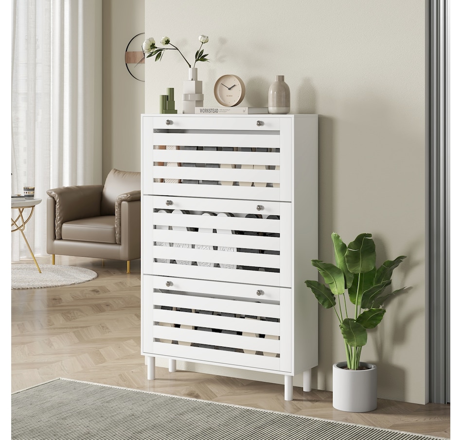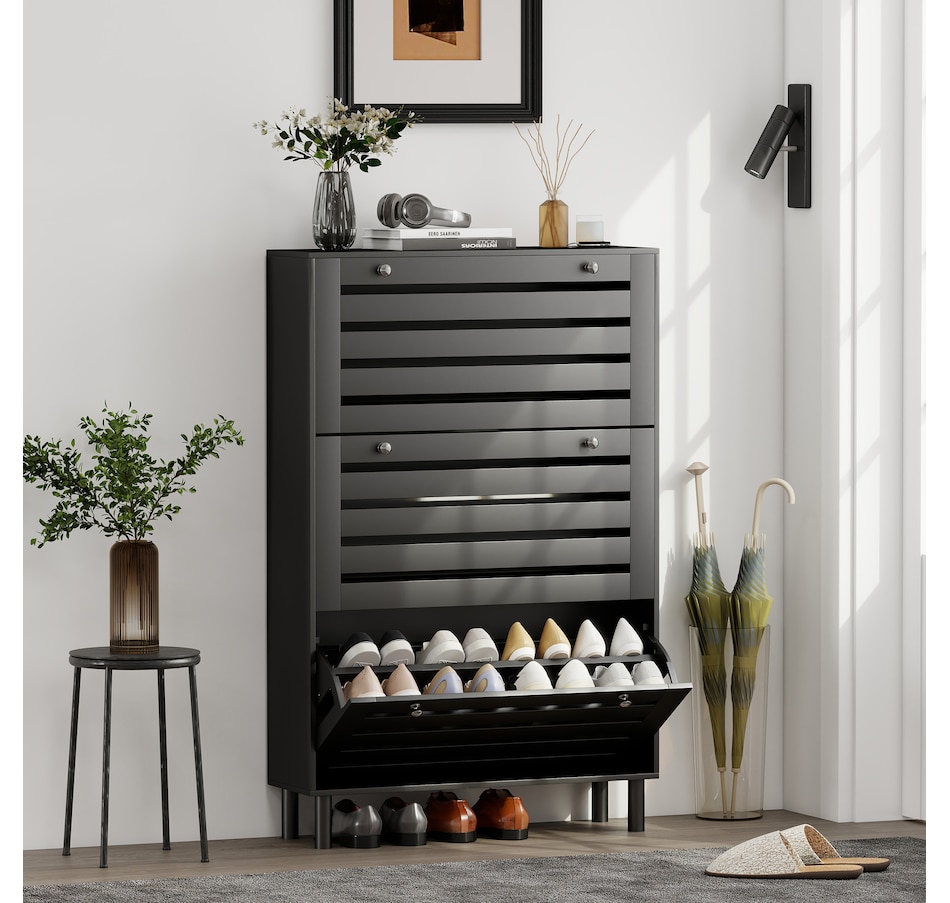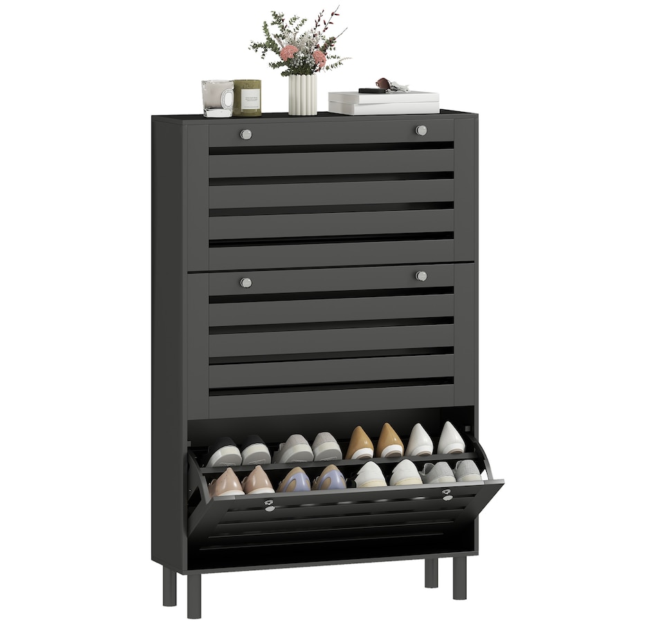 ● Can store up to 24 pairs of shoes in 3 flip down drawers;