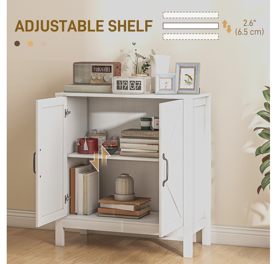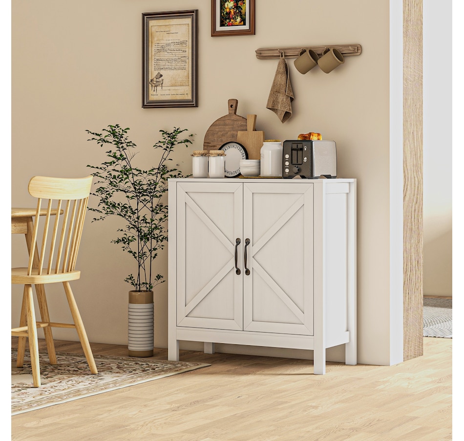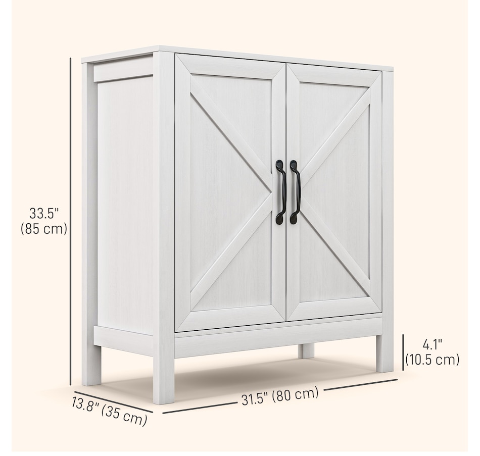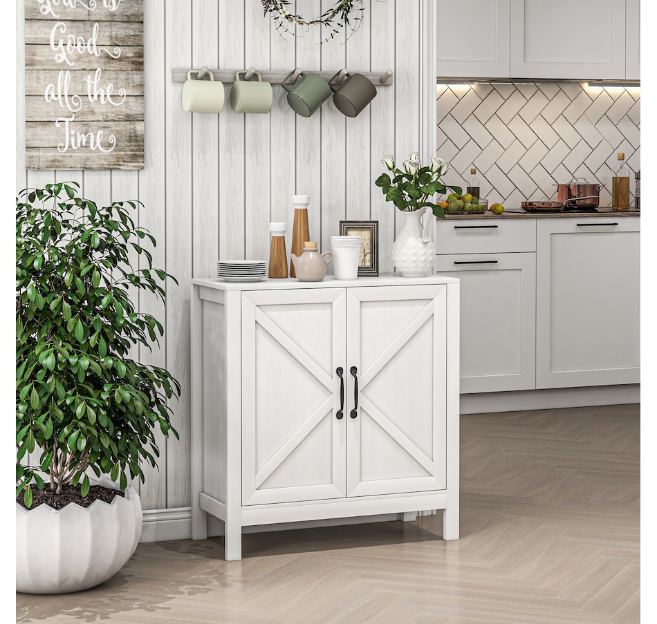 Experience a new storage level with the HOMCOM Modern Farmhouse Style Kitchen Storage Cabinet. This exceptional piece features a barn door design in a wood grain finish, a unique touch that effortlessly complements any decor. Its adjustable shelving is a game-changer, accommodating everything from kitchenware to media devices, making it a versatile addition to your entryway or kitchen. With its standout design and practical features, this storage solution is a must-have for any home!
