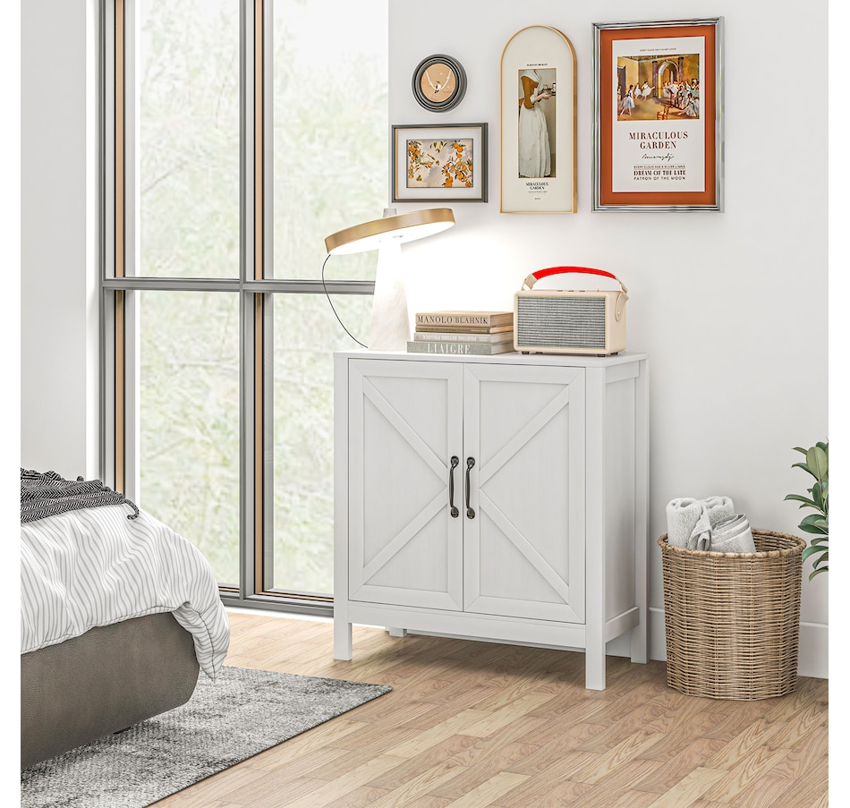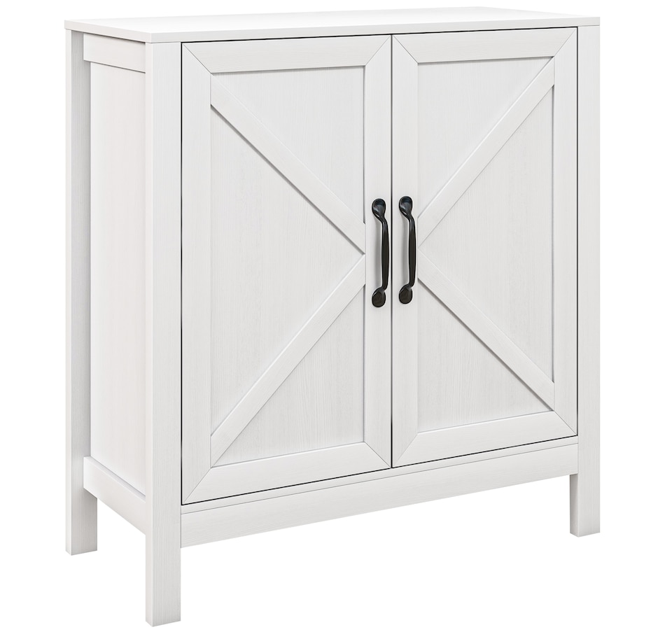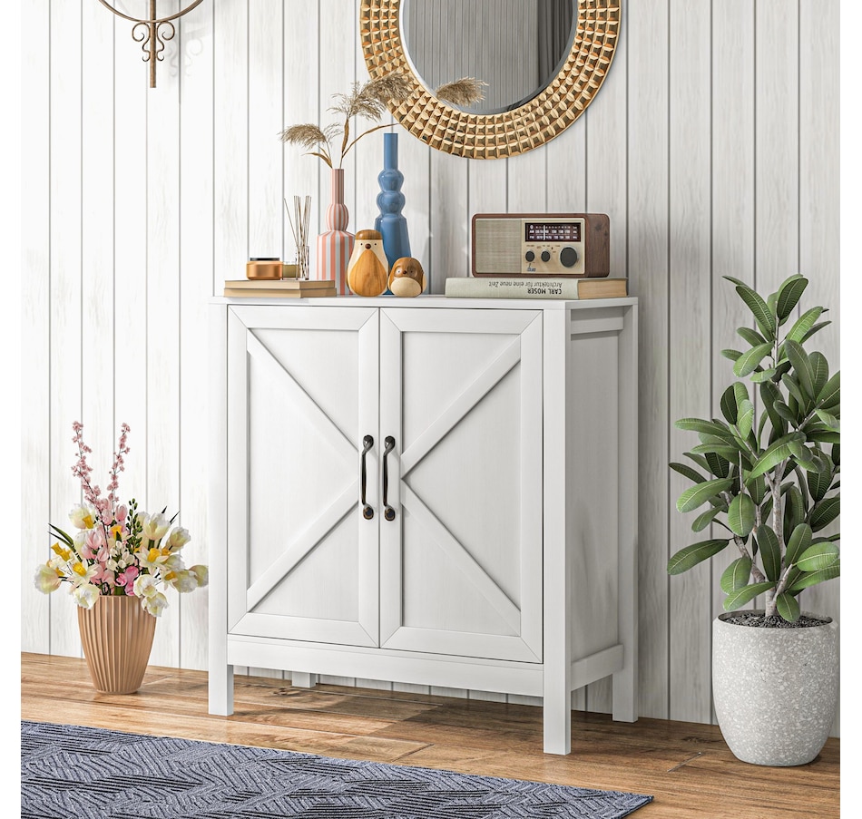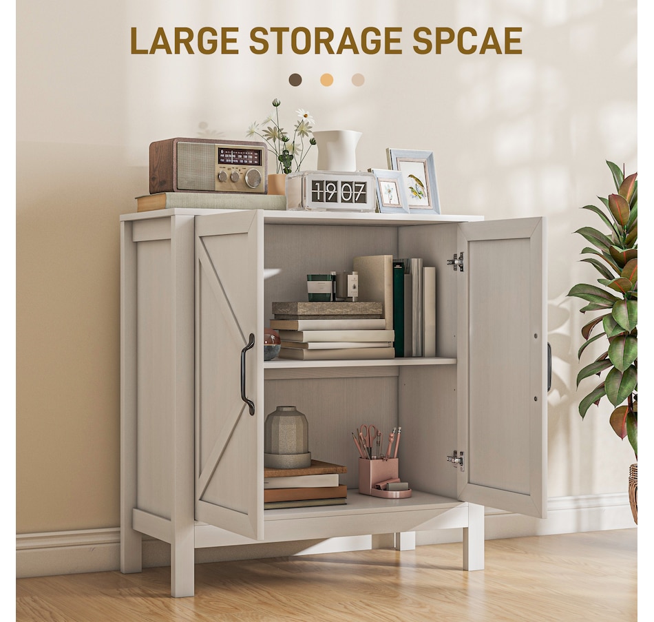 Experience a new storage level with the HOMCOM Modern Farmhouse Style Kitchen Storage Cabinet. This exceptional piece features a barn door design in a wood grain finish, a unique touch that effortlessly complements any decor. Its adjustable shelving is a game-changer, accommodating everything from kitchenware to media devices, making it a versatile addition to your entryway or kitchen. With its standout design and practical features, this storage solution is a must-have for any home!
