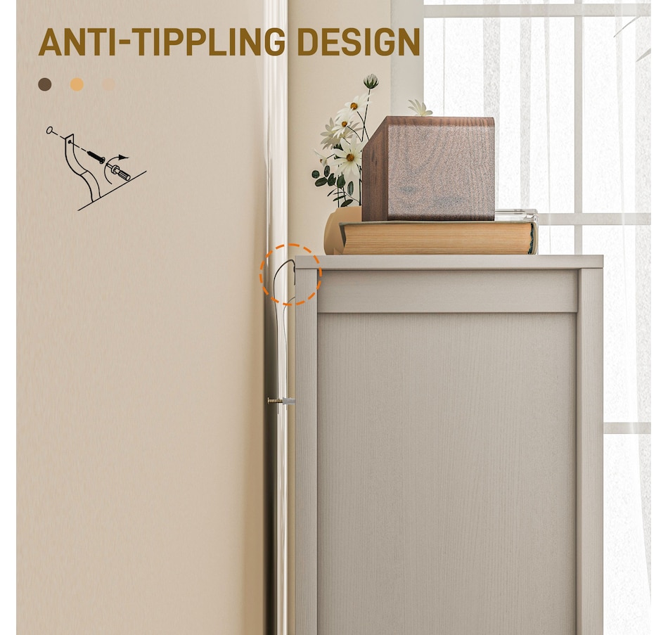● Solid particle board construction, metal hinges, and an anti-tip kit for enhanced stability;