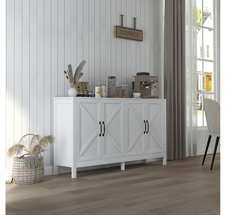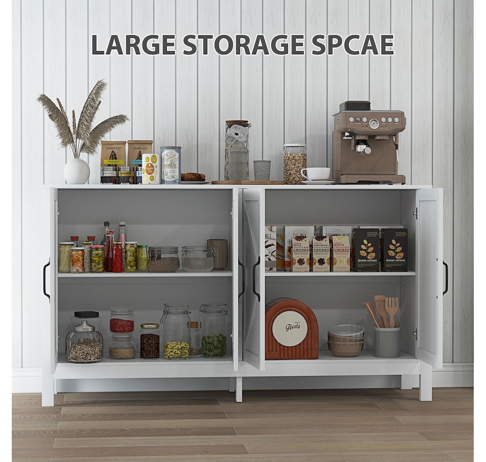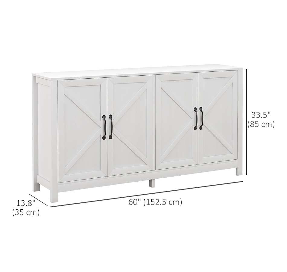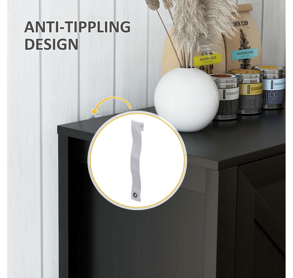 Experience a new storage level with the HOMCOM Modern Farmhouse Style Kitchen Storage Cabinet. This exceptional piece features a barn door design in a wood grain finish, a unique touch that effortlessly complements any decor. Its adjustable shelving is a game-changer, accommodating everything from kitchenware to media devices, making it a versatile addition to your entryway or kitchen. With its standout design and practical features, this storage solution is a must-have for any home!Features: