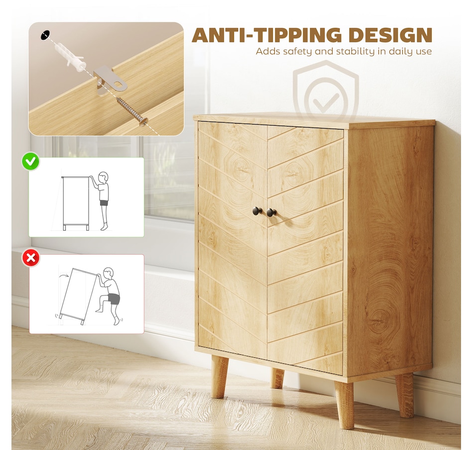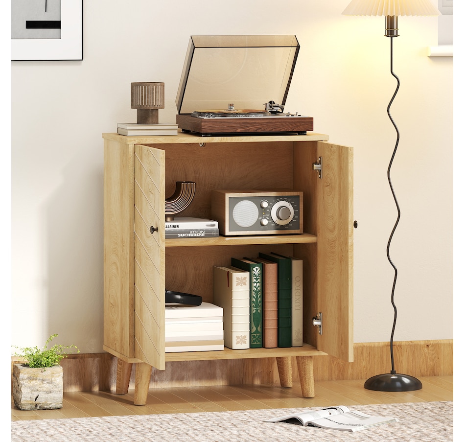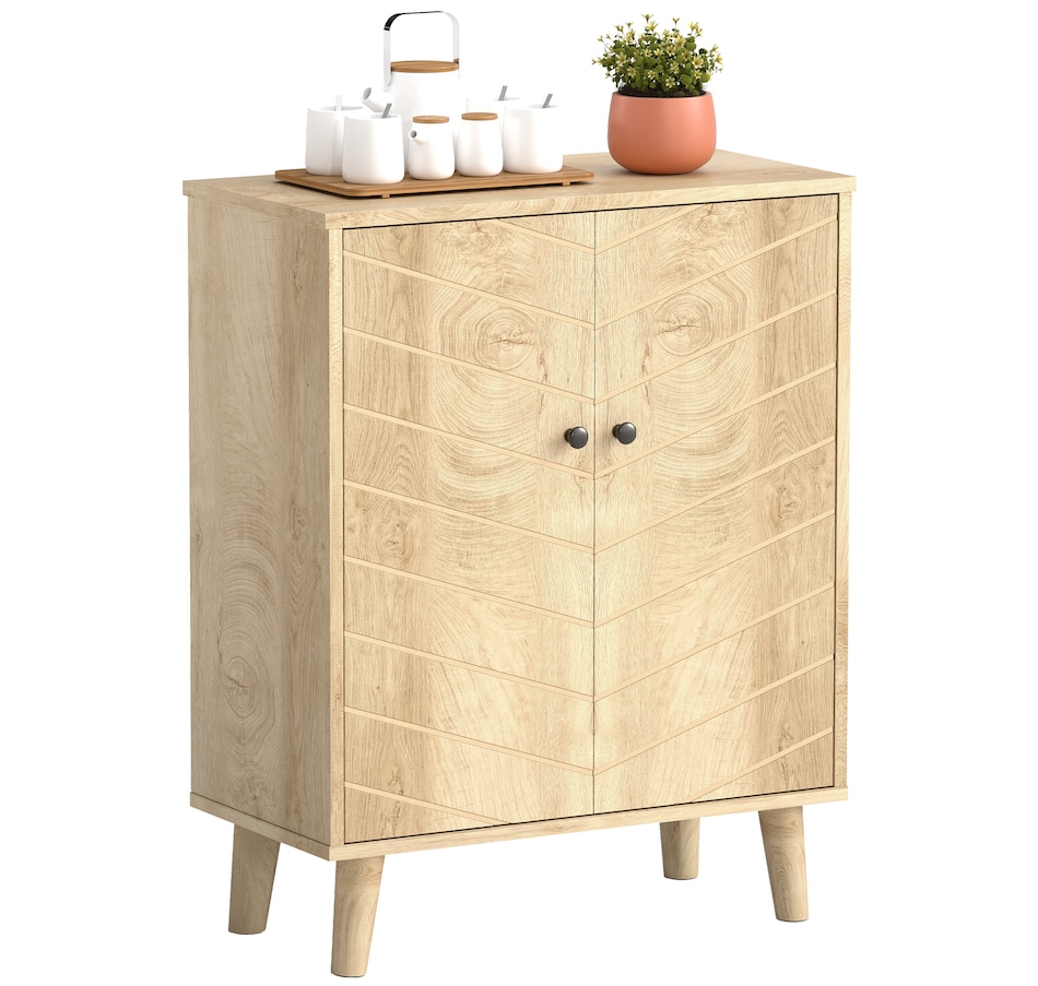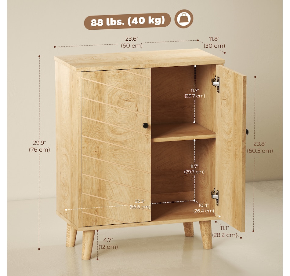Keep your home stylish and the space tidy: look no further than this freestanding accent cabinet from HOMCOM. It comes with a two-tier cabinet, offering enough storage for your daily items. Also, includes a tabletop for displaying small decorations. The wood-look texture with retro handles creates a vintage look, something different for your home space. An excellent cabinet for your living room, or entryway.Features: