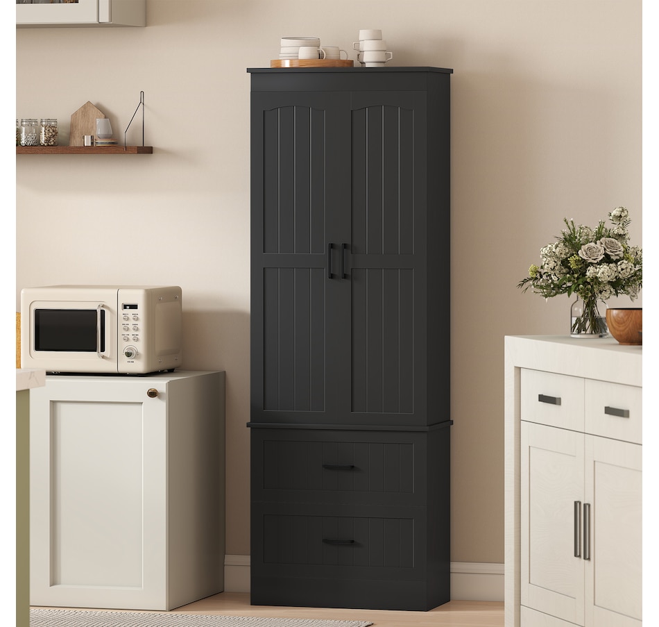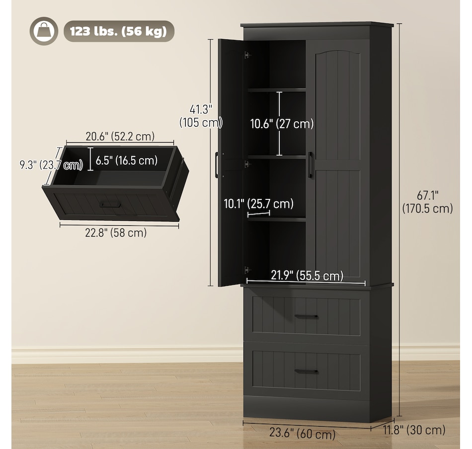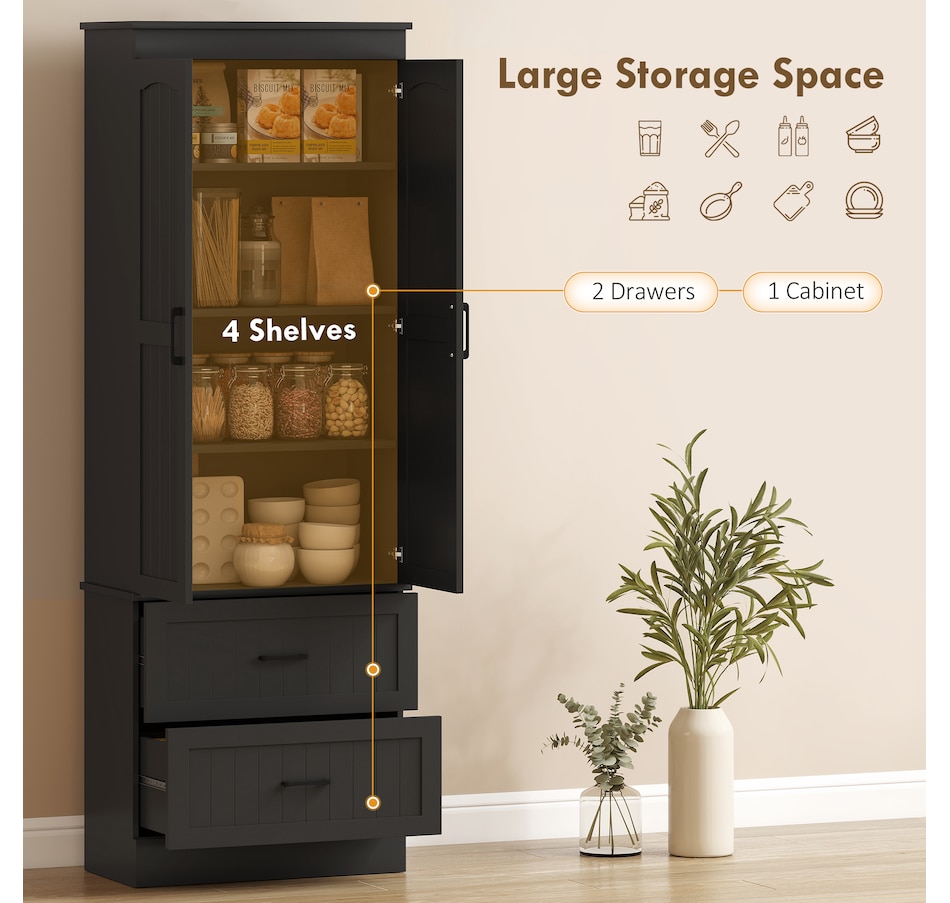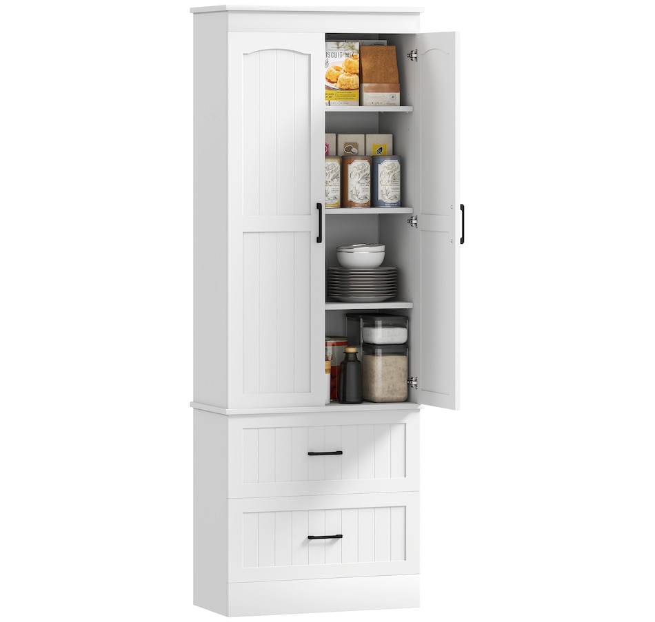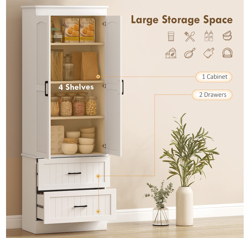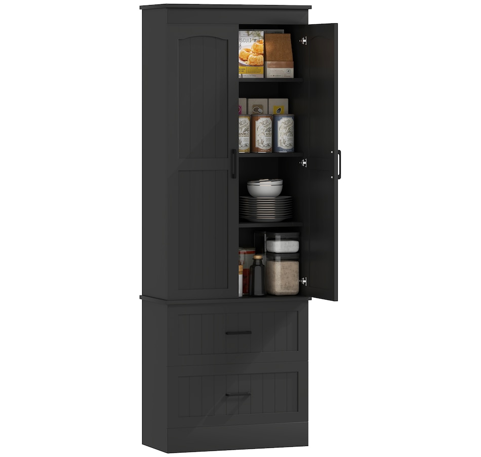 Tired of a chaotic kitchen pantry where nothing fits? The daily struggle of cramming in tall cereal boxes and the jarring sound of a drawer shattering the morning calm can be frustrating. This HOMCOM pantry cabinet restores tranquility. Its adjustable shelves create flexible space for all your items, while two drawers glide open silently. Finally, a tall cabinet that brings effortless organization and peaceful starts to your day.