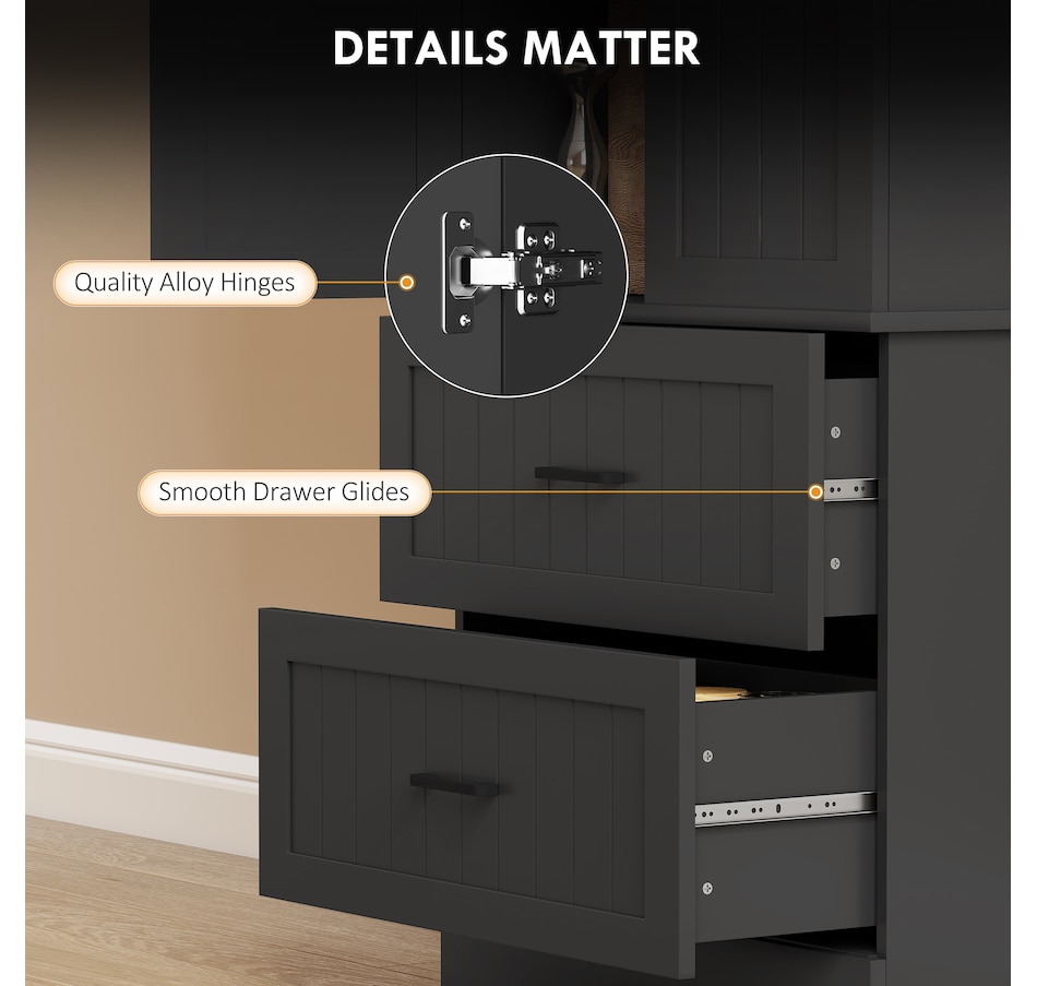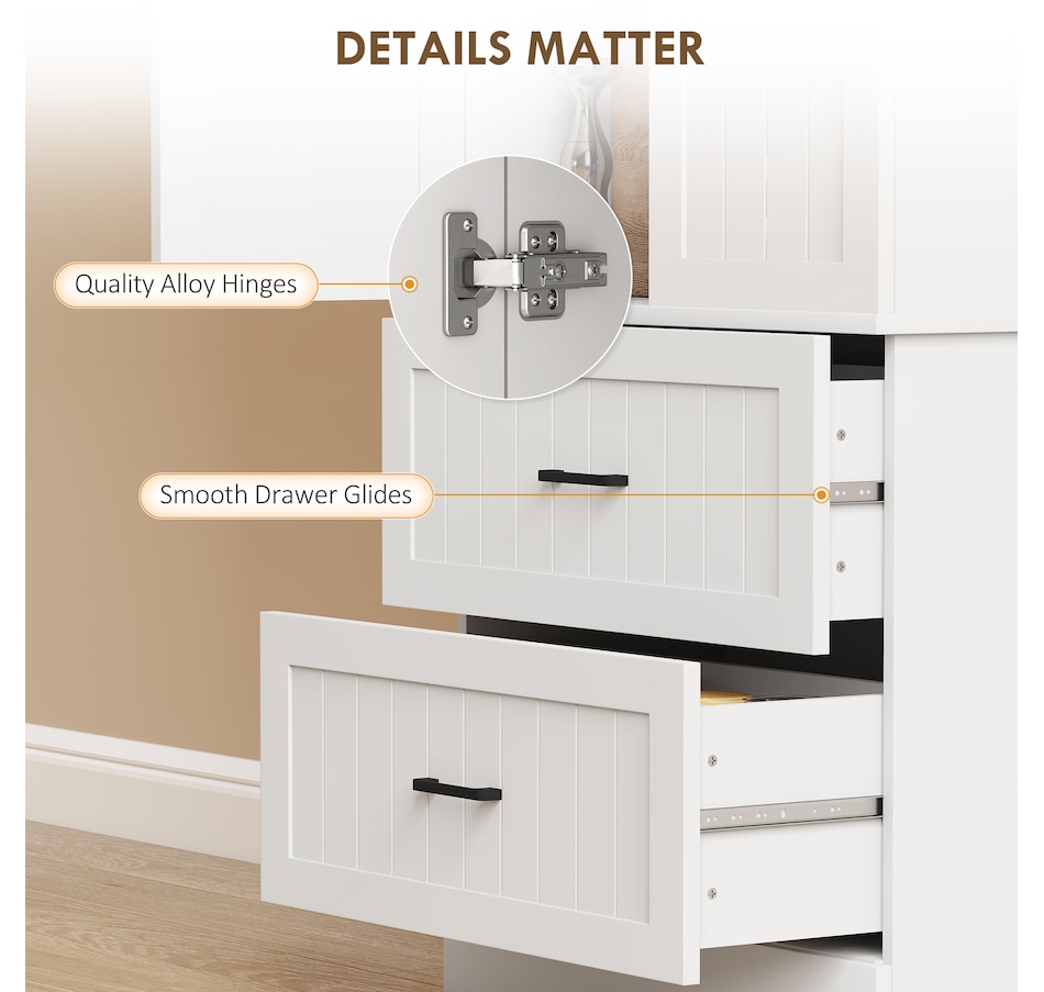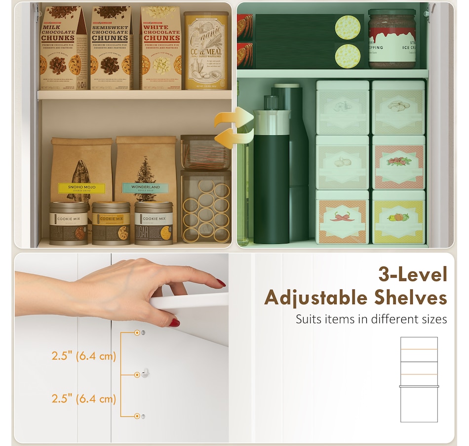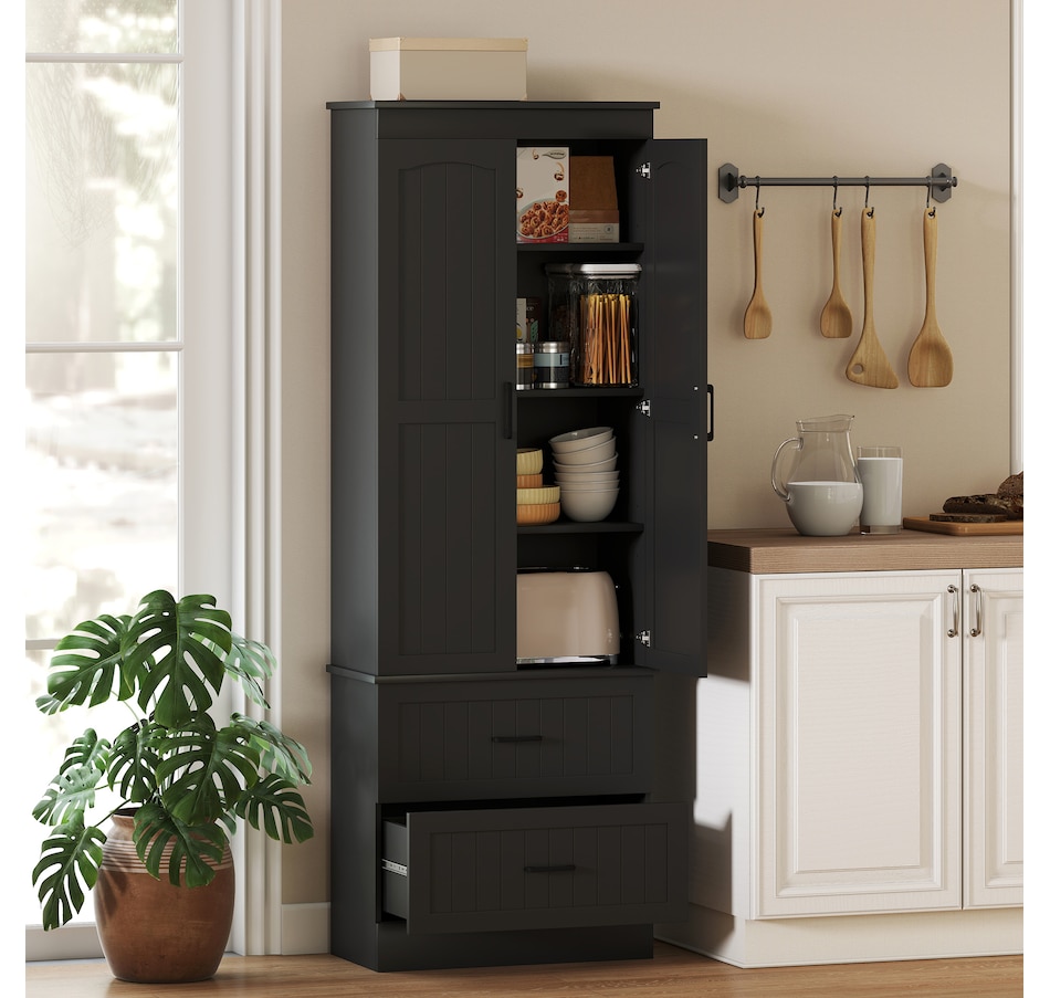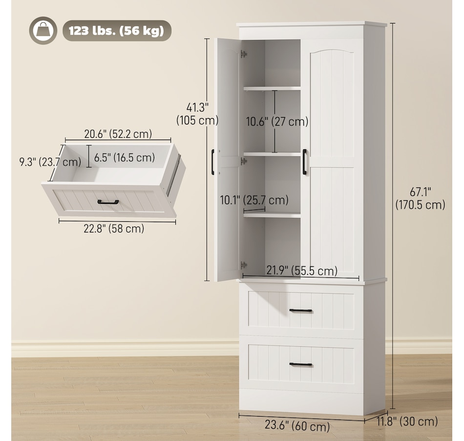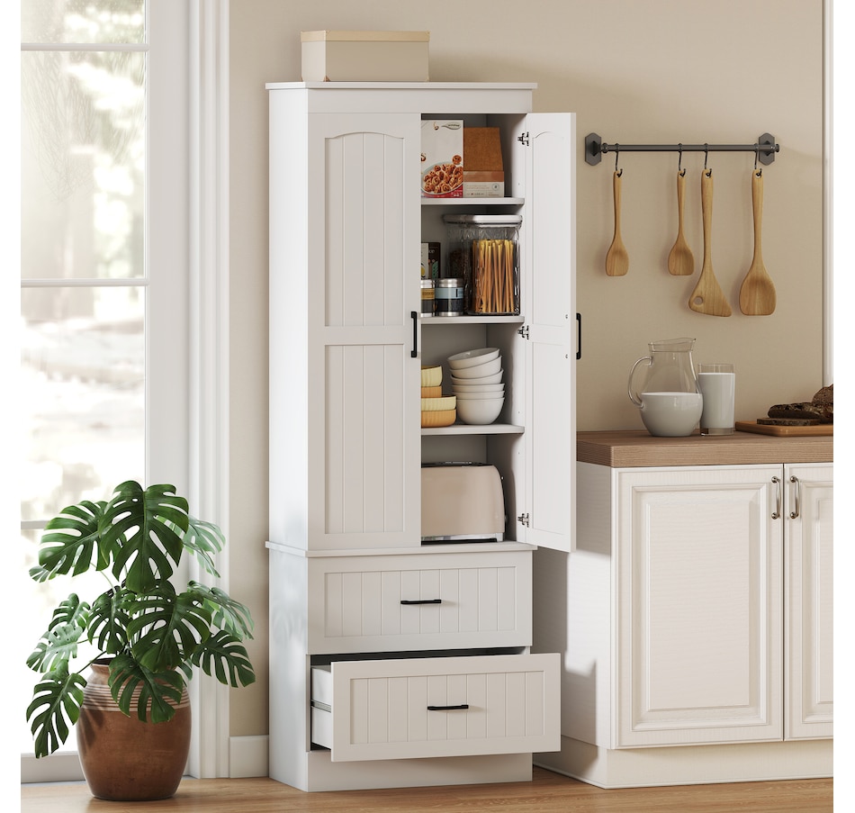 Tired of a chaotic kitchen pantry where nothing fits? The daily struggle of cramming in tall cereal boxes and the jarring sound of a drawer shattering the morning calm can be frustrating. This HOMCOM pantry cabinet restores tranquility. Its adjustable shelves create flexible space for all your items, while two drawers glide open silently. Finally, a tall cabinet that brings effortless organization and peaceful starts to your day.