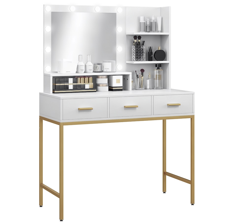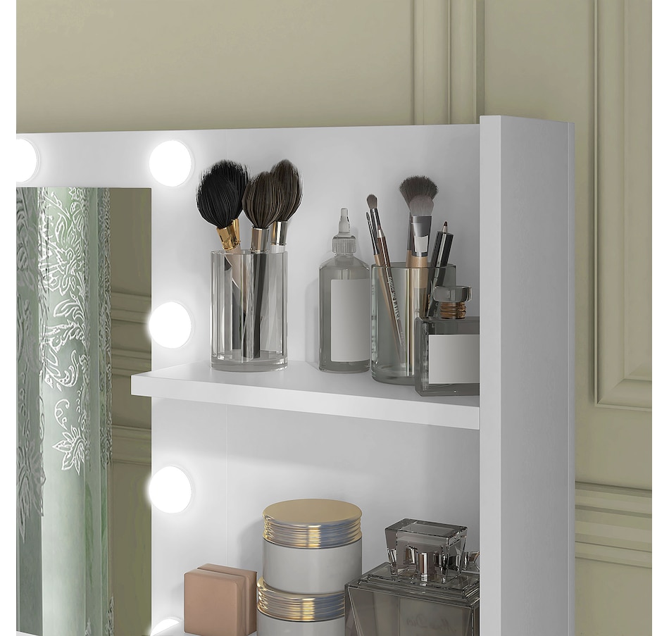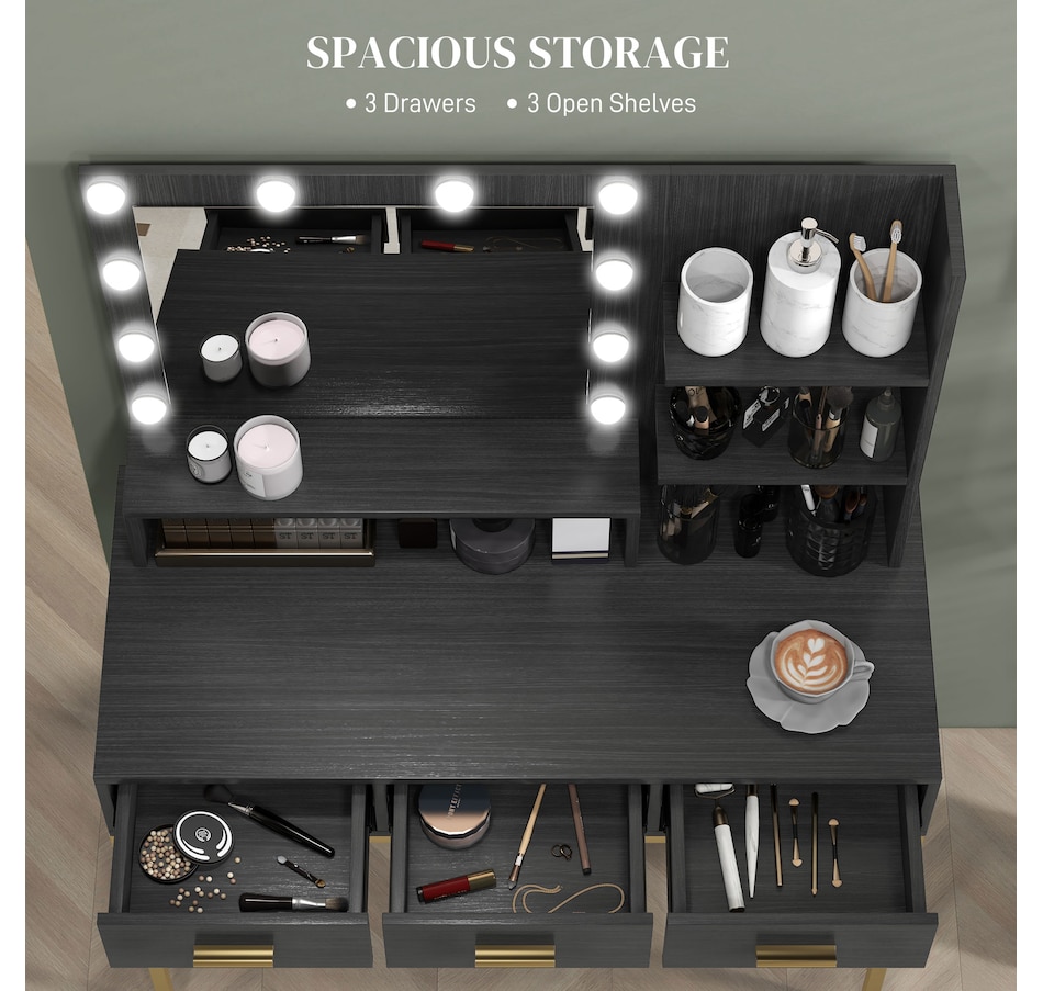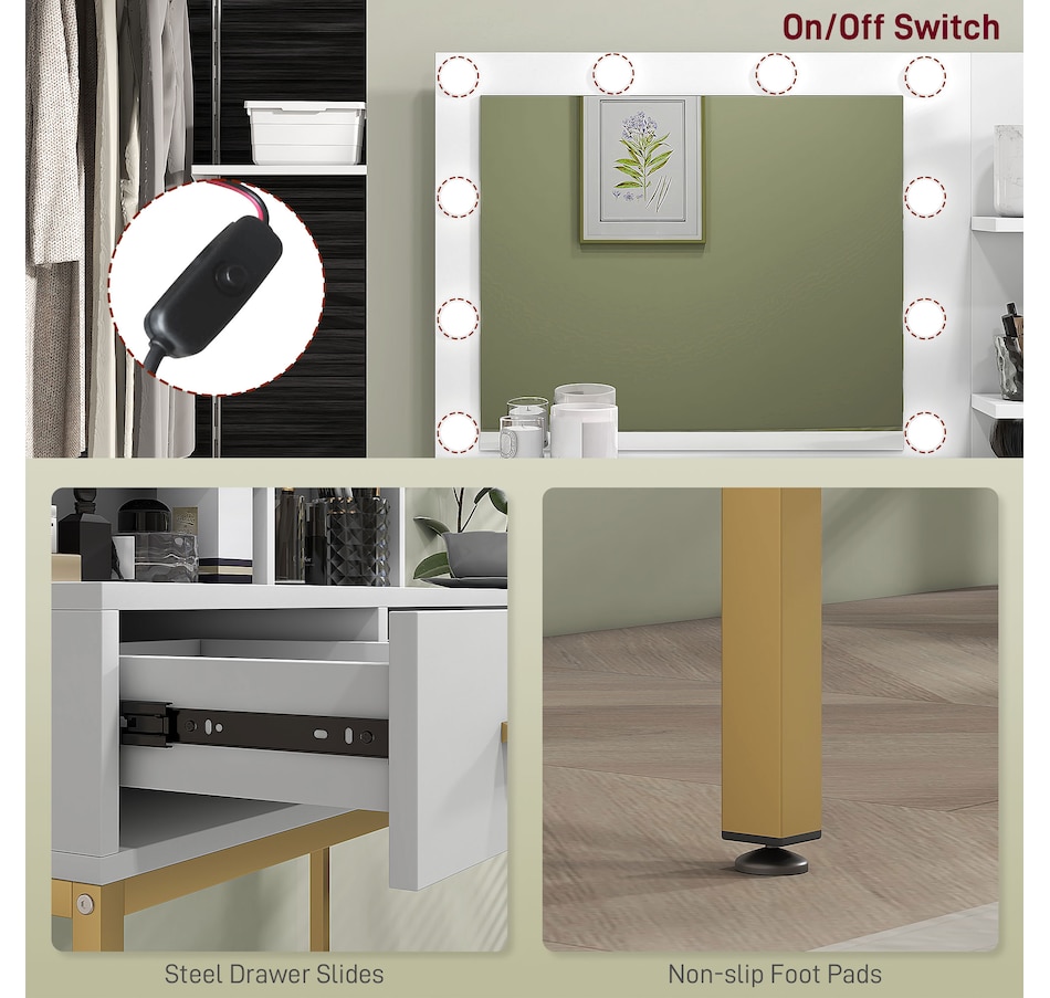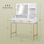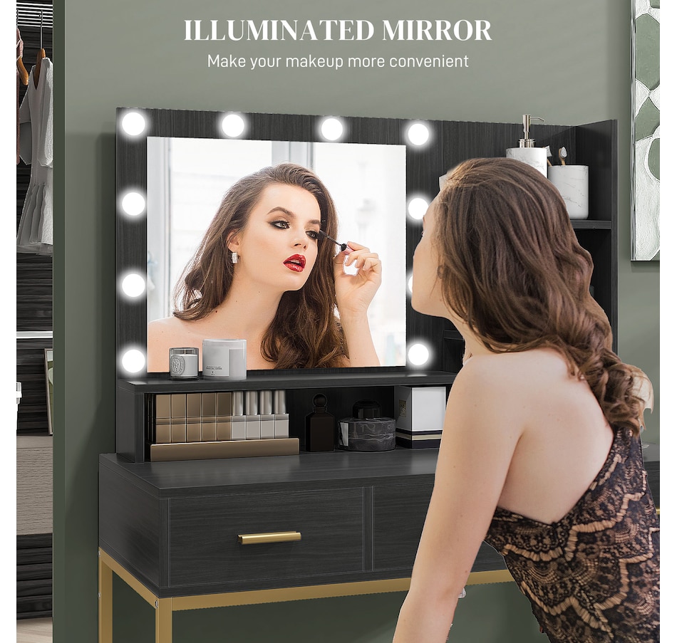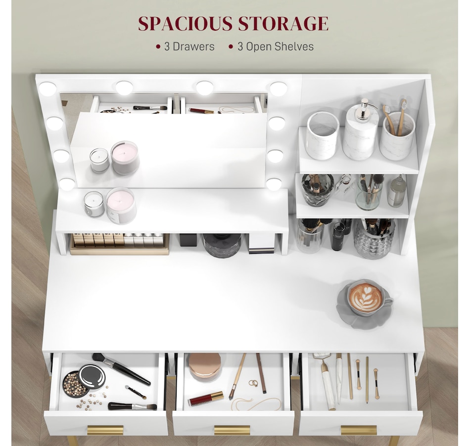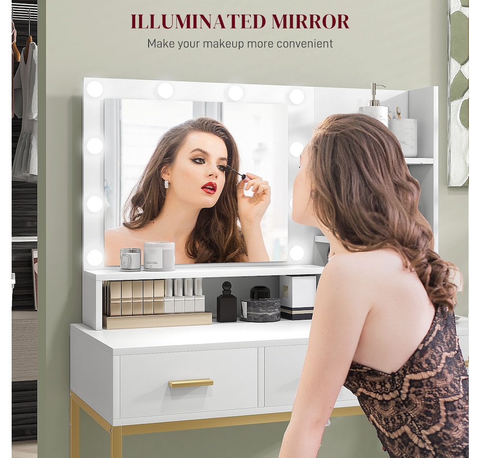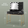 Transform your beauty routine into an enchanting experience with the HOMCOM make up table! Revel in the ample storage of three large drawers, complemented by three open shelves to showcase your perfumes and cosmetics. Add a touch of Hollywood glamour with a big, illuminated mirror, featuring 10 dazzling LED bulbs. Designed to bring elegance and ease to your bedroom or dressing space!