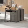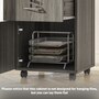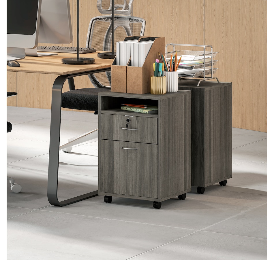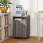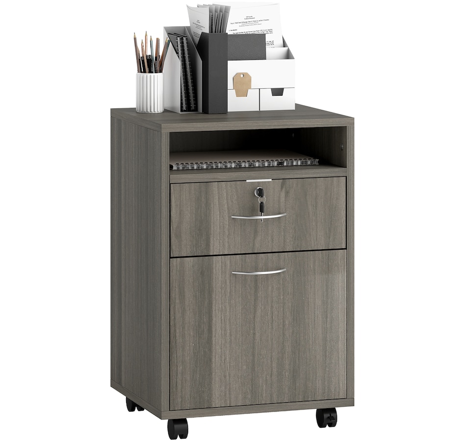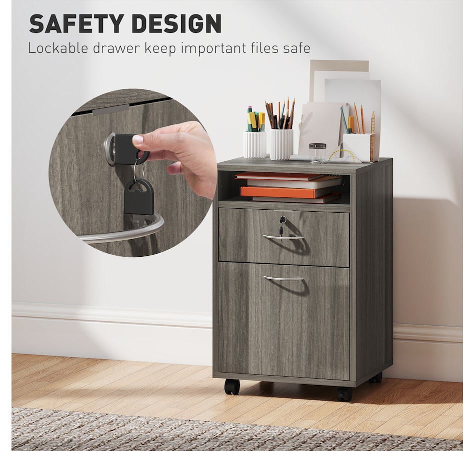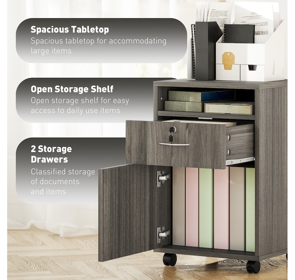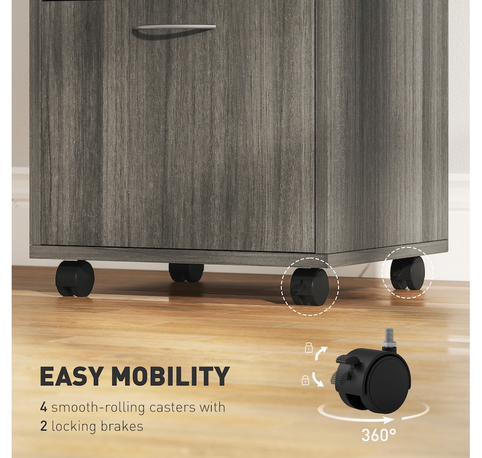 Keep your important paperwork organized, safe and secure with a mobile file cabinet. This 23.6" (60 cm) compact office storage from HOMCOM offers ample storage space and has an open shelf, drawer, and large cabinet for holding files and other important paperwork. There are 4 omnidirectional wheels, 2 have brakes for easy movement. Made of quality particle board, the mobile printer cart will not break or crack easily and can be used for years to come.Features: